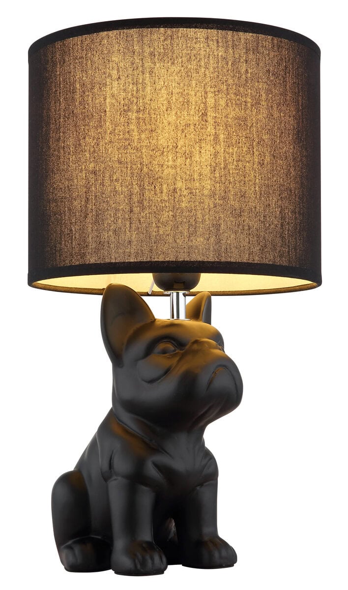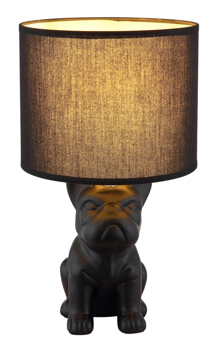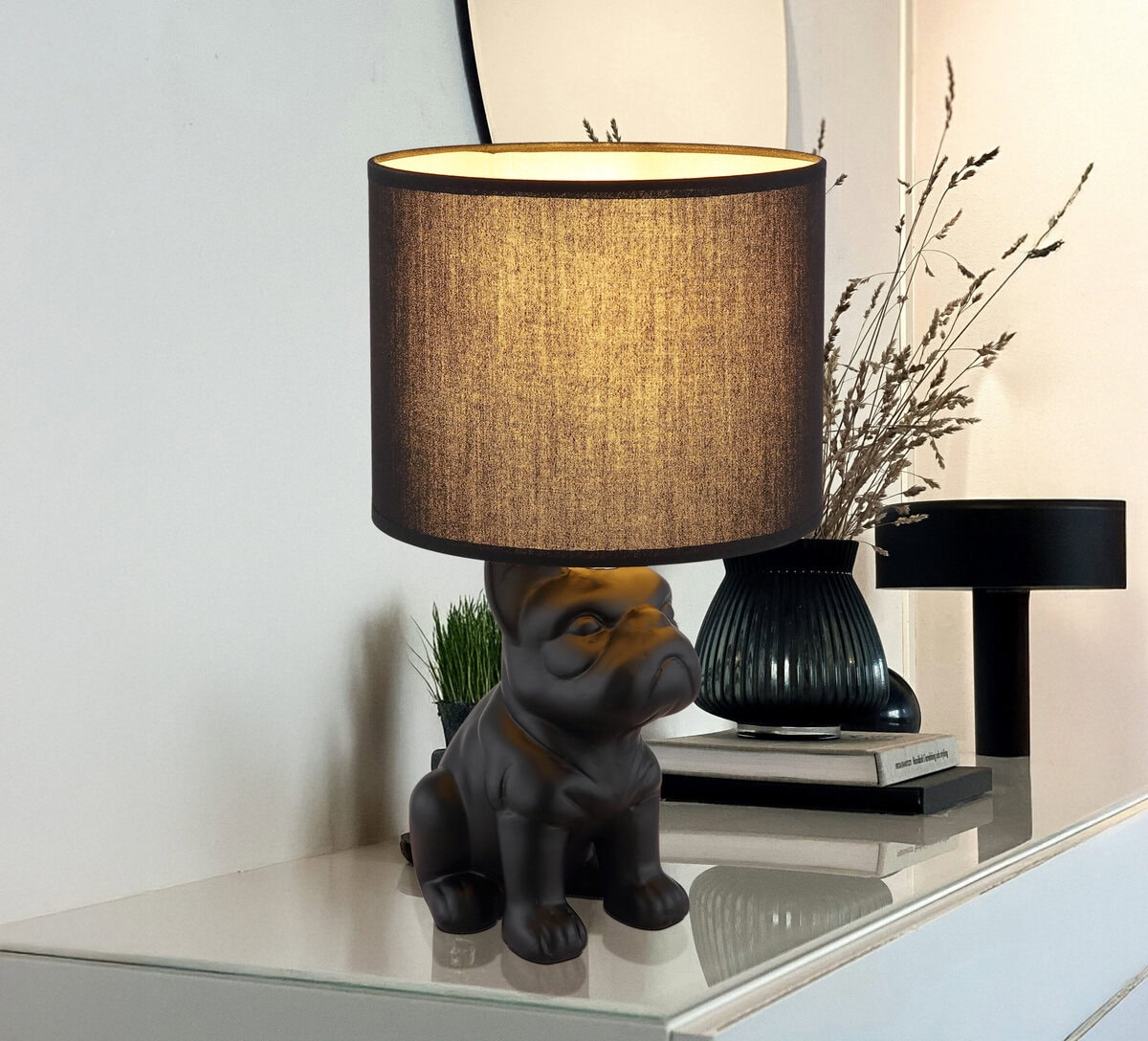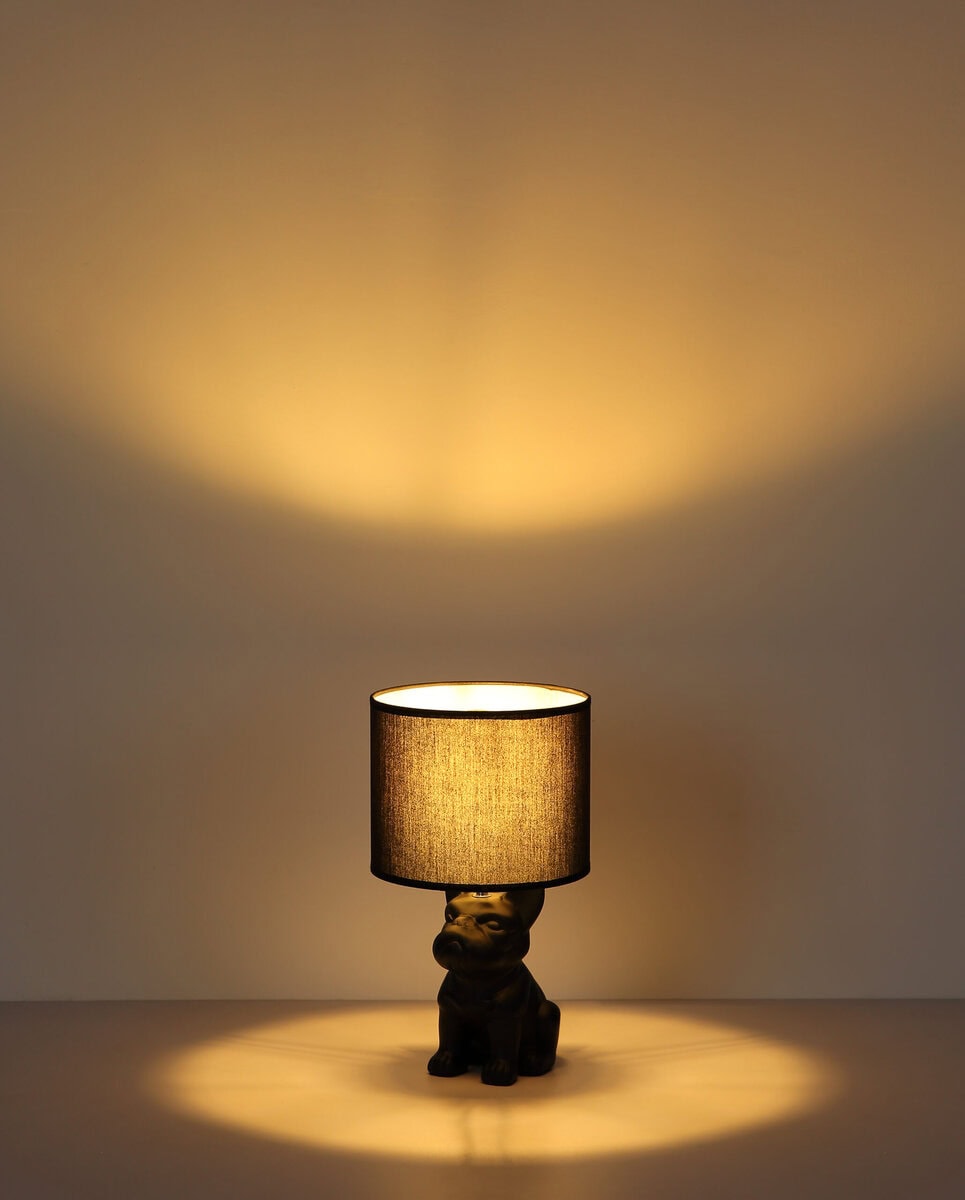 Stolna lampa DOGO kombinuje razigrani šarm sa stilskim dizajnom. Tijelo, u obliku sjedećeg francuskog buldoga i izrađeno od mat crne keramike, privlači pažnju i dodaje poseban štih svakoj prostoriji. Okrugla, crna sjenilo od tkanine stvara ugodno prigušenu svjetlosnu atmosferu i naglašava elegantan izgled lampe. Bilo na noćnom ormariću, u dnevnoj sobi ili u ulazu, DOGO nije samo izvor svjetlosti već i dekorativni element. Opremljen preklopnim prekidačem na kablu, lampa se može lako uključiti i isključiti. Opremljen je sijalicom E27 (nije uključena), što vam omogućava da individualno prilagodite boju i intenzitet svjetla. DOGO u vaš dom unosi životinjski šarm i elegantnu udobnost.