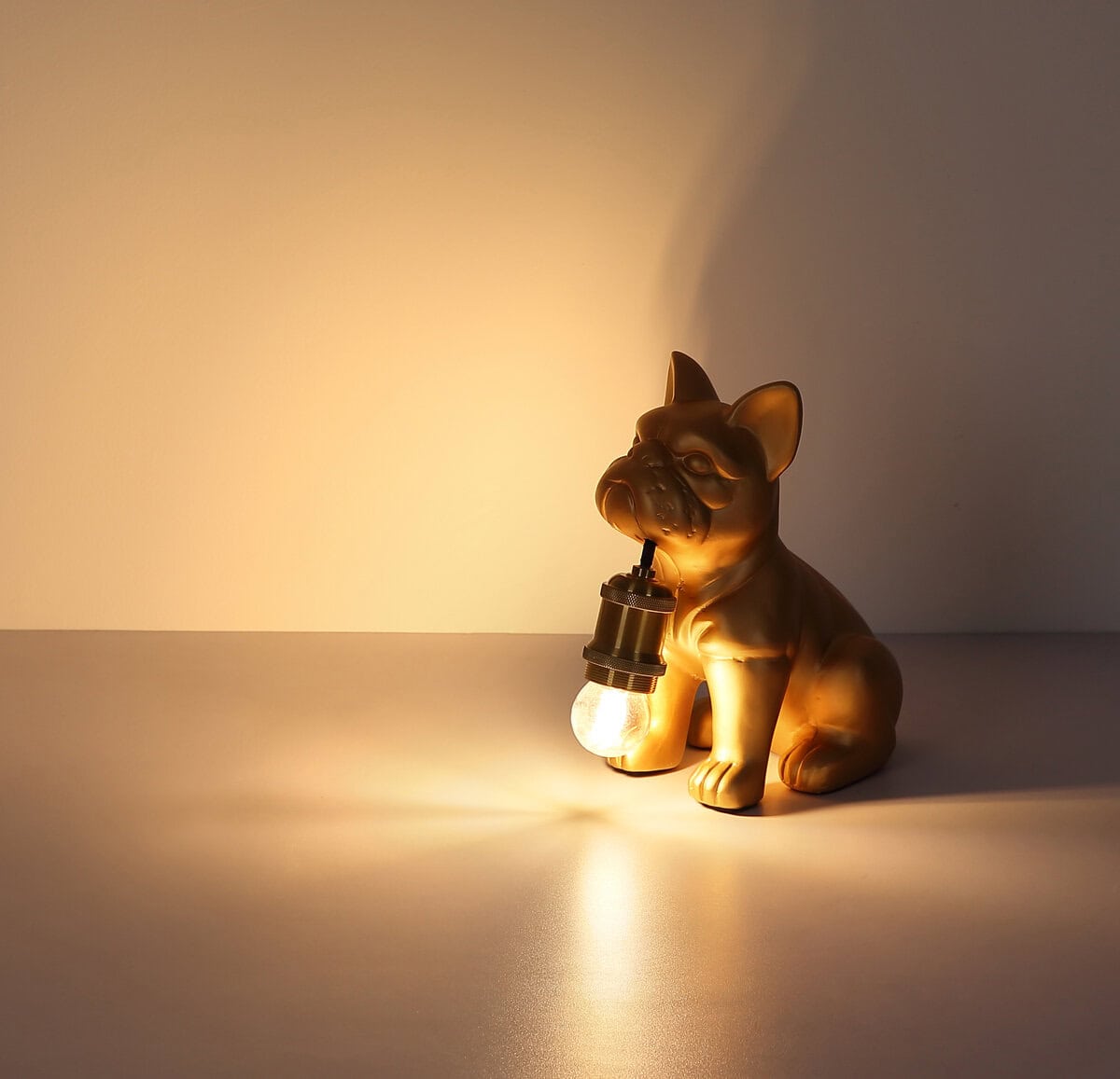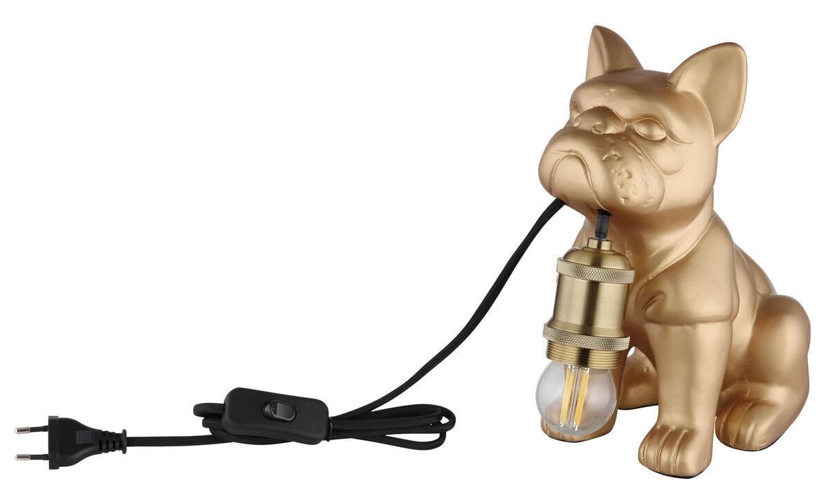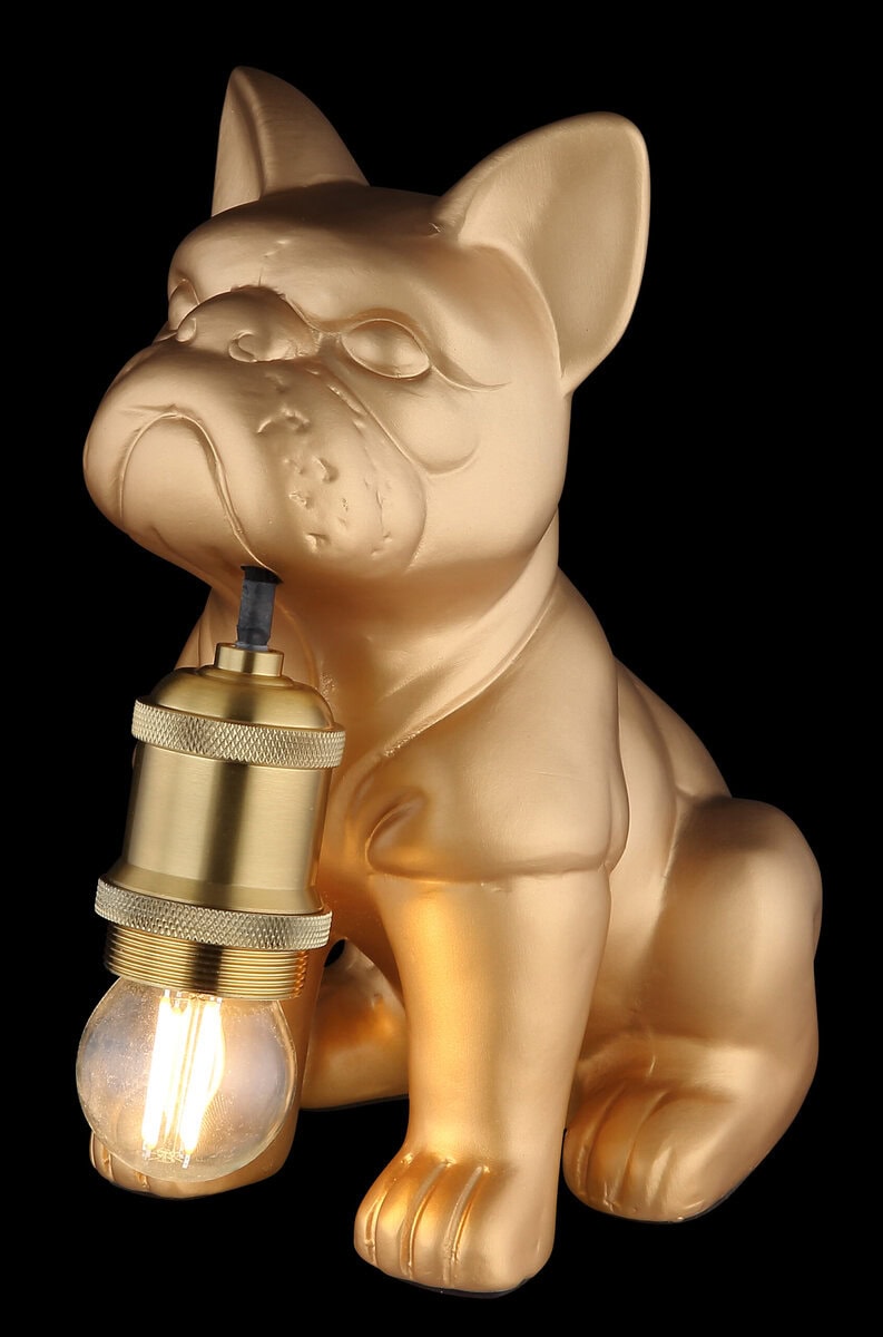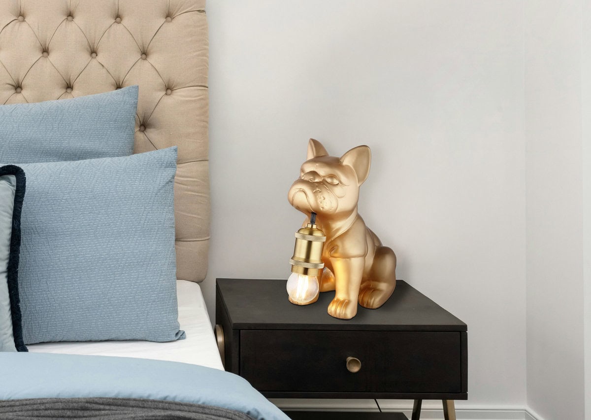 Stolna lampa DOGO KERAMIK GOLD COLOR impresionira svojim izvanrednim dizajnom, koji je istovremeno i umjetnički predmet i izvor svjetlosti. Tijelo u obliku psa koji sjedi od mat keramike zlatne boje daje lampi šarmantan, dekorativan izgled i garantovano privlači svačiju pažnju. Metalni sjenilo boje bakra usmjereno je prema dolje i osigurava ciljanu, toplu distribuciju svjetlosti – idealno za čitanje, kao dodatno osvjetljenje u atmosferi ili kao elegantan privlačan pogled na komodama, ormarićima ili noćnim ormarićima. Zahvaljujući preklopnom prekidaču na kablu, rukovanje je posebno pogodno. Lampa je opremljena grlom E27 i isporučuje se bez sijalice, tako da možete individualno podesiti boju i intenzitet svjetla. Bilo da se nalazite u dnevnoj sobi, hodniku ili spavaćoj sobi – DOGO stolna lampa unosi životinjski šarm i elegantan dizajn u vaš dom i savršena je za sve koji vole neobične kućne dodatke