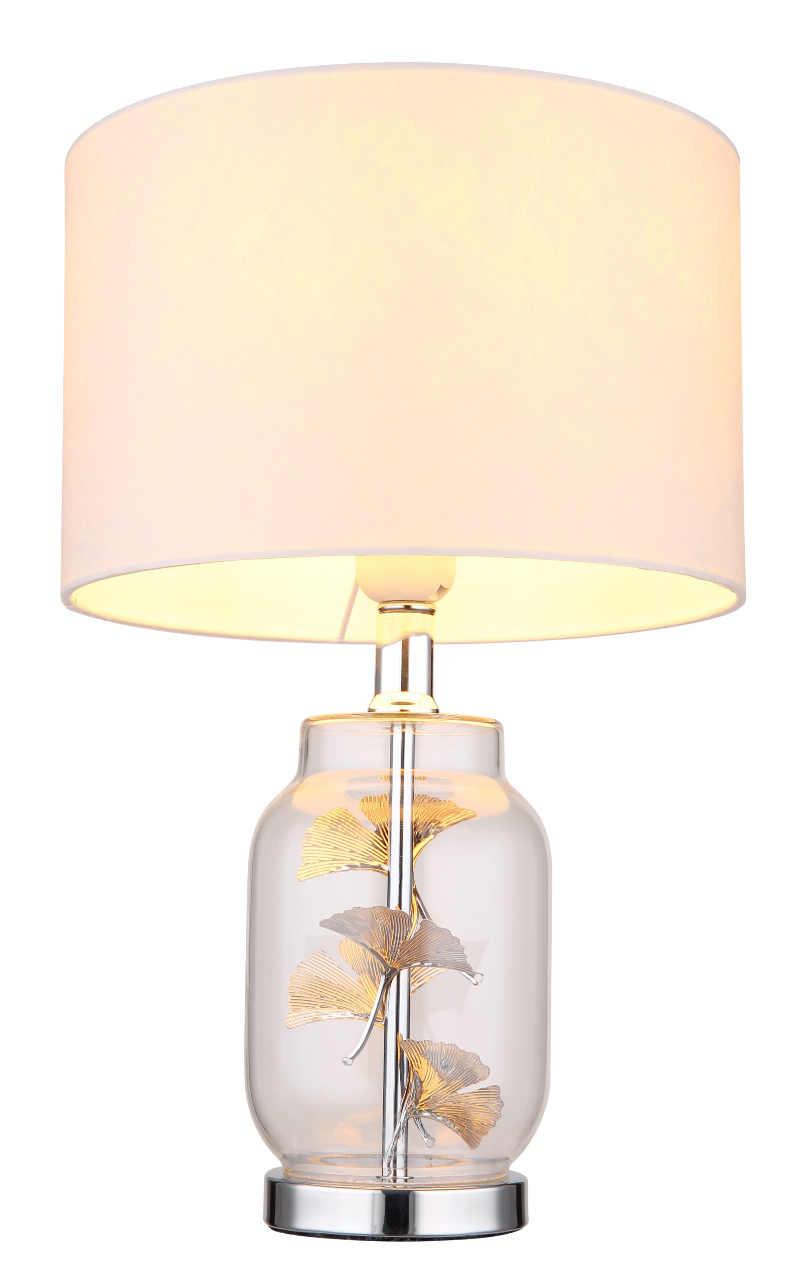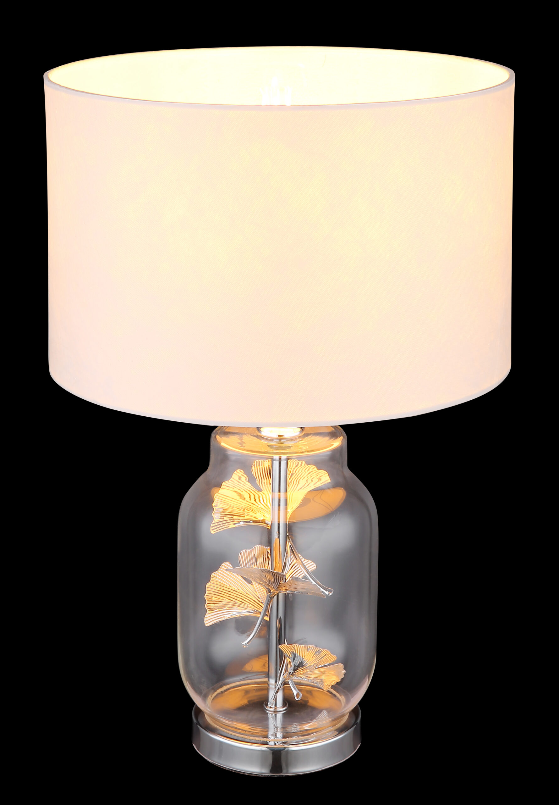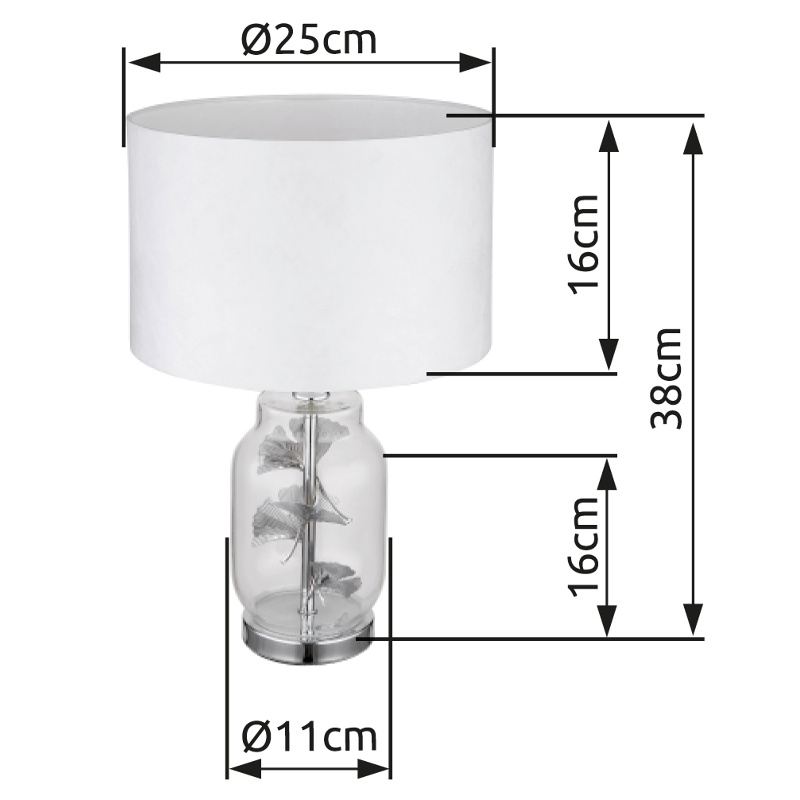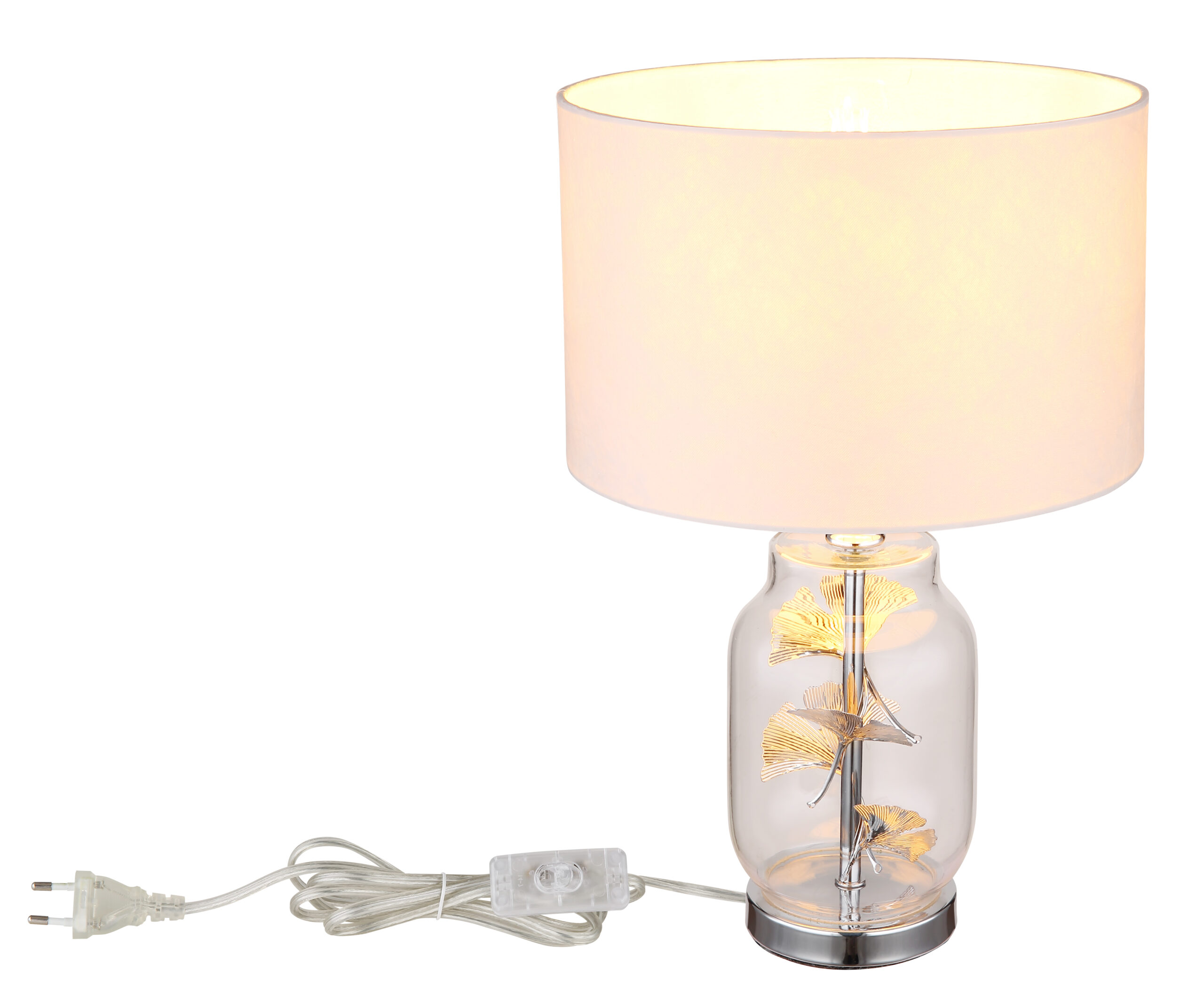 Lubučasta stolna lampa sa okruglim postoljem i unutrašnjosti od prozirnog stakla sa dizajnom listova je elegantan i moderan dodatak za svaki stol. Hromirano metalno kućište daje lampi moderan izgled, dok okrugli bijeli tekstilni sjenilo pruža ugodnu difuziju svjetlosti. Plastični elementi u bijeloj boji skladno zaokružuju dizajn. Sa preklopnim prekidačem na kablu, rukovanje svetiljkom je jednostavno i praktično. Prečnik lampe je 250mm i nudi snagu od 40W sa E27 grlom, što obezbeđuje dovoljno osvetljenja u vašem životnom prostoru. Ova stolna lampa nije samo efikasan izvor svjetlosti, već i dekorativni element koji će vašem domu dodati moderan štih.