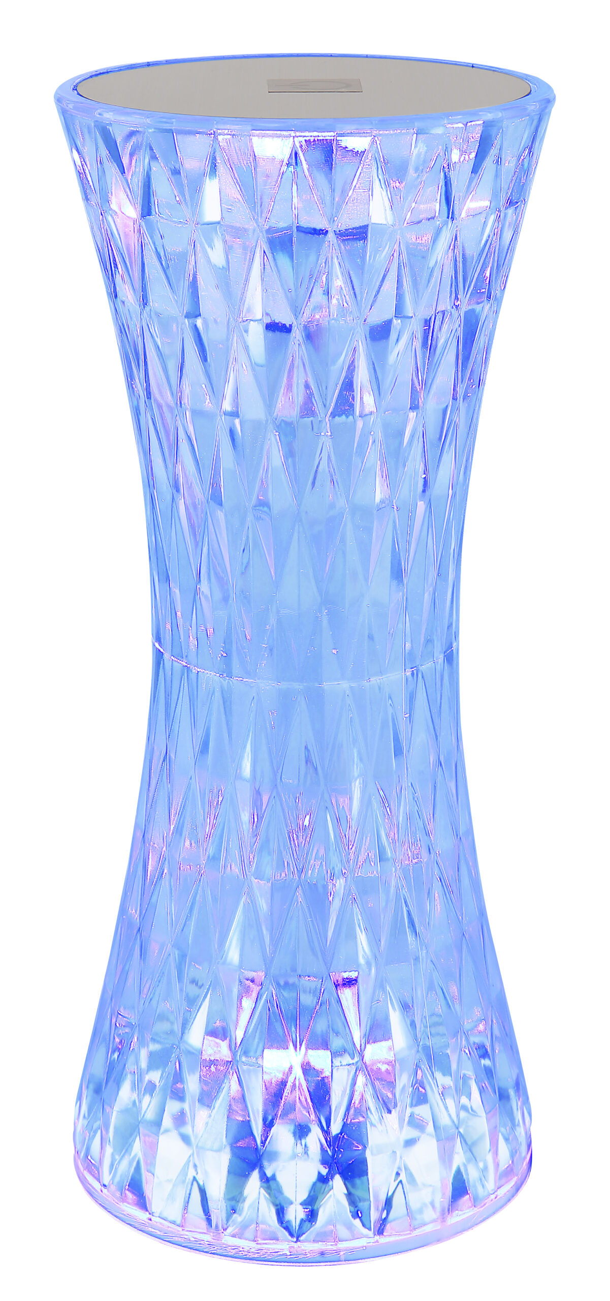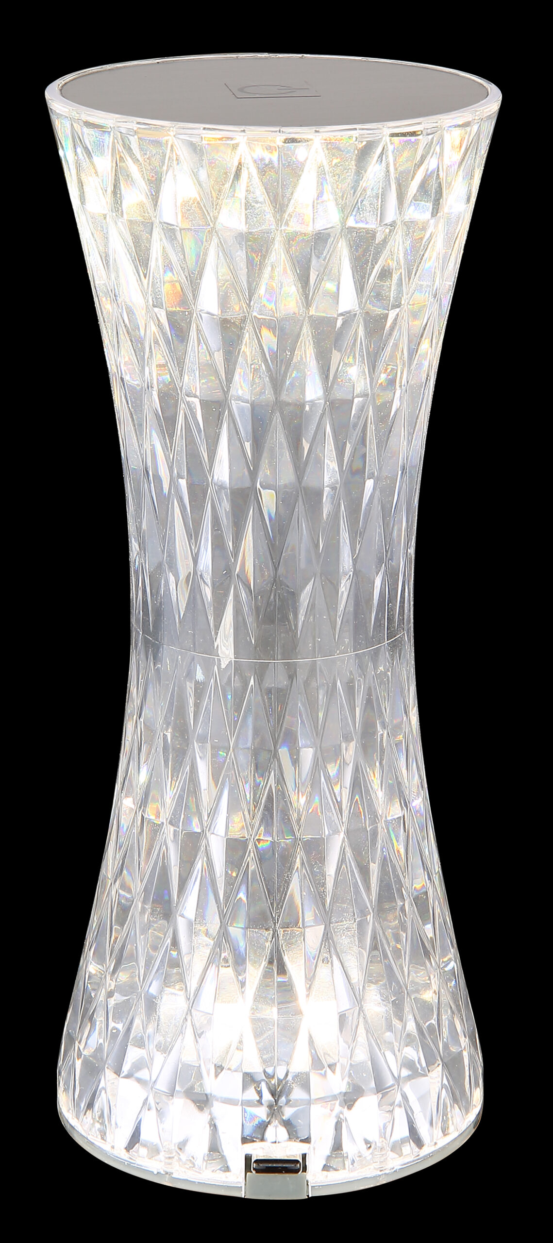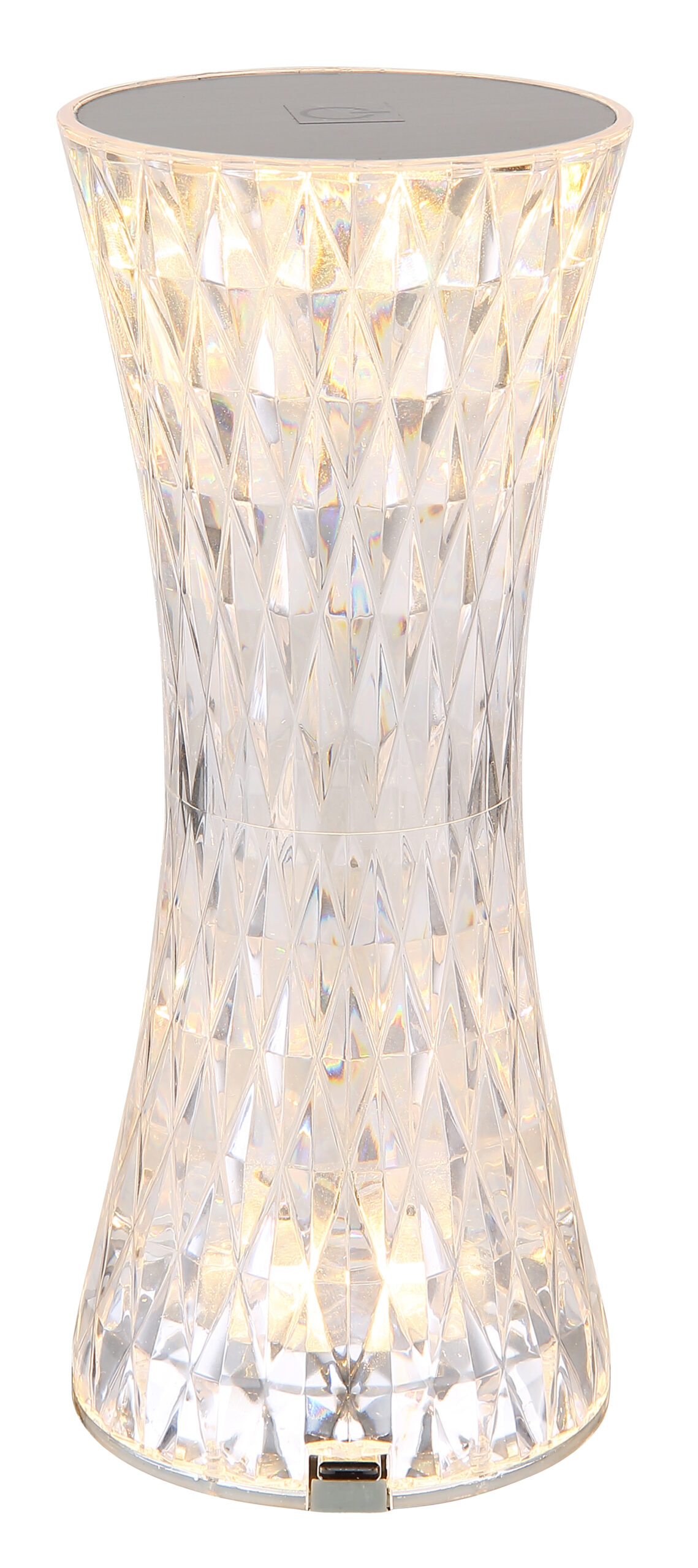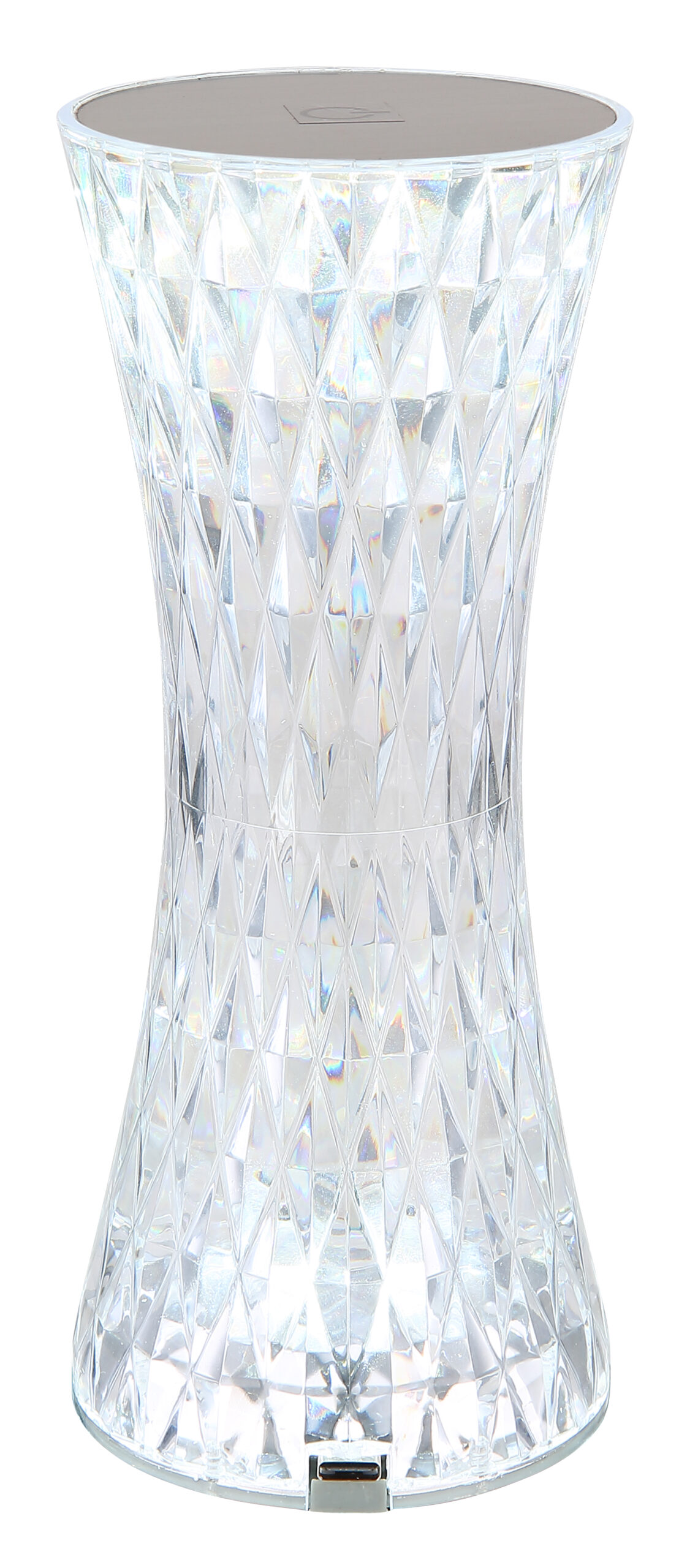 Stona lampa od prozirne plastike i blistavog kristalnog efekta od metala srebrne boje privlači poglede u svakoj prostoriji. Sa bijelim PVC kablom i praktičnim prekidačem za uključivanje/isključivanje na dodir, osvetljenje se može lako kontrolisati. Osim toga, svjetiljka ima RGB izmjenjivač boja, koji omogućava odabir i fiksiranje različitih boja. RGB boje se mogu lako odabrati dodirom. Baterija (800mAh 3.7V) nudi vrijeme gorenja do 6 sati i može se napuniti za samo oko 4 sata. Stolna lampa se može koristiti i tokom punjenja. Opremljen RGBW LED 1,5W, svetiljka pruža jako svetlo u različitim bojama. USB kabl dužine 800 mm je uključen, adapter se mora kupiti posebno.