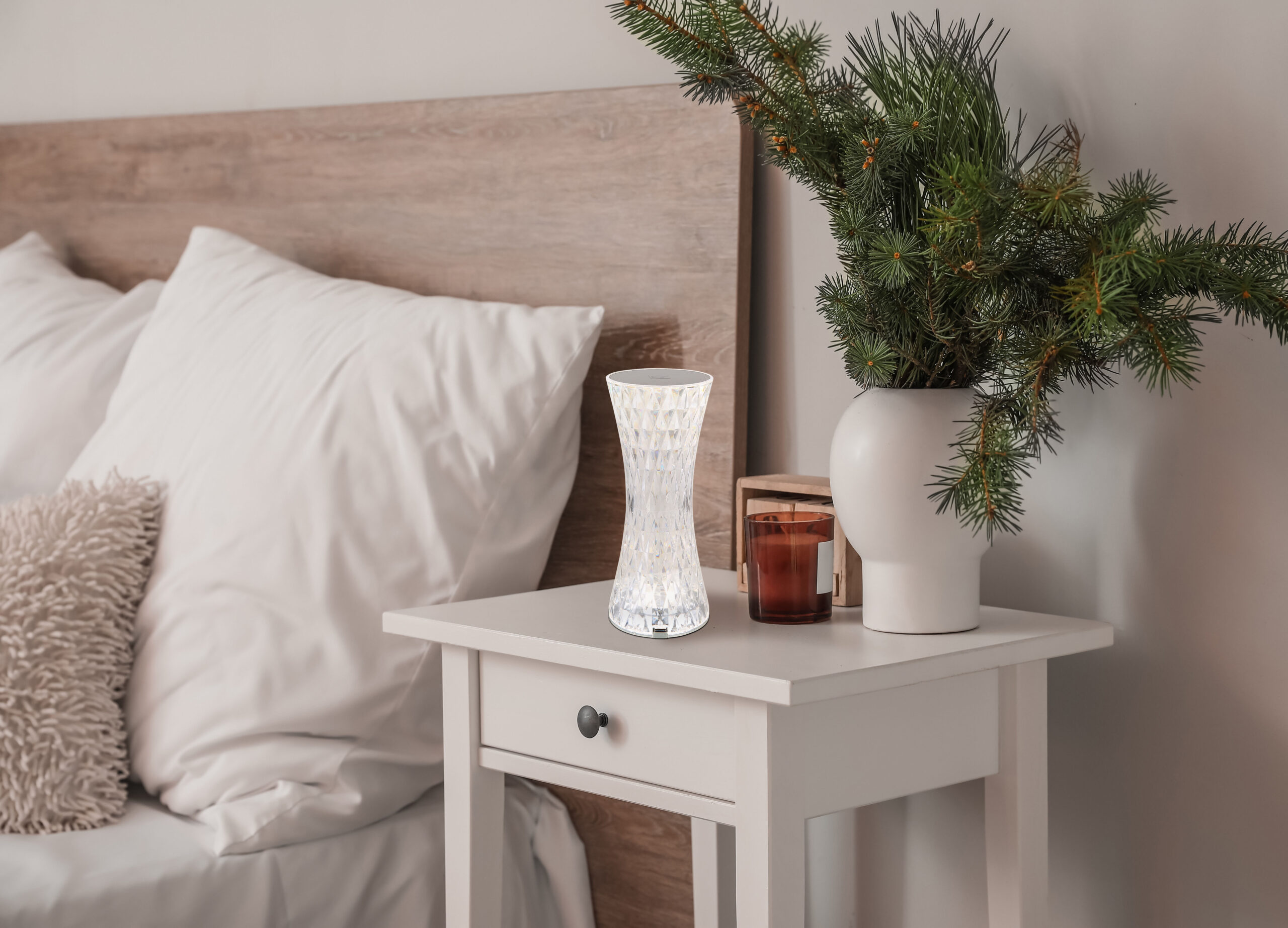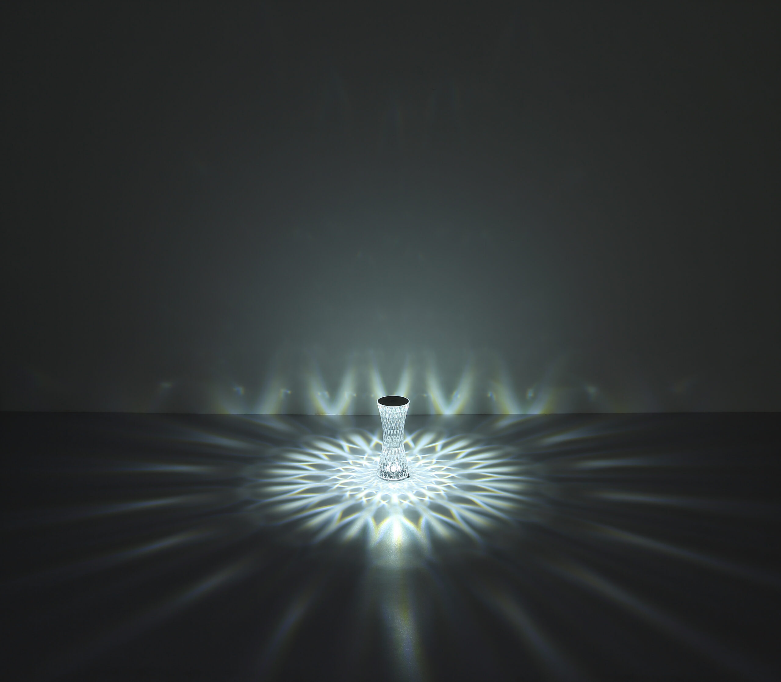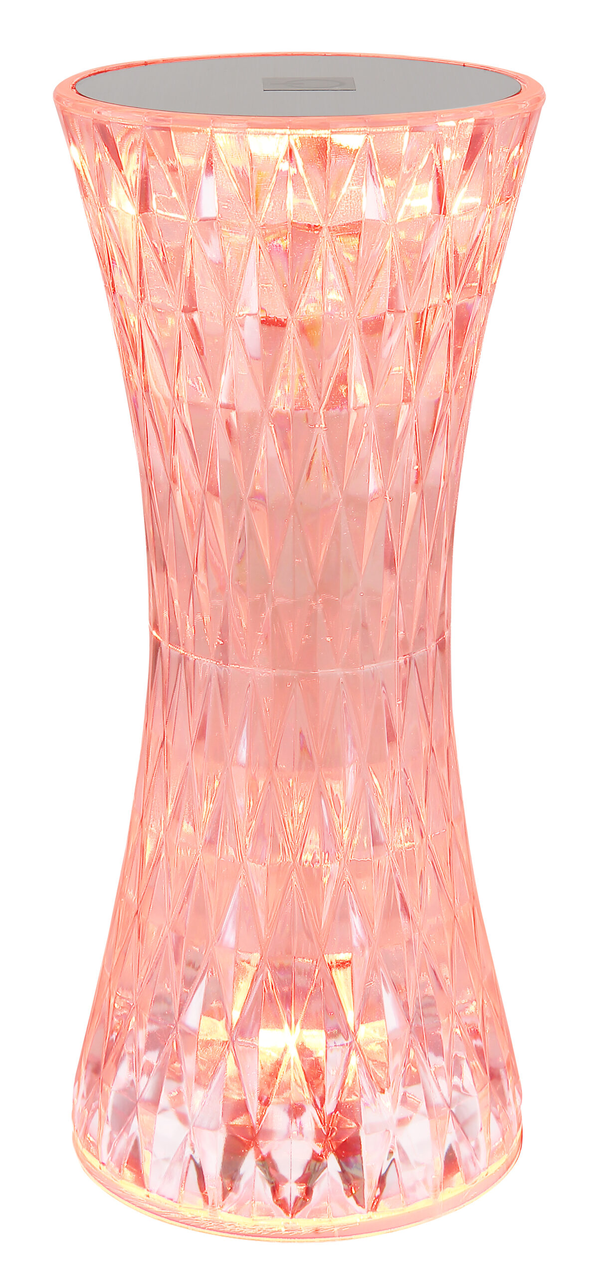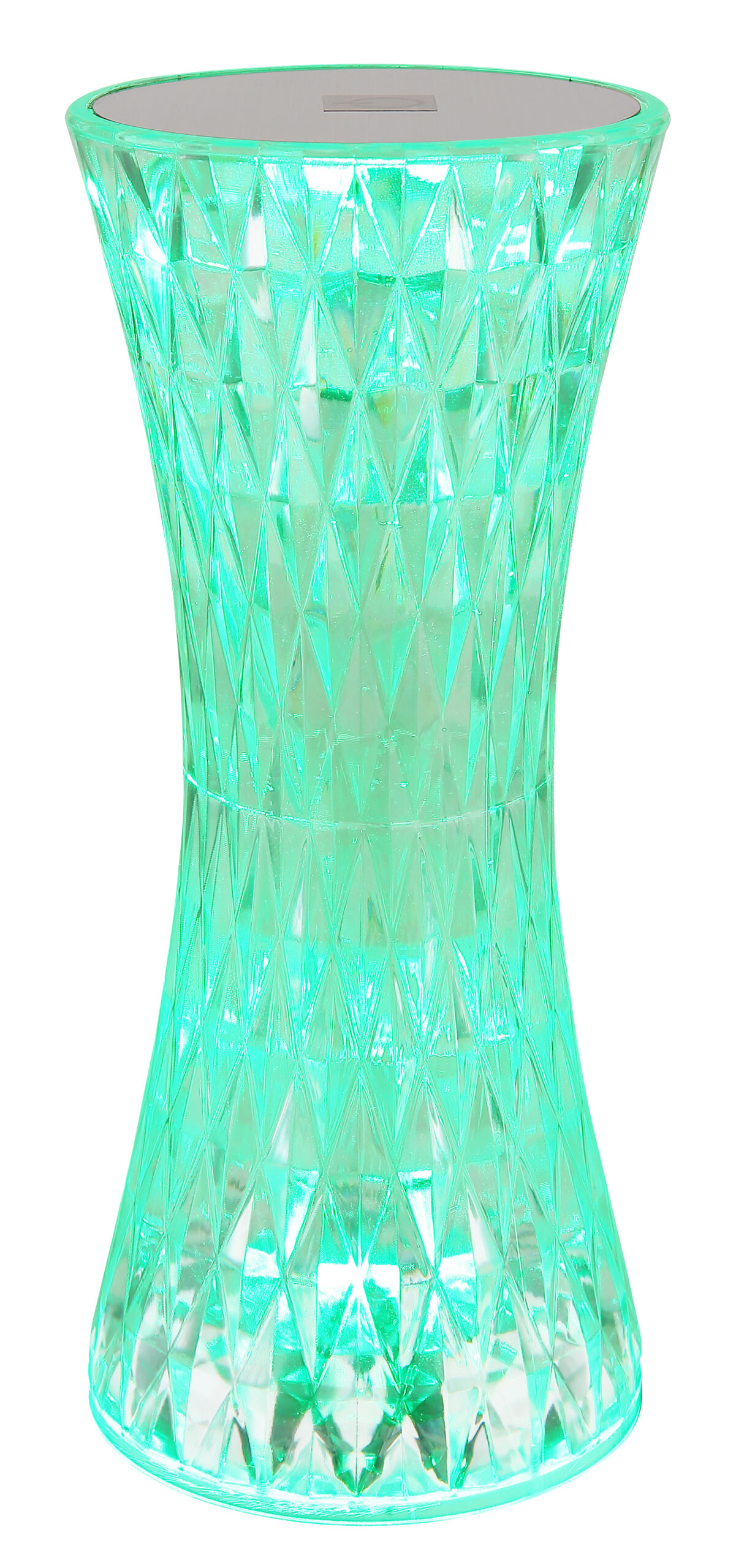 Stona lampa od prozirne plastike i blistavog kristalnog efekta od metala srebrne boje privlači poglede u svakoj prostoriji. Sa bijelim PVC kablom i praktičnim prekidačem za uključivanje/isključivanje na dodir, osvetljenje se može lako kontrolisati. Osim toga, svjetiljka ima RGB izmjenjivač boja, koji omogućava odabir i fiksiranje različitih boja. RGB boje se mogu lako odabrati dodirom. Baterija (800mAh 3.7V) nudi vrijeme gorenja do 6 sati i može se napuniti za samo oko 4 sata. Stolna lampa se može koristiti i tokom punjenja. Opremljen RGBW LED 1,5W, svetiljka pruža jako svetlo u različitim bojama. USB kabl dužine 800 mm je uključen, adapter se mora kupiti posebno.