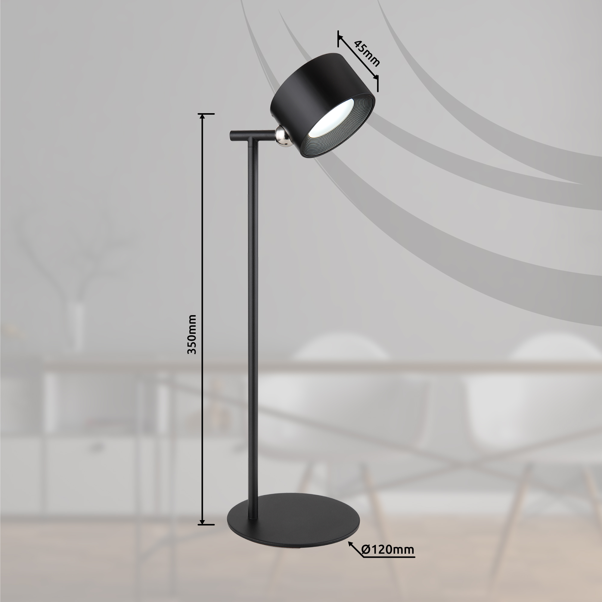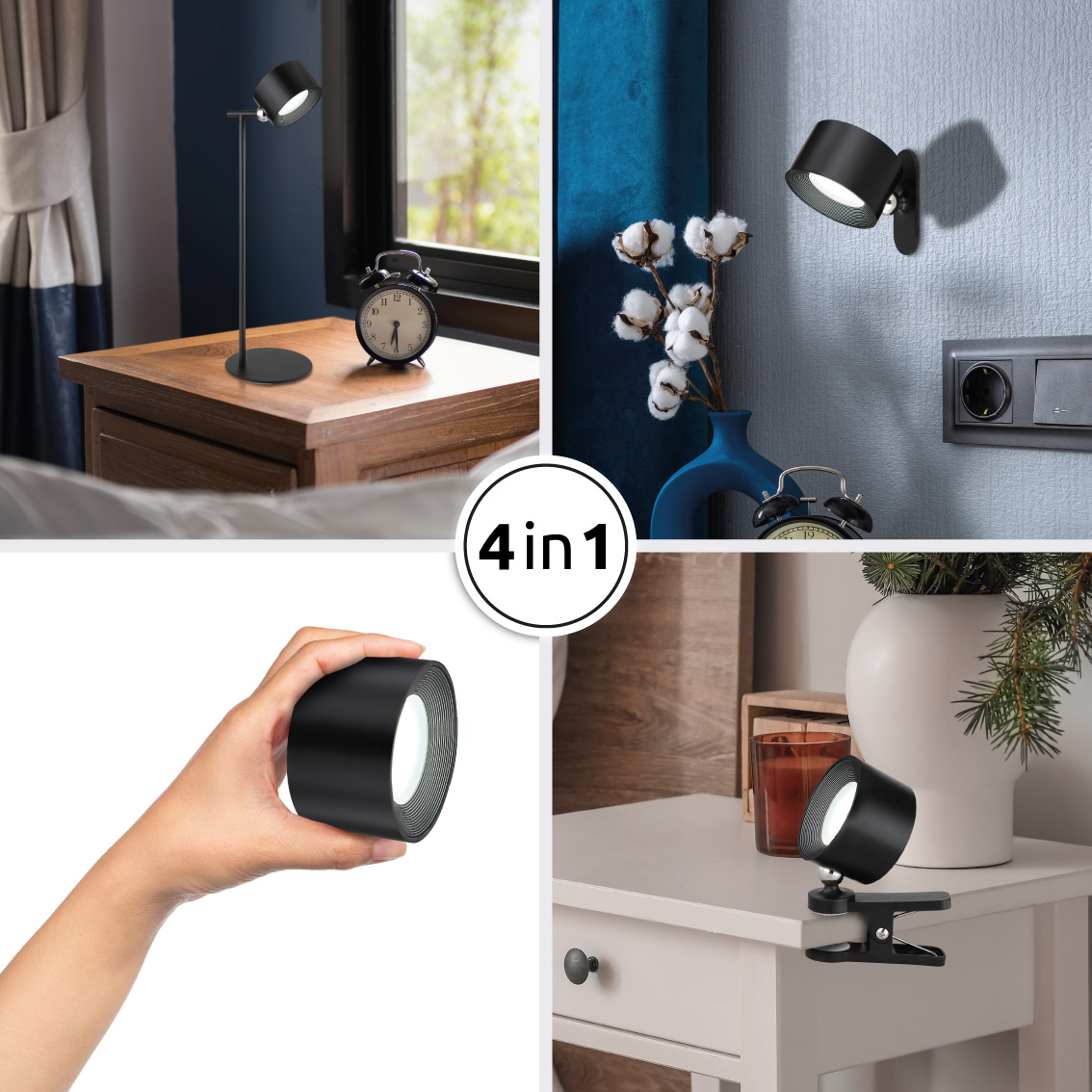 Stolna lampa JORJE uvjerava svojim elegantnim dizajnom od mat crnog metala i mat crne plastike. Satenski plastični materijal osigurava ugodnu distribuciju svjetlosti. Sa praktičnim prekidačem za uključivanje/isključivanje na dodir i prigušivačem na dodir, osvetljenost se može podesiti pojedinačno. Osim toga, svjetiljka ima opciju fiksiranja boja i memorijsku funkciju koja pohranjuje posljednju podešenu svjetlinu. Baterija tipa CR18650, kapaciteta 1200mAh i 5V, nudi vrijeme rada od 6 sati i može se jednostavno puniti putem priloženog USB kabla. Stona lampa JORJE nudi četiri različite mogućnosti montaže sa magnetima: kao baterijsku lampu, kao stonu lampu, sa kopčom ili za zidnu montažu. Dužina kabla je 1000 mm, a LED sa 4,5 W snage i izlaznom snagom od 120 lm vam omogućava da birate između tri različite opcije svetla (3000/4000/5000K). USB kabl je uključen, adapter se mora kupiti posebno.