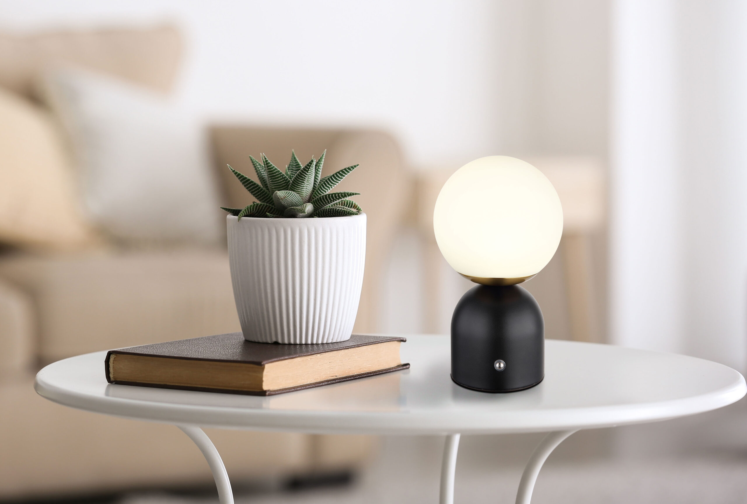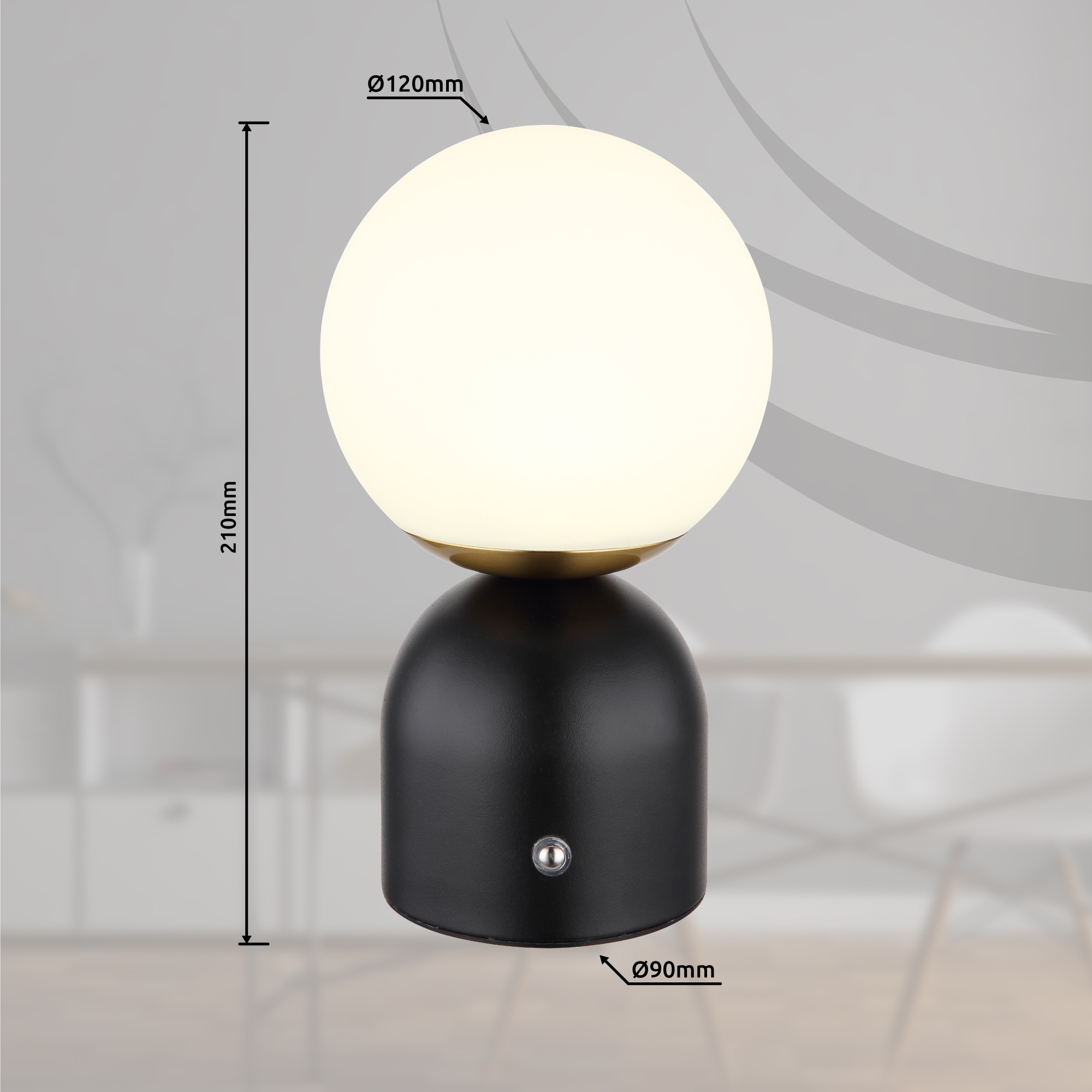 Naša moderna stolna lampa kombinuje elegantan crni mat metal sa elegantnom površinom u boji mesinga i opal plastikom. Pomoću praktičnog prekidača za uključivanje/isključivanje na dodir možete lako upravljati svjetiljkom, a pomoću beskonačnog prigušivača na dodir možete podesiti svjetlinu po želji. Boja se može popraviti prema vašim željama. Ugrađena CR18650 baterija od 1800mAh omogućava do 6 sati rada i može se napuniti za samo 4 sata. Sa prečnikom od 120 mm, lampa se savršeno uklapa na svaki sto. Velika dužina kabla je 500 mm, a svetiljka ima LED diodu za uštedu energije sa snagom od 2,5 W, izlaznom snagom od 189 lm i tri različite temperature boje (2700/6500/4000K) za individualnu atmosferu. USB kabl za punjenje je uključen, odgovarajući adapter se mora kupiti posebno.