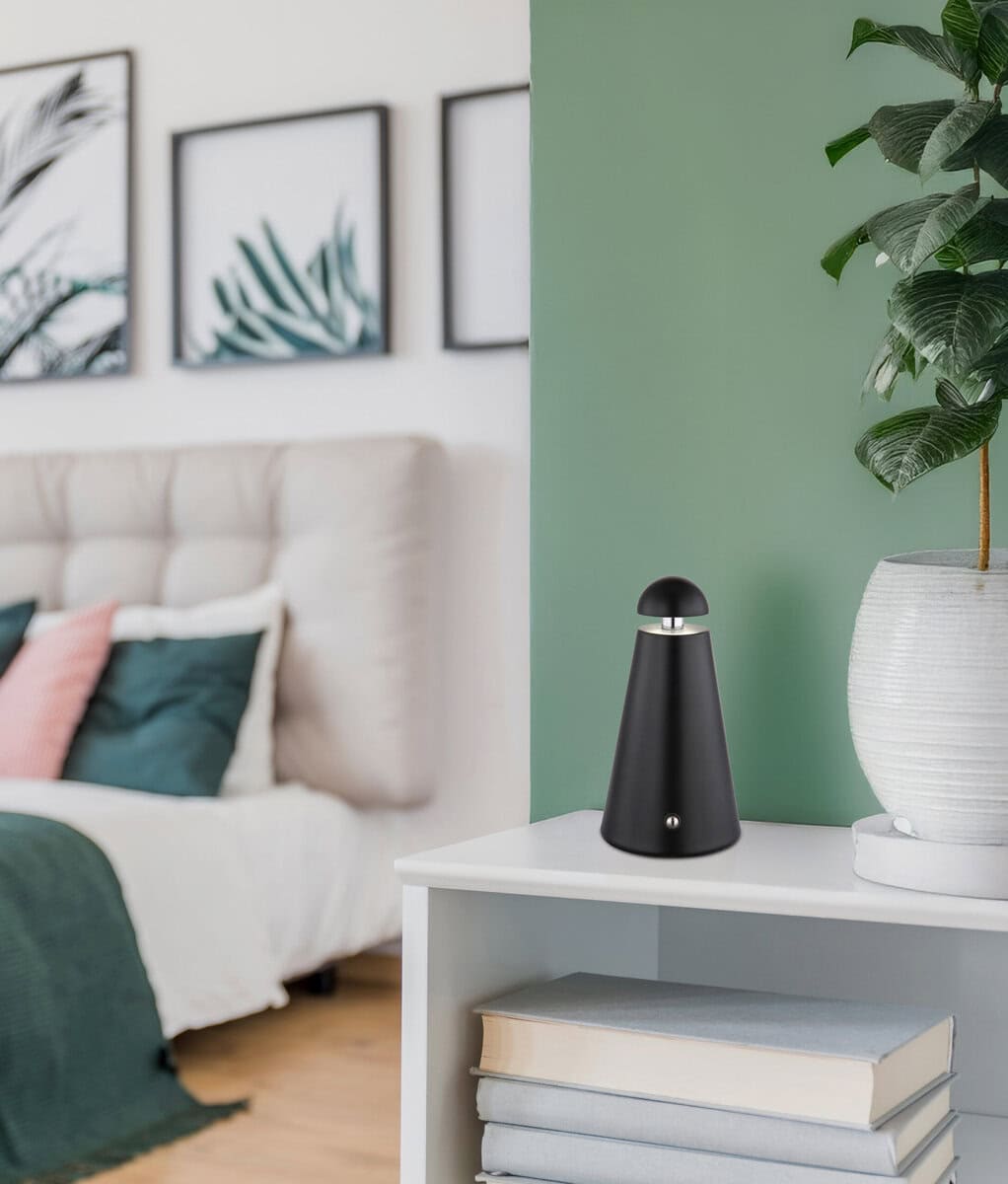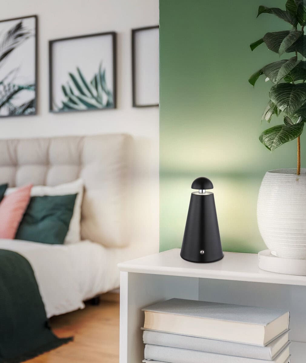 Stolna lampa LIVA impresionira svojim modernim, okruglim i konusnim dizajnom u elegantnom mat crnom metalu. Sa prečnikom od 90 mm, savršeno se uklapa na svaki sto i stvara ugodnu atmosferu osvetljenja. Opremljena beskonačnim prigušivačem na dodir, temperatura boje se može fleksibilno podešavati i fiksirati između 6000 K i 4500 K. Lampa daje 80 lumena, pružajući dovoljnu svjetlinu za ugodne večeri ili fokusiran rad. Rukovanje je jednostavno putem dodira On/Off. Zahvaljujući ugrađenoj bateriji, lampa se pali tokom punjenja, koje traje oko 4 sata. Nakon potpunog punjenja, osigurava otprilike 6 sati svjetla. Obim isporuke uključuje adapter i USB kabl za punjenje. Integrirani LED osigurava energetski učinkovito osvjetljenje i dug radni vijek.