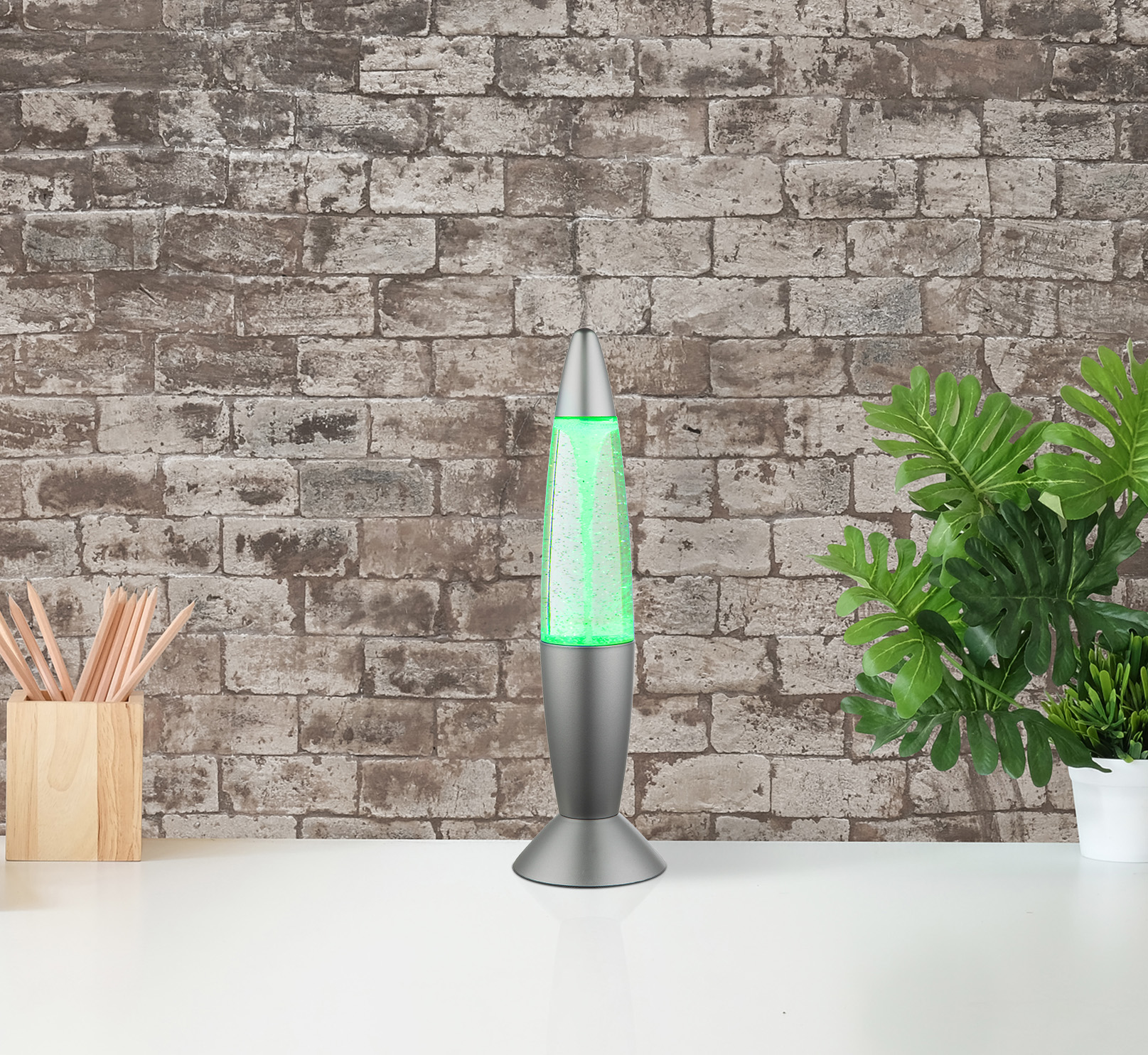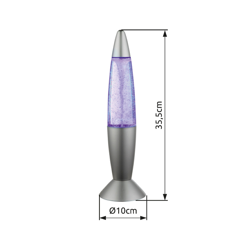 Ova stolna lampa je dobra opcija za dekoraciju. Unutar srebrno sive i prozirne plastike vrti se vihor. Lampa radi na baterije (3xAA) ili na adapter, što je čini vrlo fleksibilnom. Lampa od 35,5 cm se može uključiti i isključiti preko prekidača, ali se mogu mijenjati i boje.
