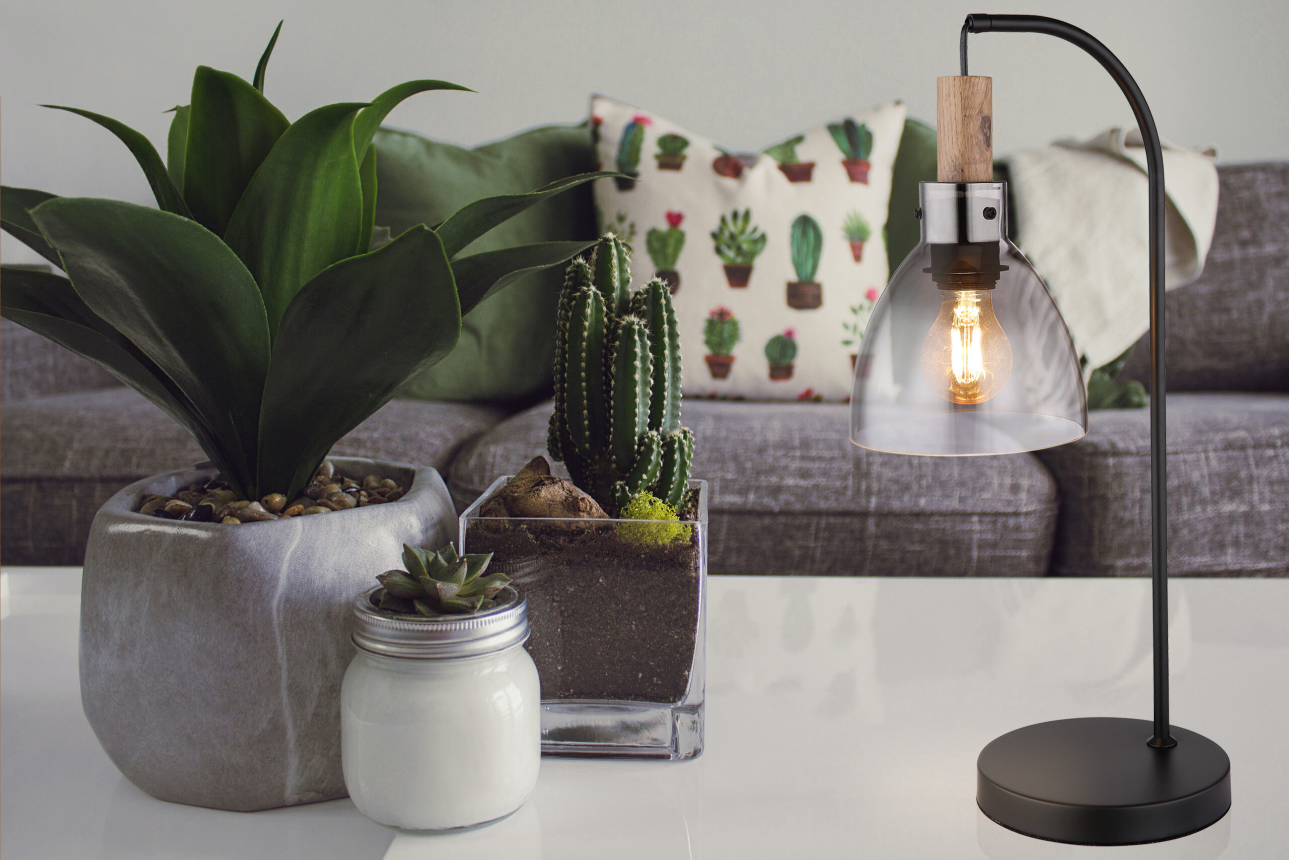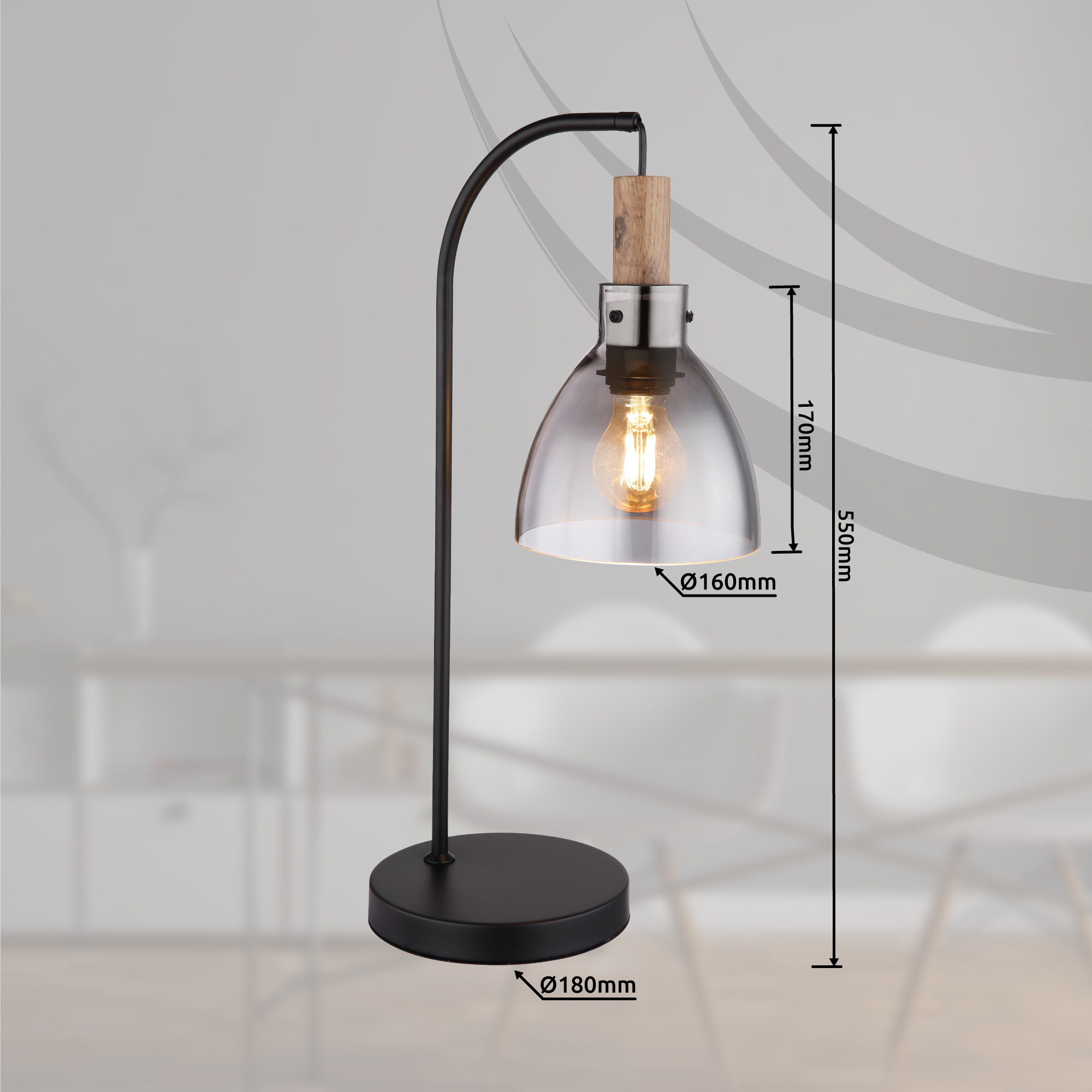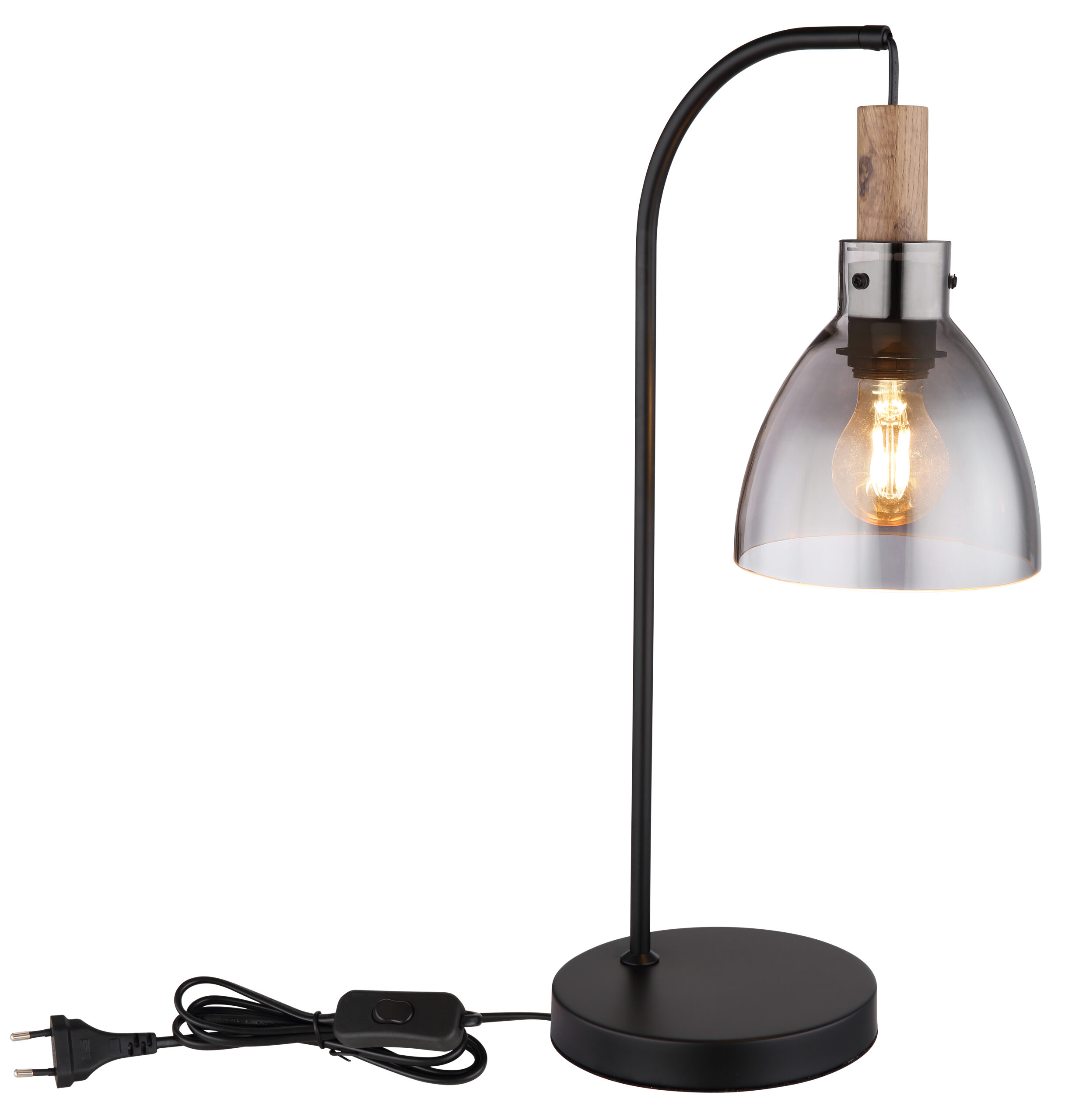Ova oblikovana stolna lampa serije MATTEA inspiriše jednostavnim dizajnom. Crni metalni štap dužine do 55 cm se proteže od okrugle baze i završava na E27 utičnici, koja je obložena staklenim sjenilom u obliku dima s drvenim ukrasima. E27 utičnica vam omogućava da sami odredite boju svjetla i svjetlinu do maksimalne snage od 9 vati. Zbog dugovečnosti i uštede energije preporučujemo LED sijalice.
