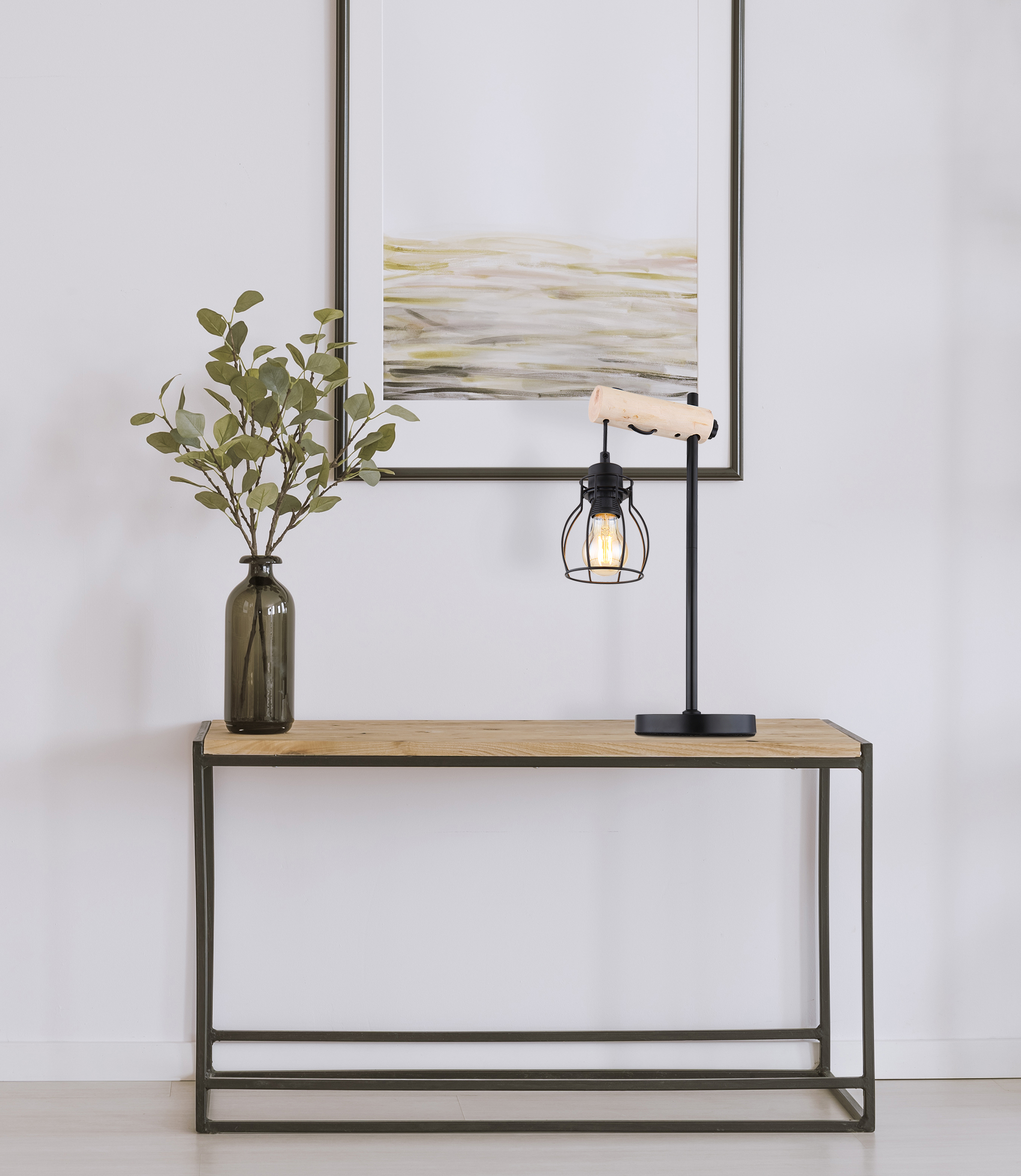 Ova stolna lampa iz serije Mina (27×16 cm) impresionira svojim rustičnim dizajnom od mat crnog metala i drveta. Stolna lampa veličine 48 cm sastoji se od okruglog metalnog postolja na koji je pričvršćena metalna šipka. Ovo je opremljeno drvenom šipkom na kojoj visi metalna rešetkasta sjenilo, koju možete opremiti sijalicom E27 po izboru, što vam daje mogućnost da individualno odredite boju svjetla i svjetlinu. Uz više artikala iz serije Mina, možete stilski upotpuniti svoje interijere.