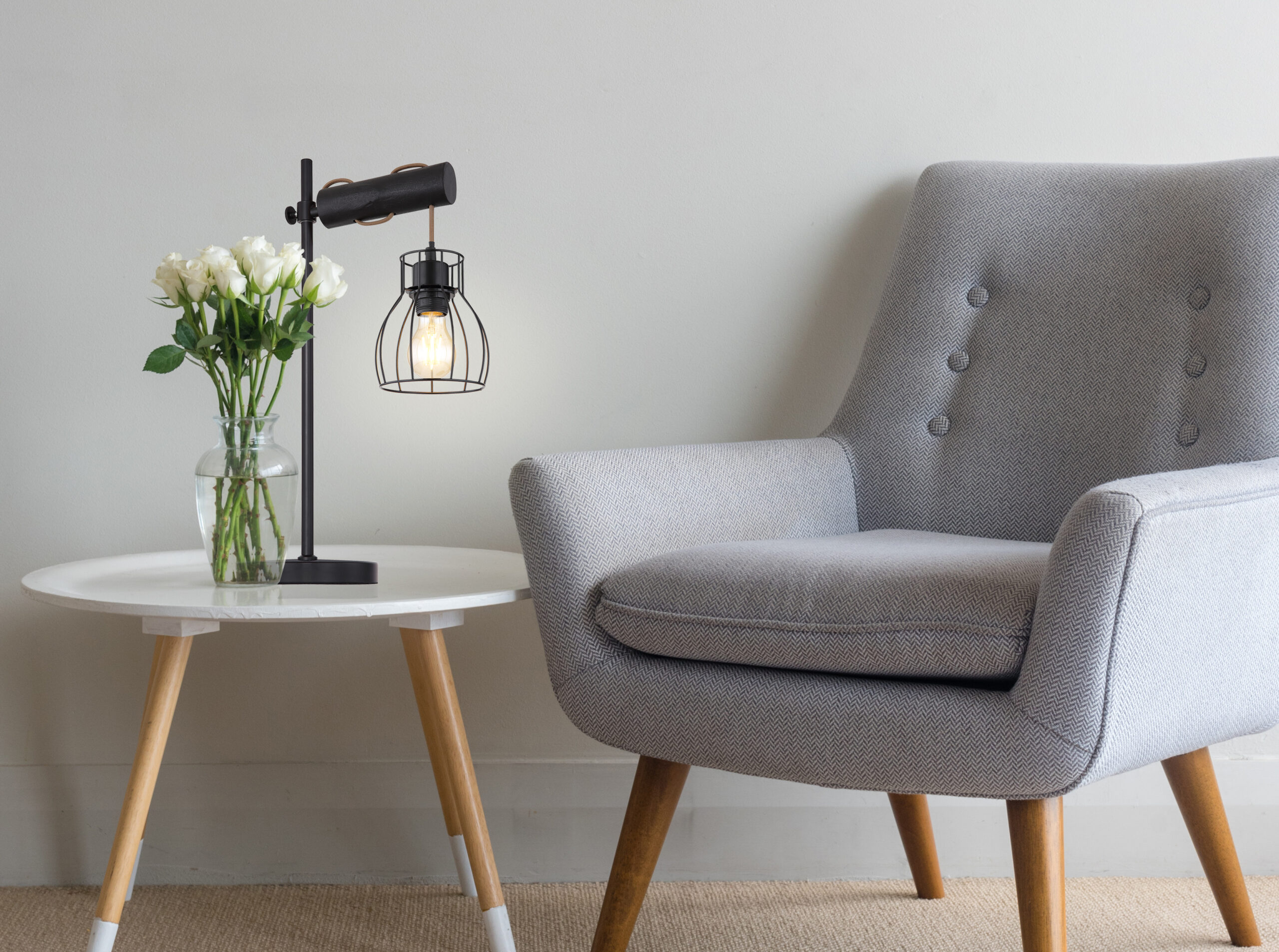 Ova stolna lampa iz serije Mina je elegantan dodatak vašem interijeru. Stolna lampa veličine 55 cm sastoji se od okruglog metalnog postolja na koji je pričvršćena crna metalna šipka. Ovo ima horizontalno fiksiran cilindar sa otvorom, koji je ukršten smeđim kablom, koji je opremljen crnom metalnom rešetkom. Ovo može biti opremljeno sijalicom E27 po Vašem izboru, što Vam daje mogućnost da individualno odredite boju svjetla i svjetlinu. Sa ostalim modelima iste serije možete upotpuniti cjelokupnu sliku u svoja četiri zida.