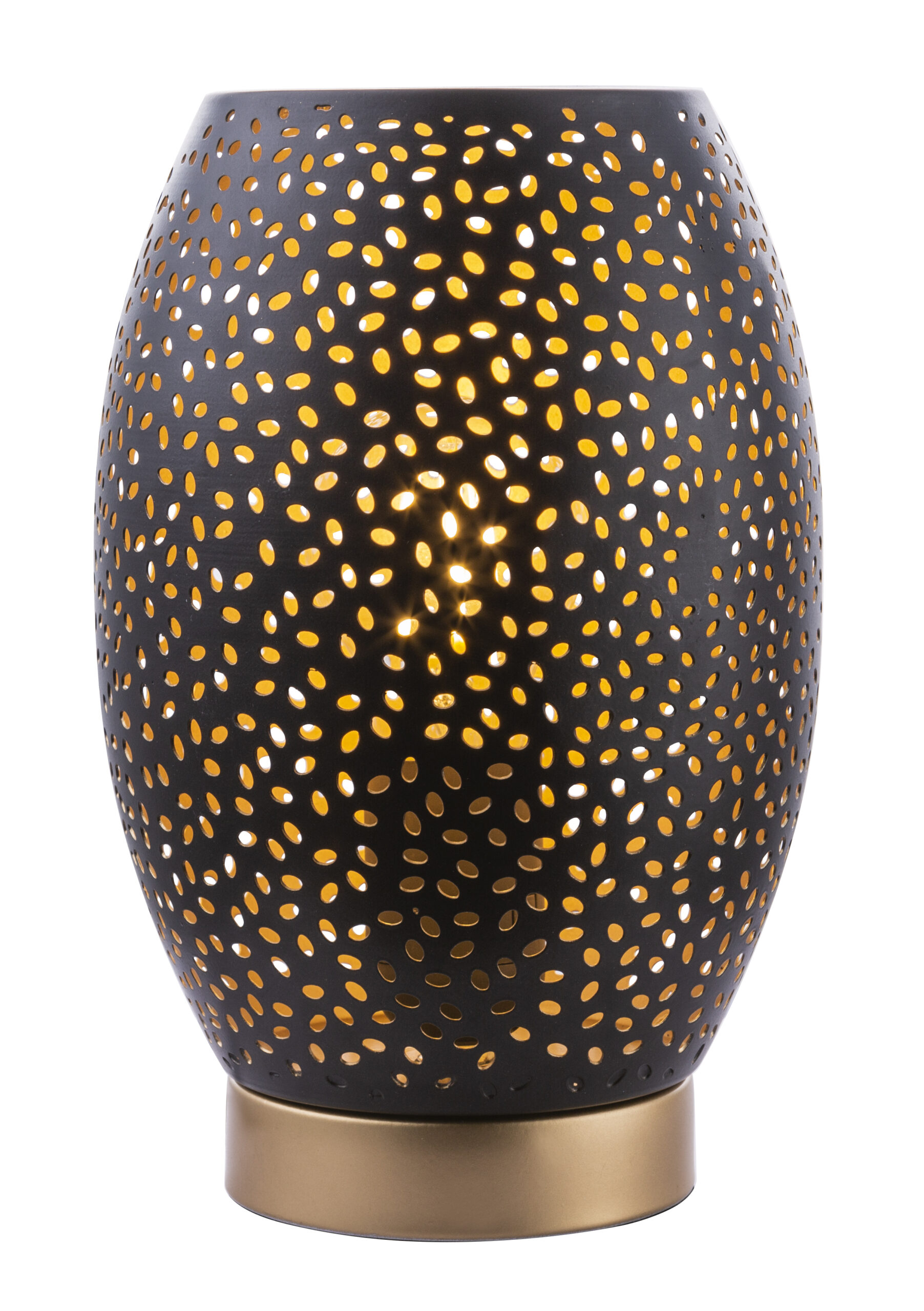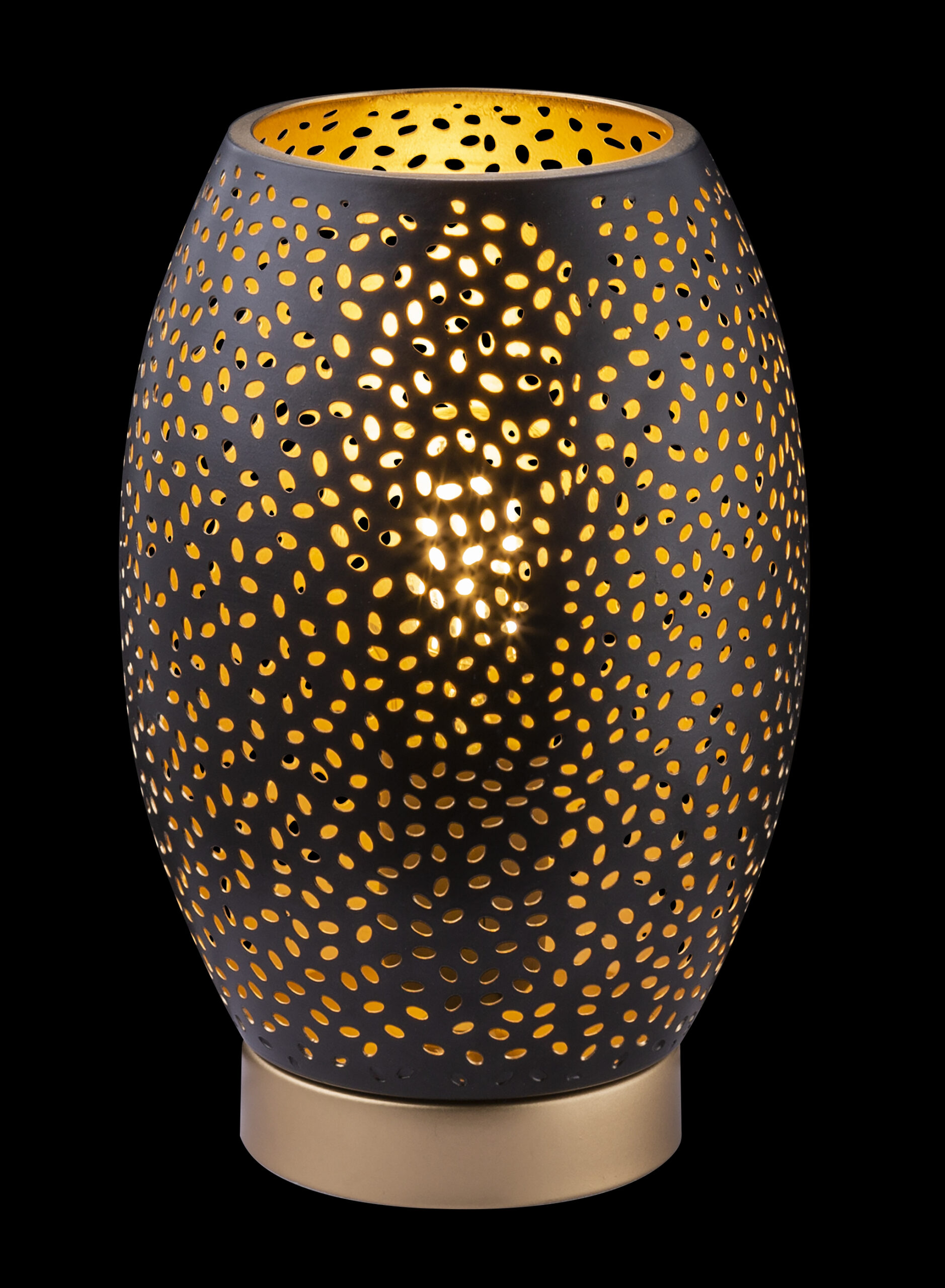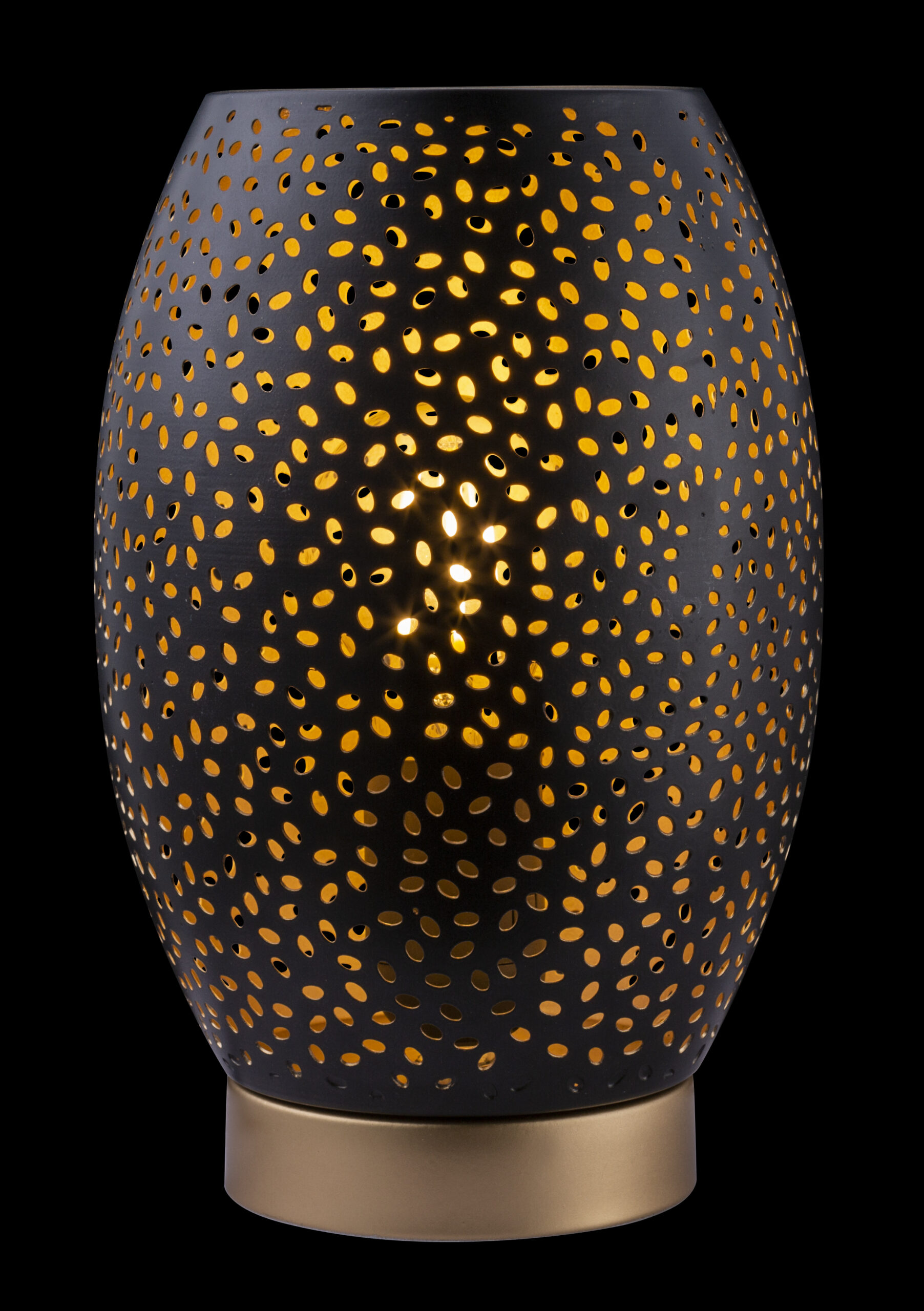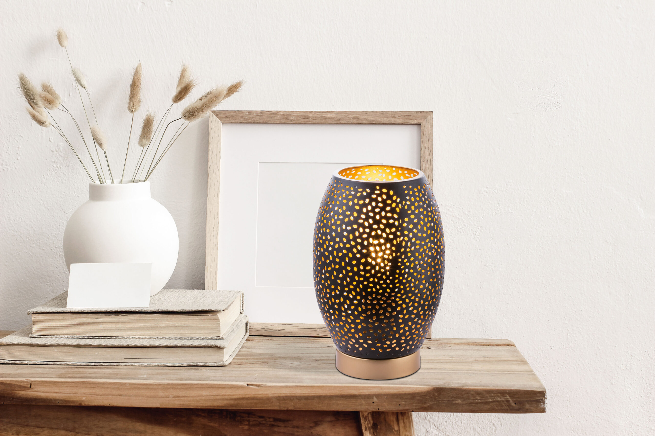 Jednostavno oduzima dah! Stona lampa Narri impresionira elegancijom i stilskim dizajnom u crnoj i zlatnoj boji. Sa postoljem usklađenim bojama, ova lampa ima visinu od 23 cm, prekidač za uključivanje/isključivanje. Ima E27 utičnicu, koja se može opremiti bilo kojim izvorom svjetlosti (maks. 40W). LED sijalice su posebno pogodne za upotrebu u otvorenim svetiljkama bez stvaranja odsjaja. Ušteda energije i dugovječnost je još jedan pozitivan učinak i time je dobro raspoloženje zagarantovano.
