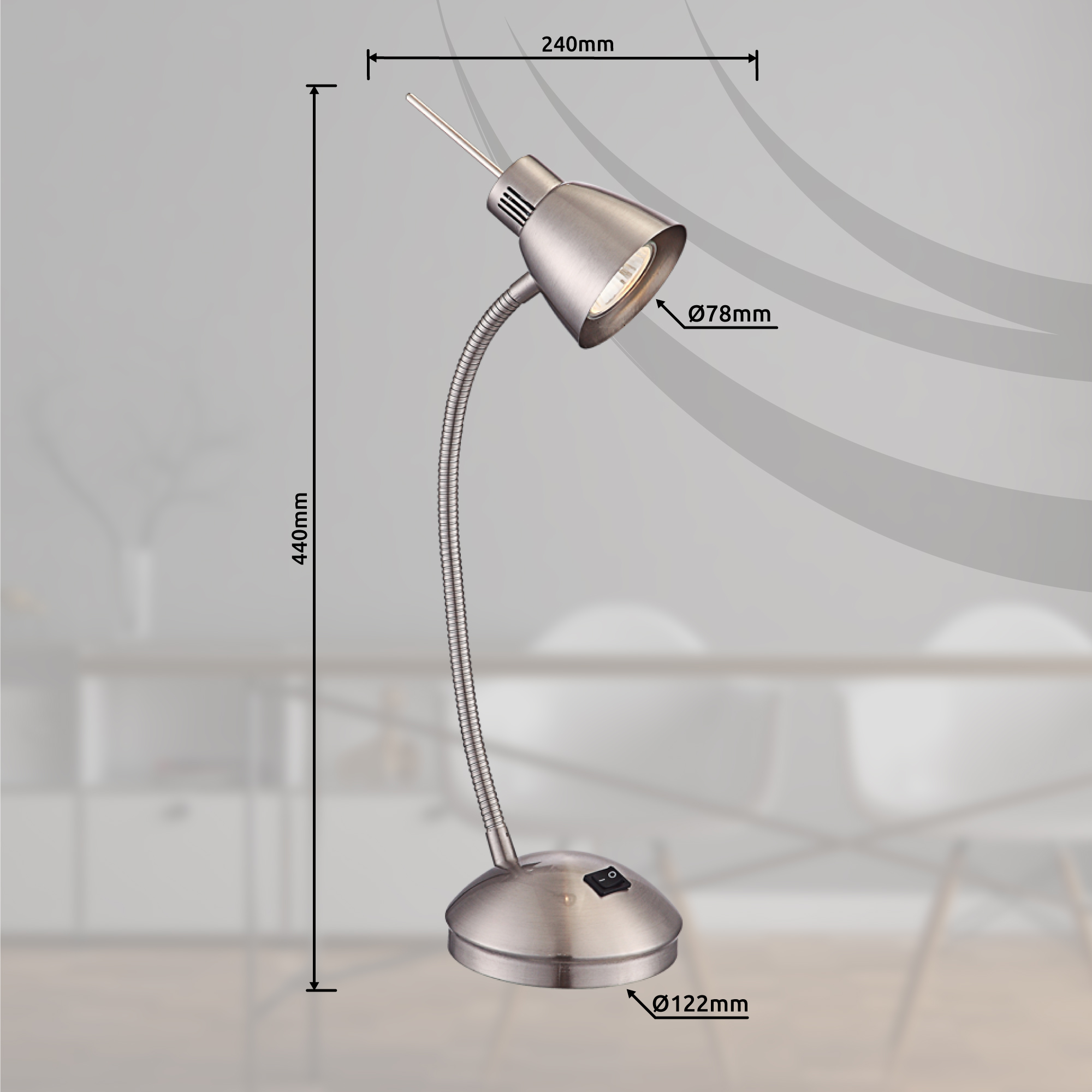 Tradicionalni stoni reflektor Nuova veličine 44 cm ističe svojim bezvremenskim, klasičnim dizajnom. Flexo ruka daje ovoj nikal mat stolnoj lampi potrebnu fleksibilnost. Sijalica daje jako svjetlo od 165 lumena sa prijatnom toplom bijelom bojom svjetlosti od 3000K. U istoj seriji modela, ova stolna lampa je dostupna i u drugim bojama.