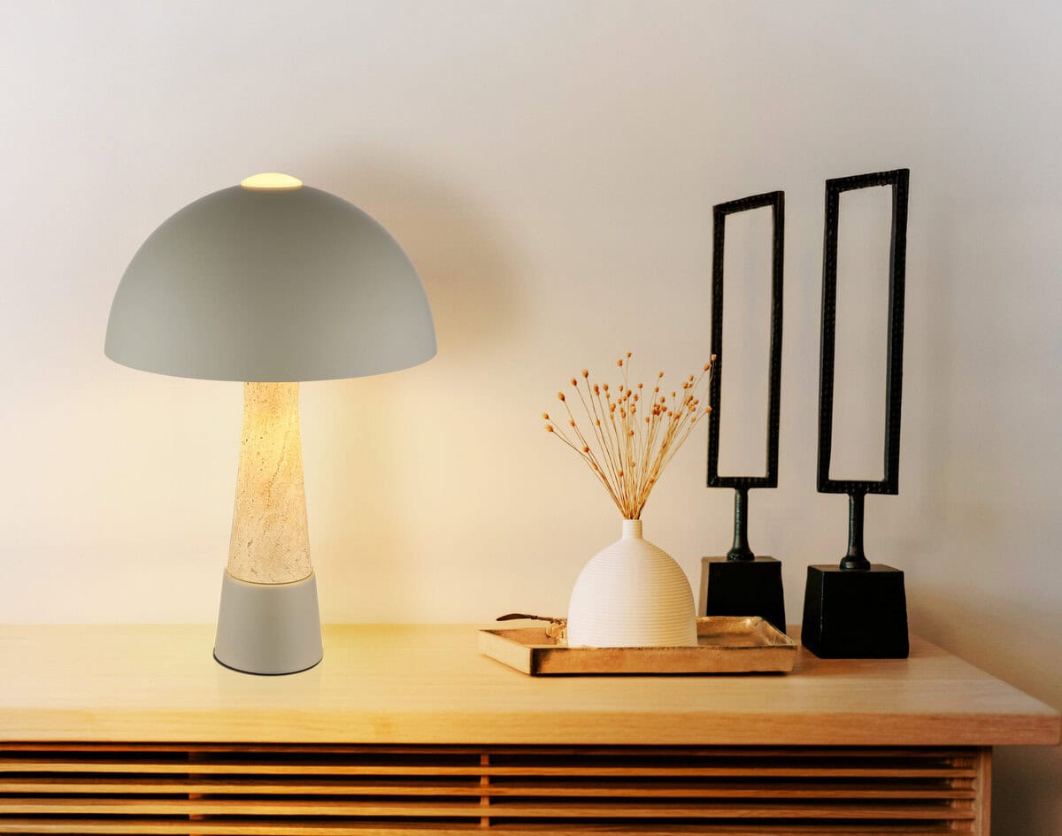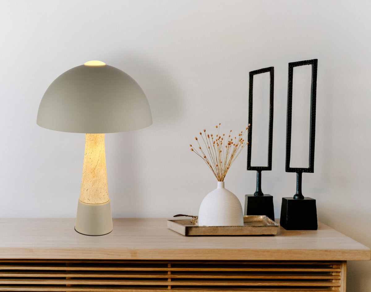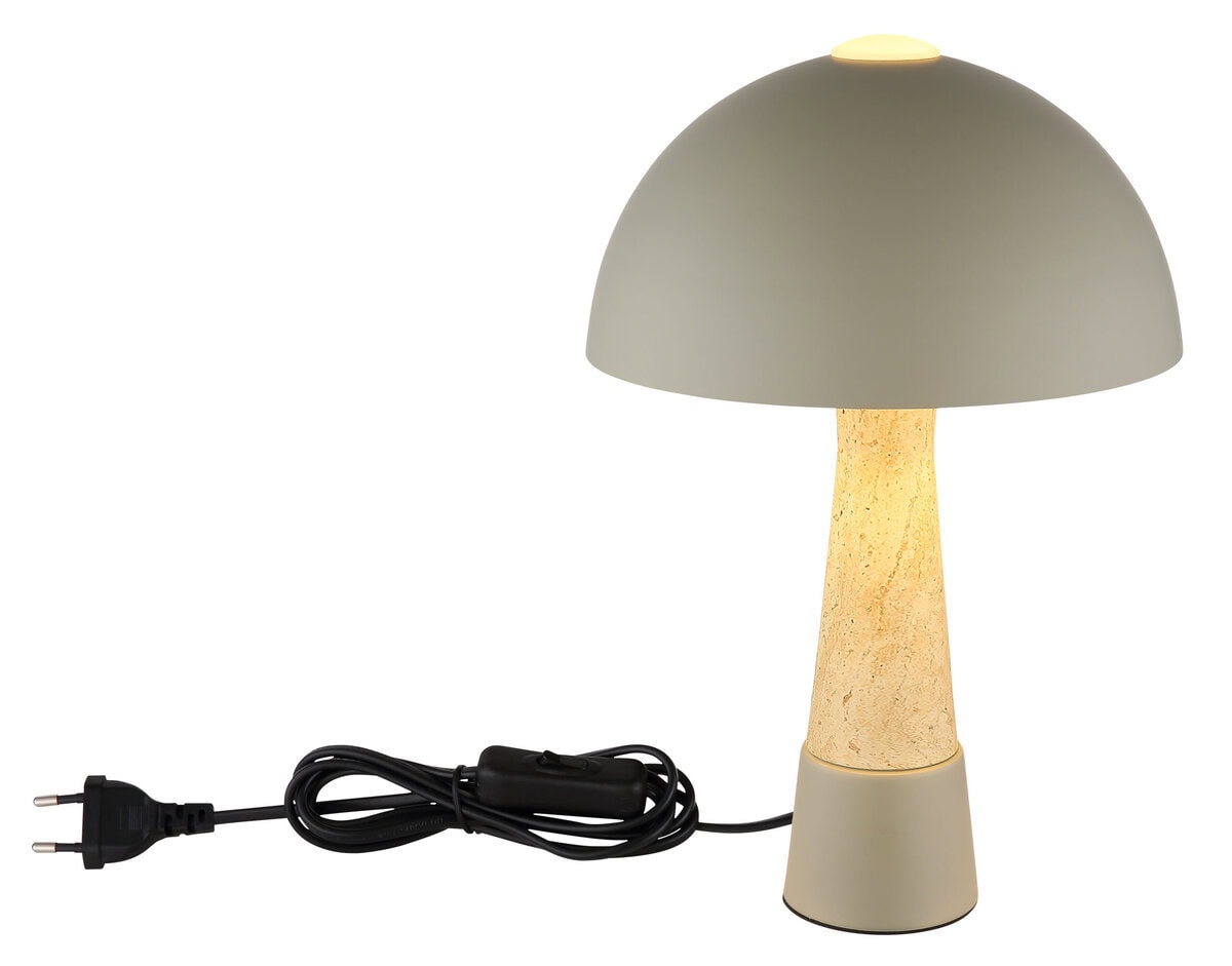 Okrugla stolna lampa PAULIN impresionira svojim prepoznatljivim oblikom pečuraka i elegantnom kombinacijom mat sivog metala i završne obrade u obliku travertina. Okrugla mat siva metalna nijansa savršeno nadopunjuje čvrsto tijelo, dajući lampi moderan, ali bezvremenski izgled. Sa prečnikom od 250 mm, PAULIN je idealan za stolove, bočne ili noćne ormariće, dodajući stilske akcente gde god da je postavljen. Preklopni prekidač na kablu omogućava praktičan i lak rad bez savijanja. Opremljena grlom E27 (sijalica nije uključena), lampa nudi maksimalnu fleksibilnost u odabiru savršenog izvora svjetlosti—bilo toplo ili neutralno bijelo svjetlo, prilagođeno vašim potrebama. Visokokvalitetna izrada i njegov prepoznatljiv dizajn čine PAULIN posebnim vrhuncem u svakom modernom interijeru. Bilo kao svjetlo za zadatak ili ambijentalni dodatak, PAULIN savršeno kombinira funkcionalnost i estetiku.