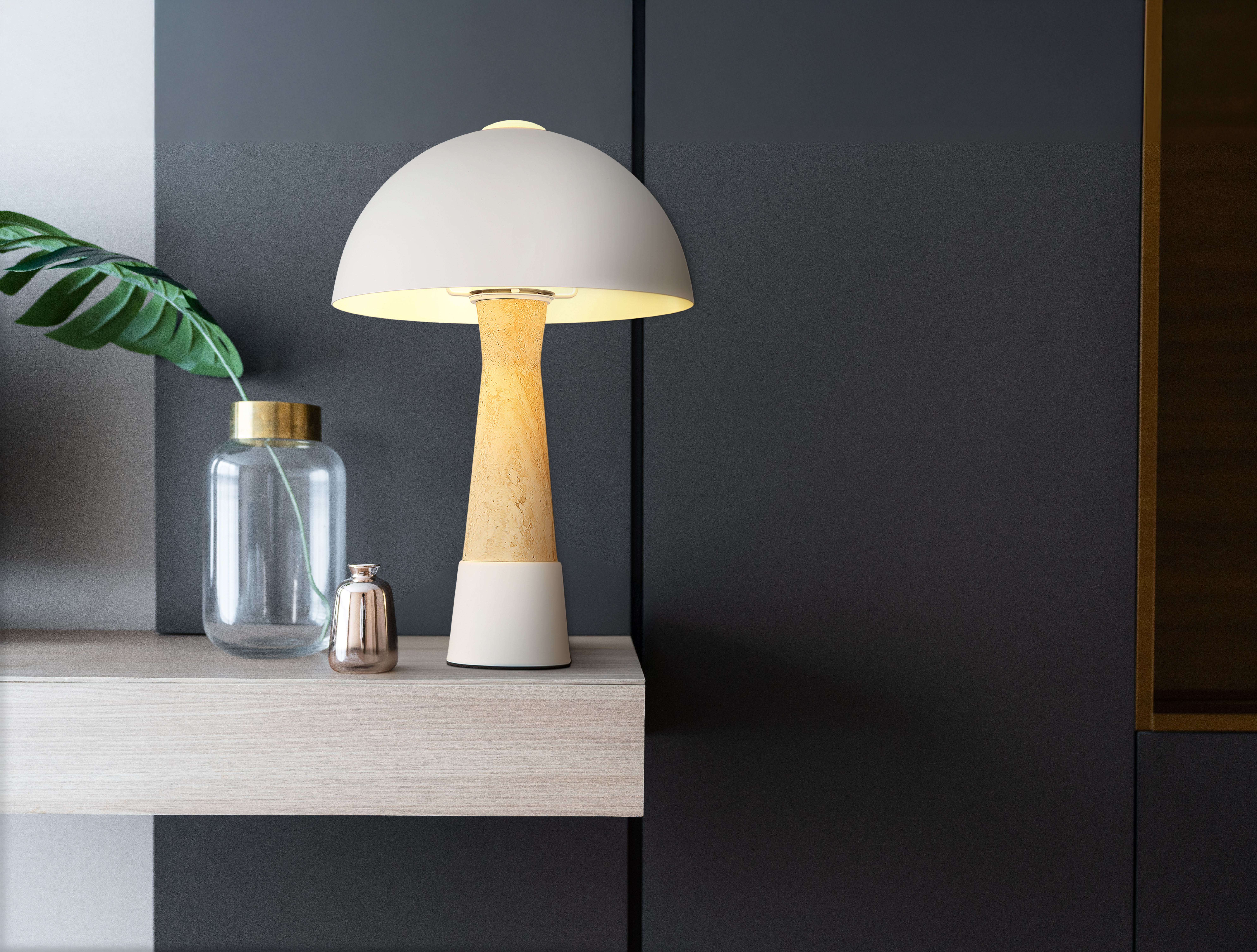 Okrugla stolna lampa PAULIN impresionira svojim prepoznatljivim oblikom pečuraka i skladnom kombinacijom mat metala boje pijeska i završne obrade travertina. Okruglo metalno kućište u mat tonu pijeska elegantno se stapa sa jednako mat metalnim sjenilom, dajući lampi topao, prirodan izgled. Sa promjerom od 250 mm, PAULIN je idealan za stolove, noćne ormariće ili bočne stolove, stvarajući ugodno, atmosfersko svjetlo. Praktičan prekidač na kablu omogućava lak i udoban rad. Opremljen grlom E27 (sijalica nije uključena), PAULIN nudi maksimalnu fleksibilnost u odabiru savršenog izvora svjetlosti — bilo toplog ili neutralno bijelog, prilagođenog individualnim potrebama. Visokokvalitetna izrada i promišljen dizajn čine PAULIN elegantnim vrhuncem u svakoj prostoriji. Bilo da se radi o funkcionalnoj rasvjeti za zadatke ili ugodnom akcentnom osvjetljenju — PAULIN savršeno kombinira estetiku i funkcionalnost.