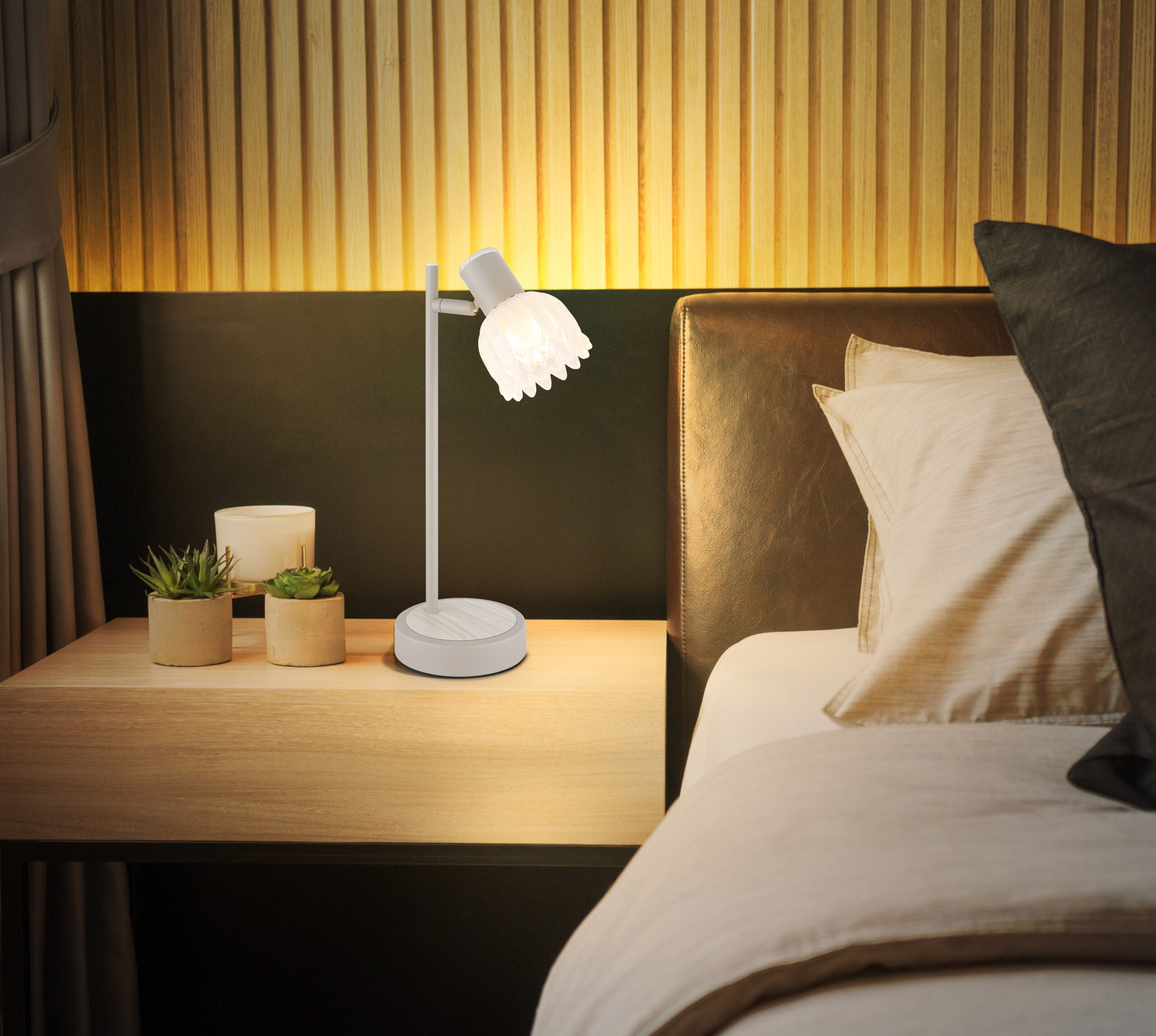 Stolna lampa PLANTA kombinuje prirodni šarm sa modernim dizajnom i idealna je za stolove, noćne ormariće ili udobne kutke za čitanje. Ravni krak od mat metala boje pijeska upotpunjen je laganim akcentima s efektom drveta, dajući lampi topao i privlačan izgled. Matirano staklo za cvijeće pruža nježnu, ravnomjernu distribuciju svjetlosti koja harmonično osvjetljava prostoriju bez odsjaja. Sa dužinom od 170 mm i širinom od 120 mm, lampa je kompaktna i štedi prostor. Praktičan prekidač na kablu omogućava lako i praktično rukovanje. Stona lampa je dizajnirana za sijalice E14 (nisu uključene), što vam omogućava da prilagodite boju svjetla i svjetlinu. PLANTA impresionira visokokvalitetnim materijalima, promišljenim dizajnom i fleksibilnom funkcionalnošću – elegantnim i praktičnim svjetlosnim rješenjem koje stvara ugodnu atmosferu u svakoj prostoriji.