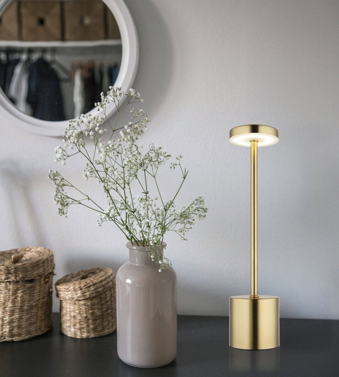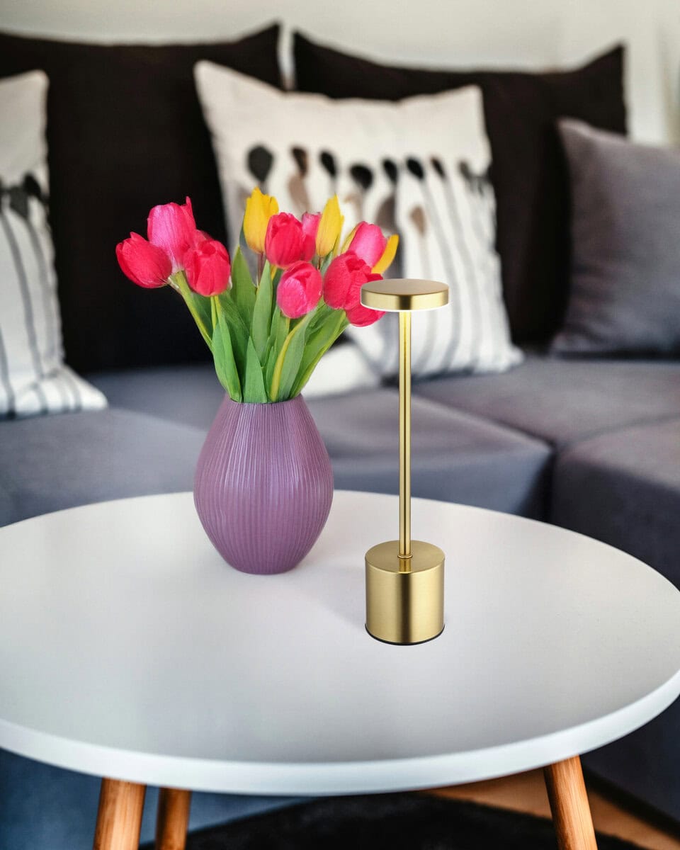 Stolna lampa POLINA impresionira svojim elegantnim oblikom čaše i metalnim kućištem mat zlatne boje, koje postavlja stilski akcent u svaku prostoriju. Opalno plastično sjenilo pruža meko svjetlo bez odsjaja. S beskonačnim dimerom na dodir, svjetlina se može regulirati po želji, a boje se mogu fiksirati pojedinačno. Integrirana memorijska funkcija pamti posljednju odabranu postavku i na taj način nudi visok nivo udobnosti. POLINA je opremljena praktičnim prekidačem za uključivanje/isključivanje na dodir i nudi svjetlosnu snagu od 138 lumena. CCT funkcija omogućava temperaturu boje od 2700K do 4500K, idealno za različita raspoloženja osvjetljenja. Lampica ostaje upaljena dok se puni i potrebno je oko 4 sata da se potpuno napuni. Sa vremenom osvetljenja od oko 6 sati i uključenim USB kablom za punjenje i adapterom, savršen je pratilac za moderna i fleksibilna rešenja za osvetljenje. Uključujući LED diode, spreman je za trenutnu upotrebu.