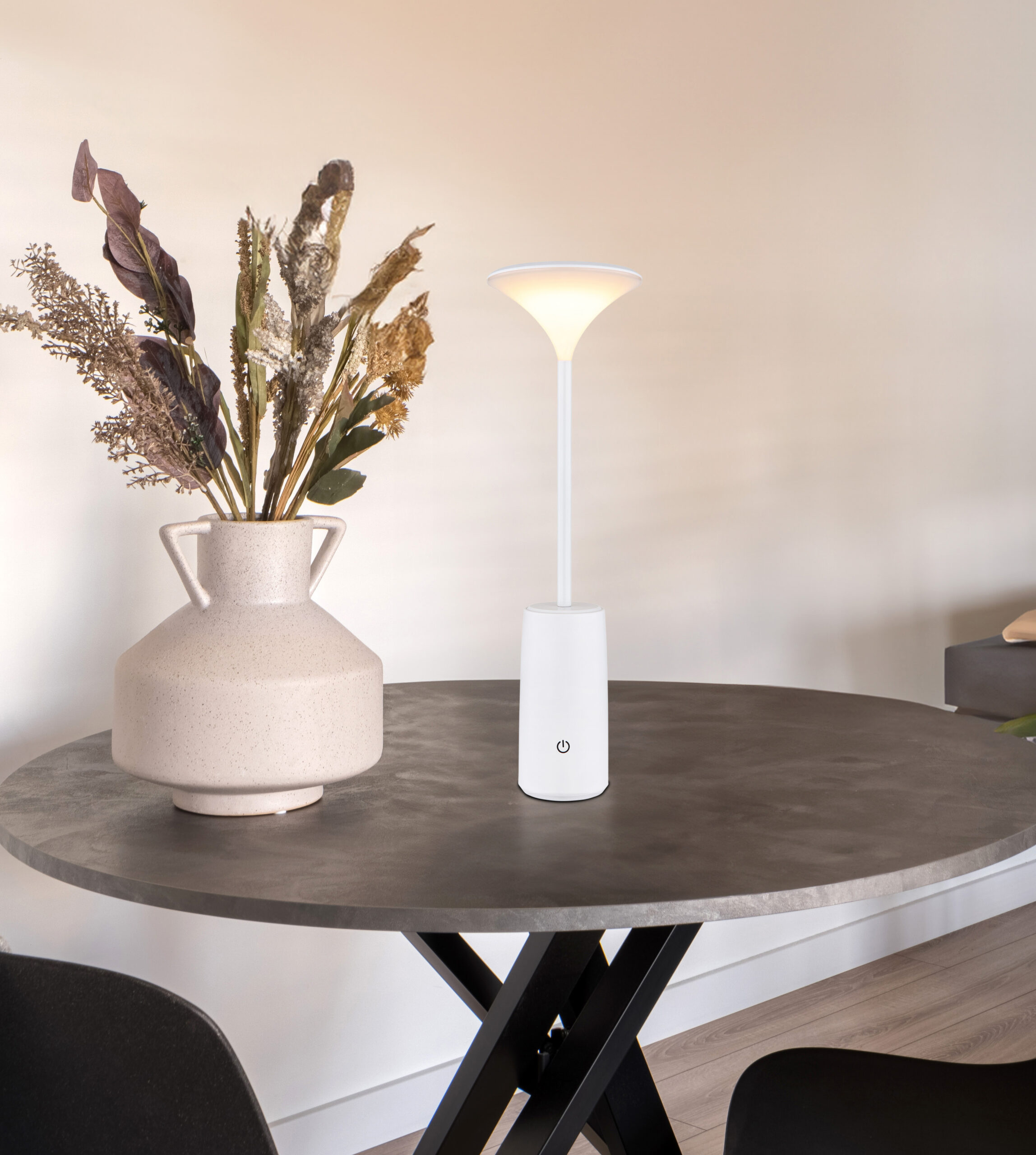 QUIRIN stona lampa u mat beloj boji je moderan i praktičan dodatak za vaš dom. Plastično i metalno kućište lampi daje moderan izgled, dok abažur od opalnog polikarbonata daje meko i ugodno svjetlo. Sa sistemom za uključivanje/isključivanje dodirom i beskonačnim dimerom na dodir, lako možete prilagoditi svjetlinu lampe svojim potrebama. Snažna baterija (CR18650 1500mAh 3,7V) omogućava vrijeme rada do 6 sati i može se napuniti za oko 4 sata. Svjetlo se ne može koristiti tokom punjenja. Stona lampa je opremljena energetski efikasnom LED lampom od 1,2W i 100lm izlazne snage, koja proizvodi ugodnu temperaturu svjetlosti od 3000K. USB kabl je uključen, adapter se mora kupiti posebno.