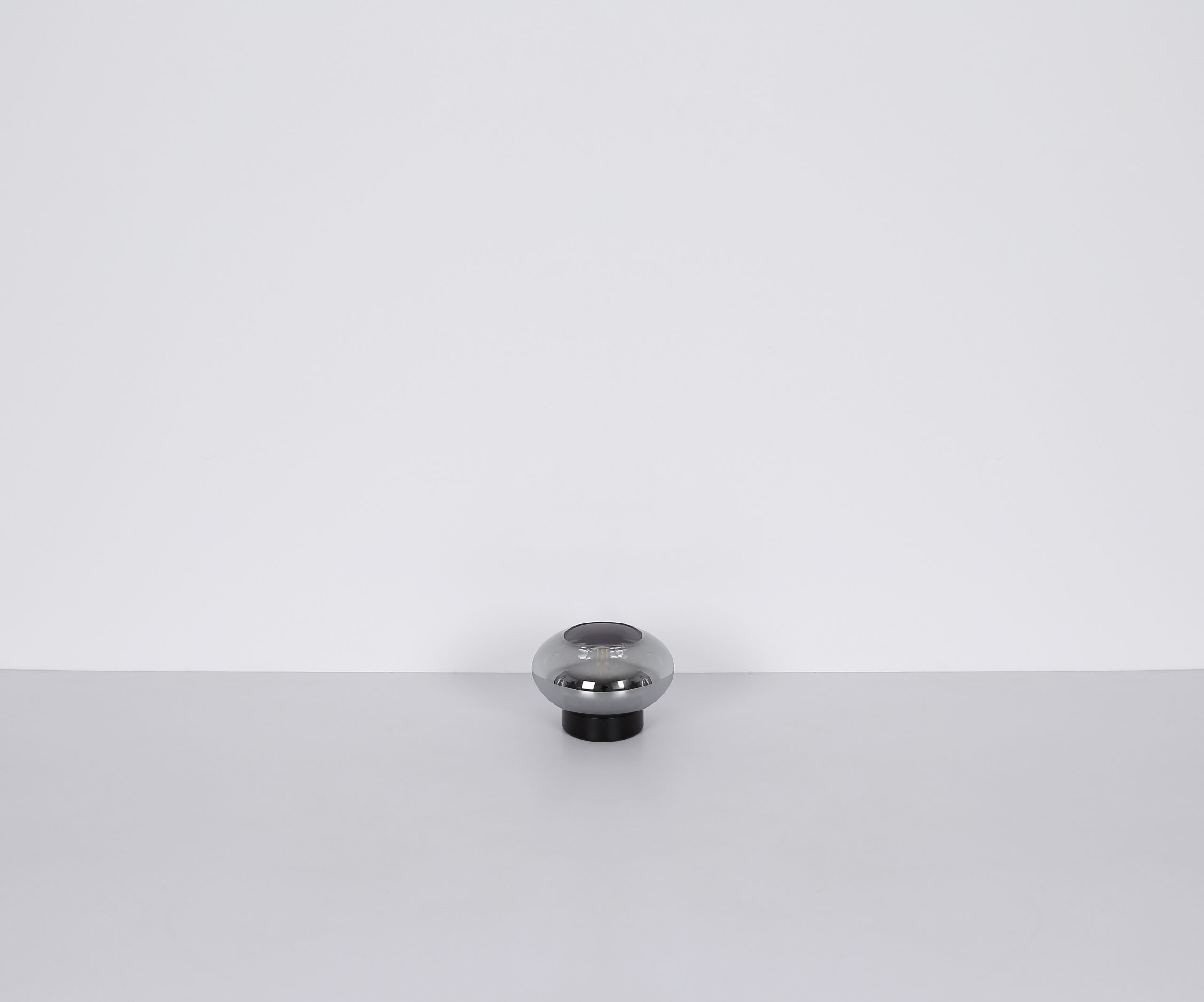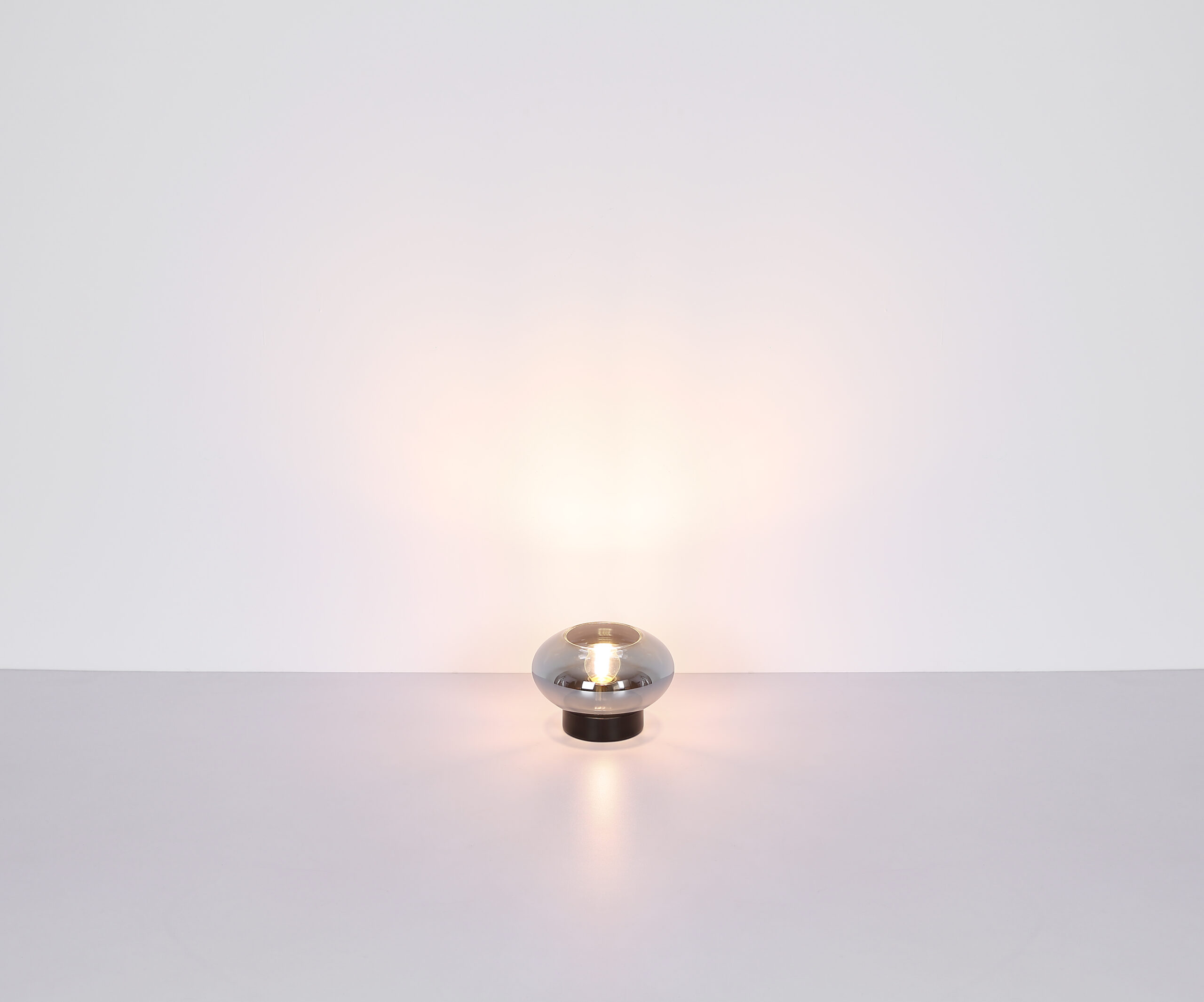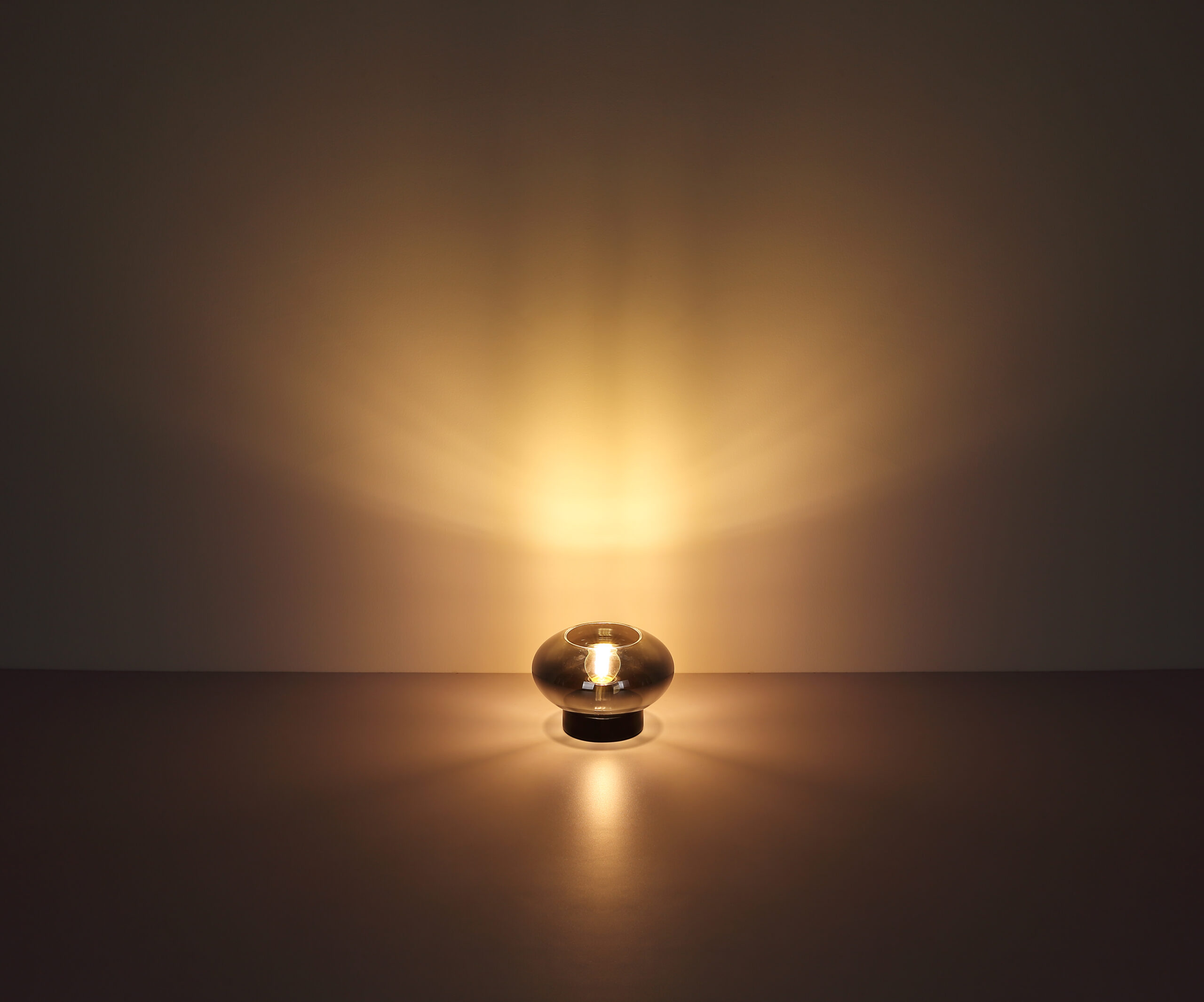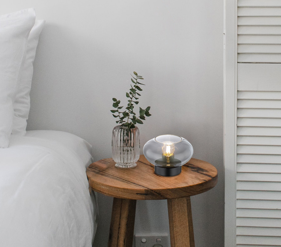 Ova prekrasna stolna lampa inspirira odličnim dizajnom. Na okruglom crnom stalku (Ø18cm) nalazi se E27 utičnica sa ovalnim sjenilom u dimljenom staklu. Utičnica E27 vam omogućava da slobodno birate, do maksimalne snage od 40 vati, putem svijetle boje i svjetline.