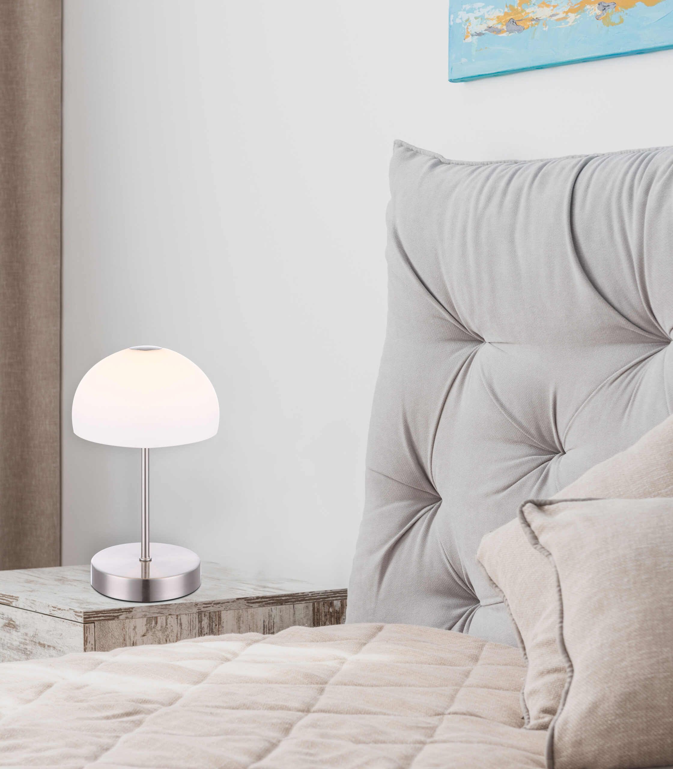 Hemisferična stolna lampa Snowflake se sastoji od nikl mat metalne osnove, kao i polulopte od opalnog stakla (Ø15 cm). Ova stolna lampa od 27 cm daje jako svjetlo od 400 lumena sa ugodnom bojom svjetla od 3000K. Uključivanje i isključivanje se uključuje i isključuje pomoću funkcije dodira.