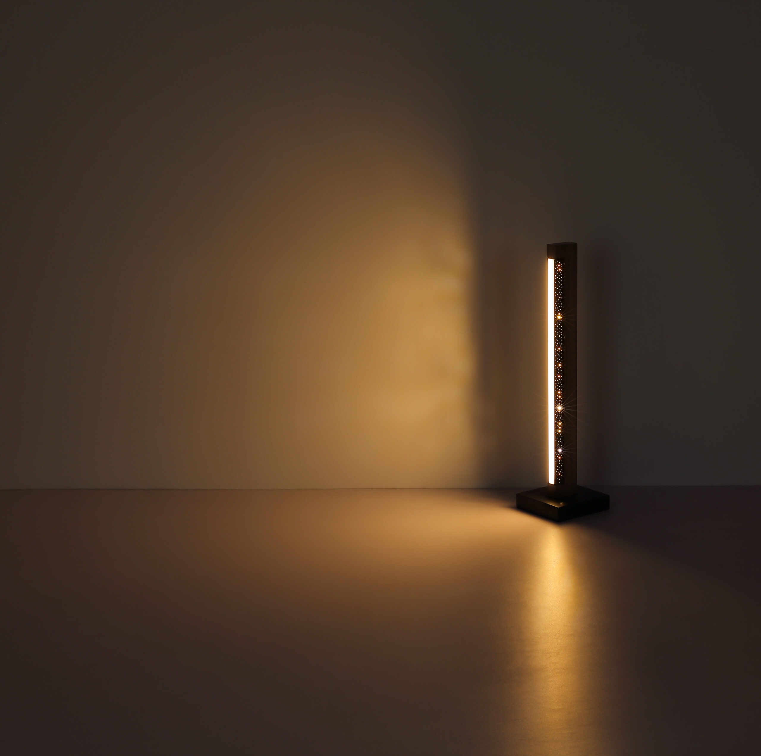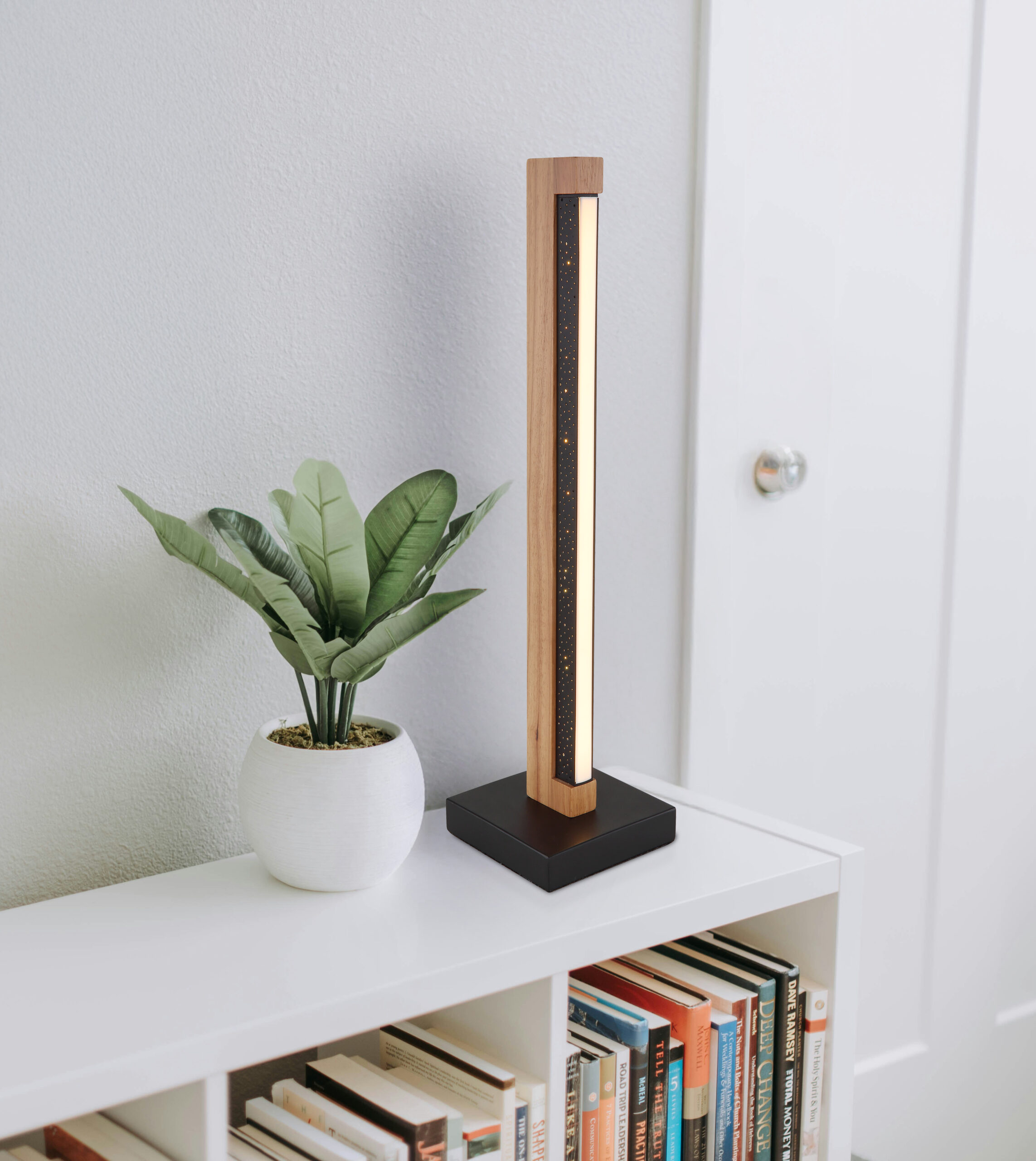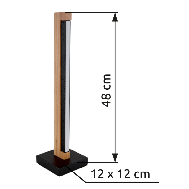 Kvadratna stolna lampa s ravnim drvenim gredama moderan je dodatak vašem stolu ili noćnom ormariću. Mat crno lakirano metalno kućište u kombinaciji sa tamno smeđim drvenim gredama daje lampi moderan, ali topao izgled. Aluminijumsko sjenilo je također mat crne boje i opremljeno opal plastikom, koja osigurava ravnomjernu raspodjelu svjetla bez odsjaja. Sa veličinom od 120 mm po dužini i širini, ova stolna lampa štedi prostor i savršeno se uklapa u male prostore. Sjaj od 150 lumena sa snagom od 6W i prijatnom temperaturom boje od 3000K stvara ugodnu atmosferu osvetljenja. Aluminijumsko sjenilo je također opremljeno zvjezdastom dekoracijom kroz udarce, što pruža prekrasan svjetlosni efekat. Upotrijebite praktičan prekidač na kabelu da jednostavno uključite i isključite stonu lampu i uživate u ugodnom svjetlu u svojoj sobi.