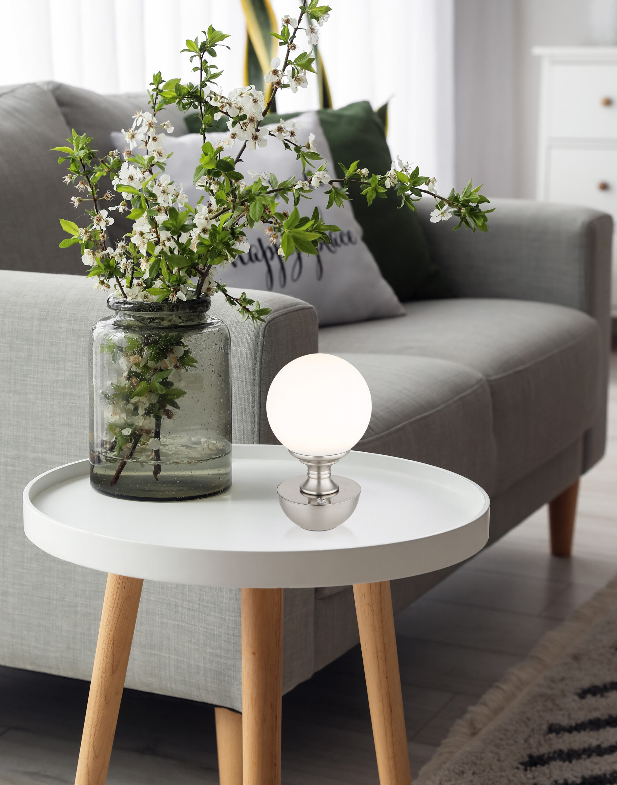Naša moderna stolna lampa napravljena od mat plastike nikla i opala će vašoj sobi dodati moderan štih. Zgodni beskonačni dimer na dodir omogućava vam da prilagodite svjetlinu po svom ukusu. Boje se mogu fiksirati i prilagoditi kako bi se stvorila željena atmosfera. Integrirana CR18650 baterija od 900 mAh i 3,7 V nudi vrijeme gorenja od oko 6-8 sati i može se napuniti za oko 4 sata. Kabl od 500 mm pruža fleksibilnost u postavljanju svetiljke. Svetiljka je opremljena štedljivom LED diodom snage 2,5W i izlaznom snagom od 175lm. Nudi tri različite temperature boje (2700/6500/4000K) za različita raspoloženja osvjetljenja. USB kabl za punjenje je uključen, odgovarajući adapter se mora kupiti posebno. Dopustite da budete inspirisani ovom elegantnom i funkcionalnom stolnom lampom.