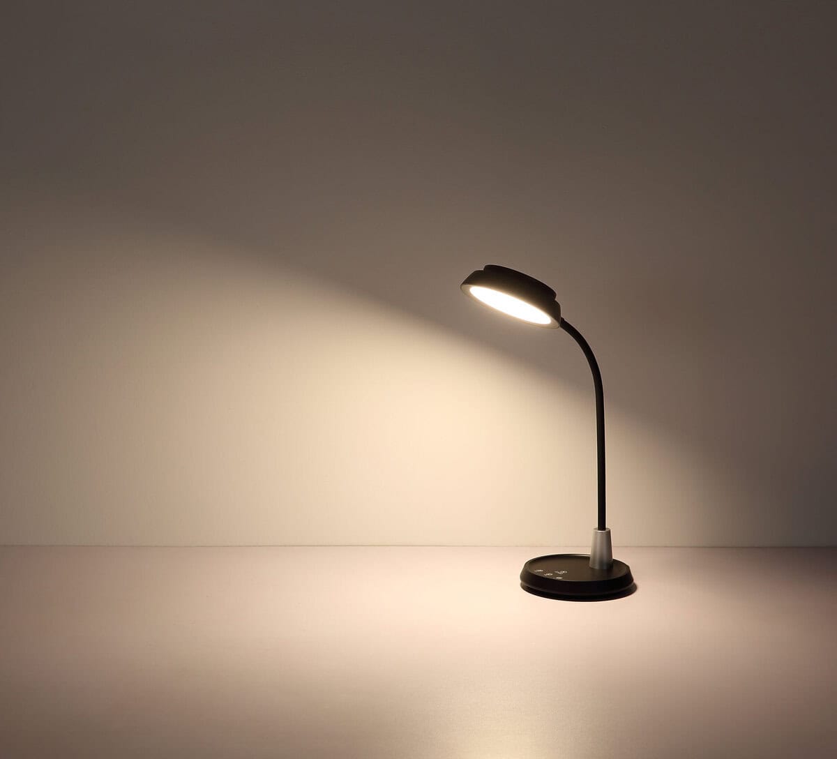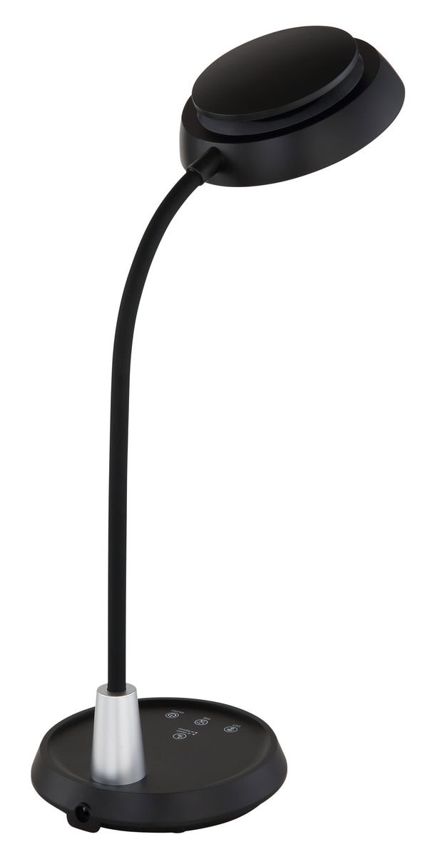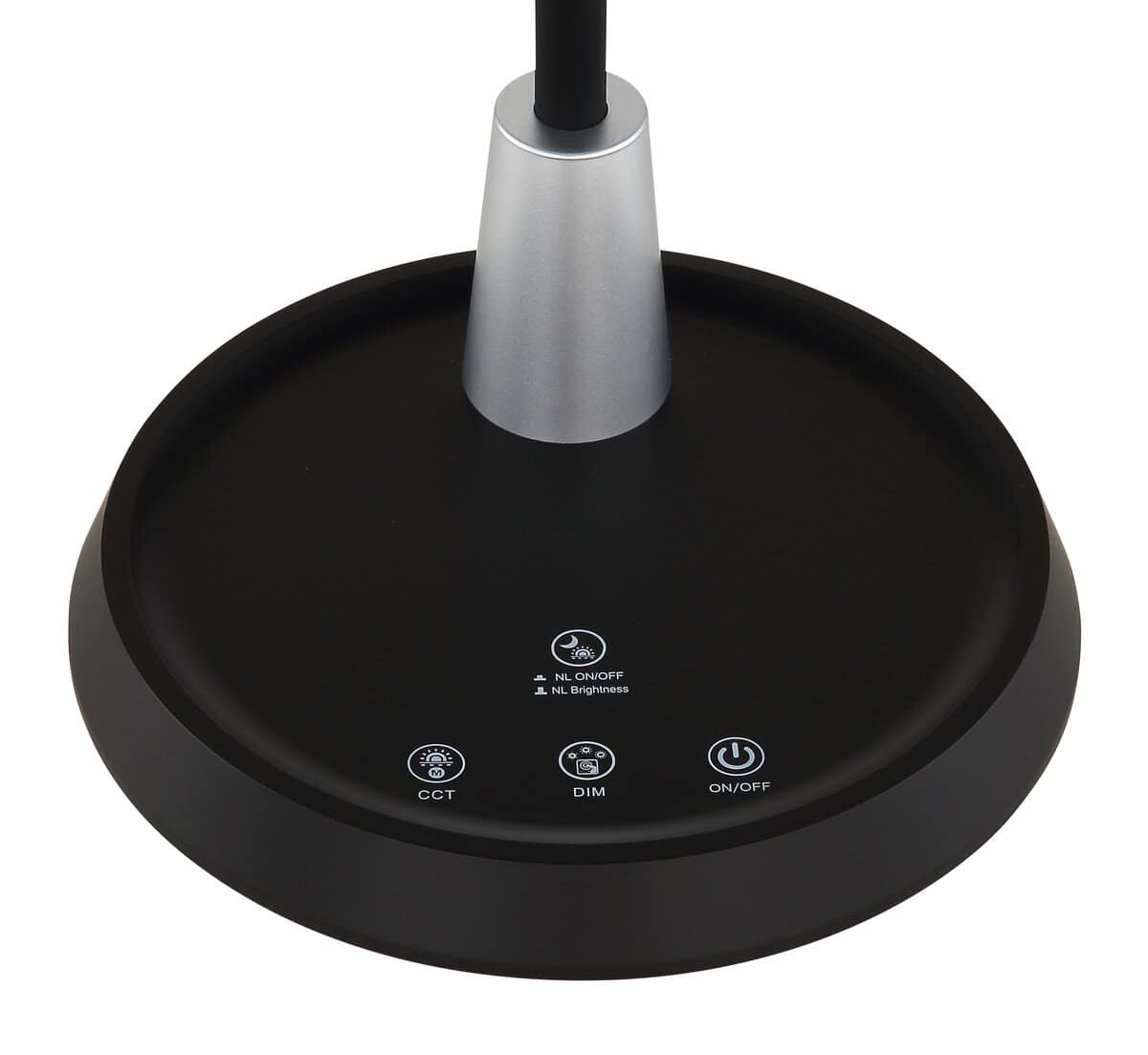 KIRK stolna lampa kombinuje moderan dizajn sa inovativnom tehnologijom osvetljenja, što je čini savršenim pratiocem za kancelarije, dnevne sobe ili spavaće sobe. Na okruglom postolju, tanka cijev vodi do ravnog okruglog abažura. Elegantna mješavina mat crne i mat srebrne plastike daje mu elegantan izgled, dok sjenilo od crne plastike, opal plastike i mat crnog silikona daje ugodno difuzno svjetlo.