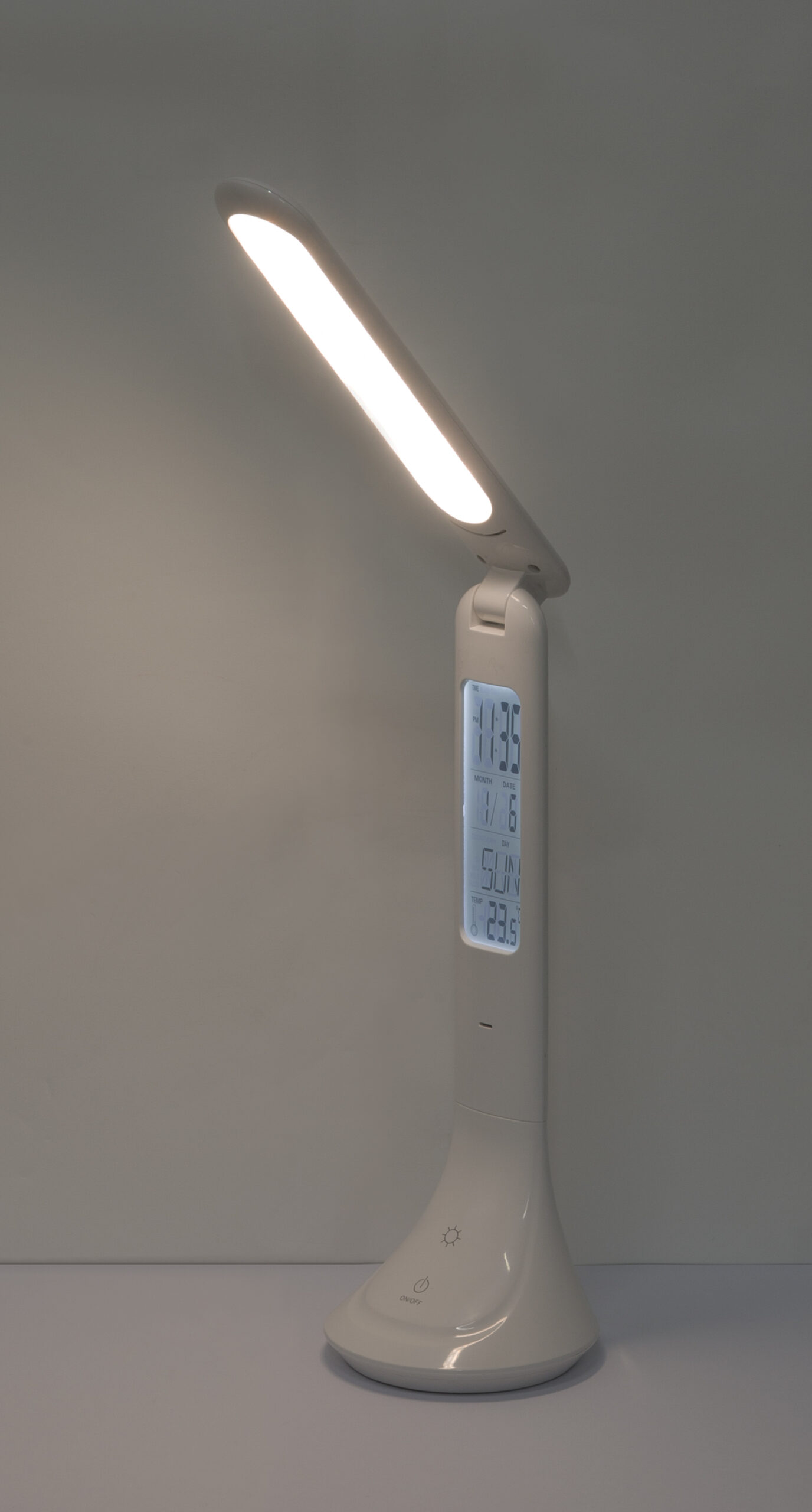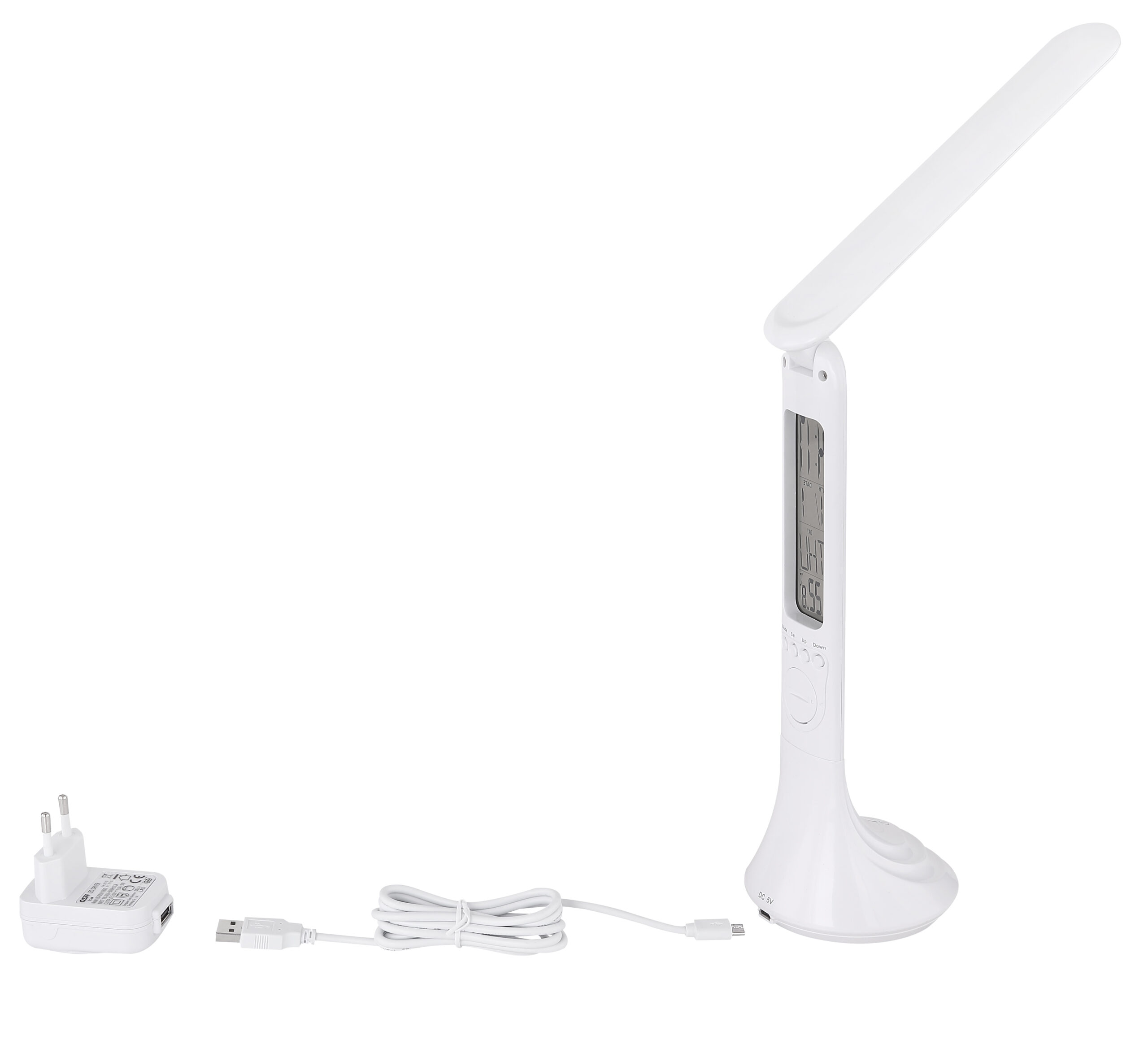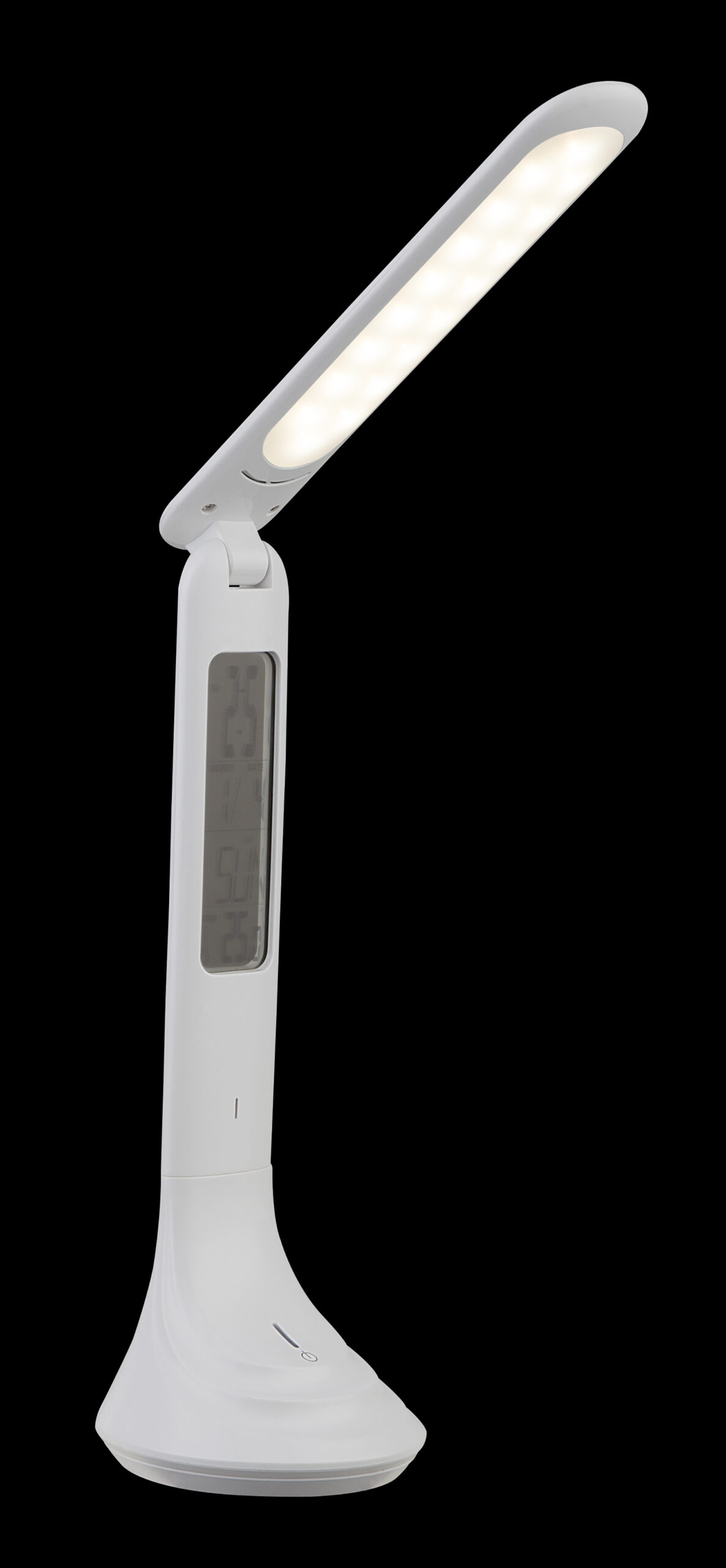 Ova sjajna stolna lampa ističe svojom funkcionalnošću. Koristeći ugrađeni dimer na dodir, osvetljenost se može regulisati u tri nivoa. Zaslon ugrađen u bijelo plastično kućište nudi vam mogućnost čitanja datuma uz vrijeme. Funkcija budilnika upotpunjuje paket usluga. Osvetljenjem displeja može se upravljati preko posebnog prekidača. Stolna lampa ima integrisane punjive baterije koje omogućavaju korišćenje van mreže.