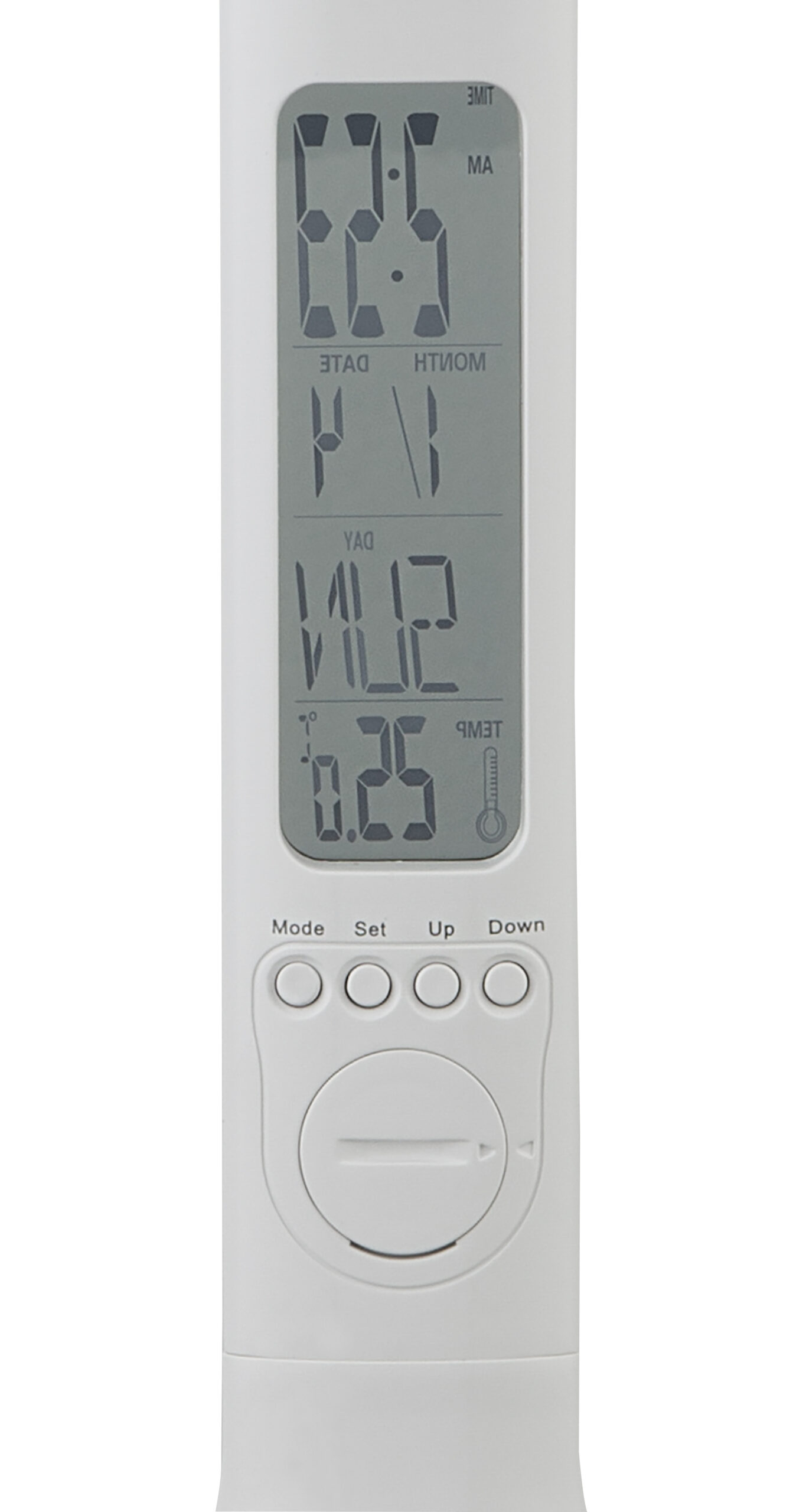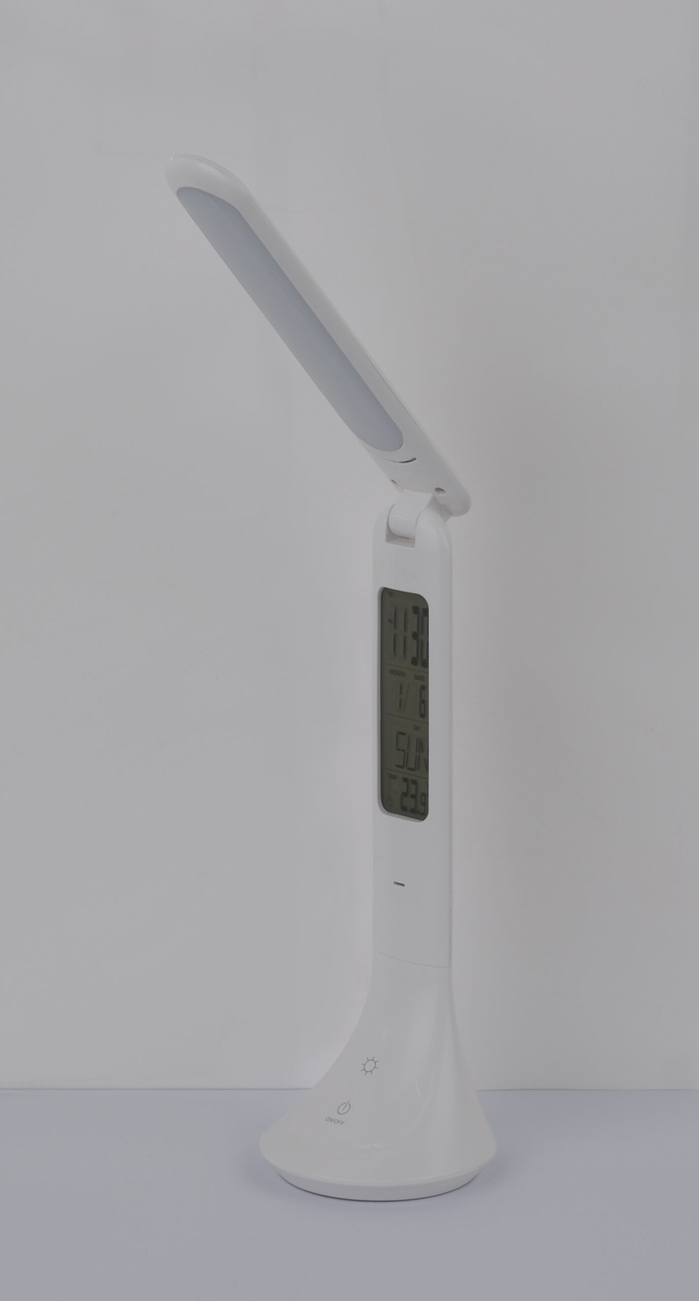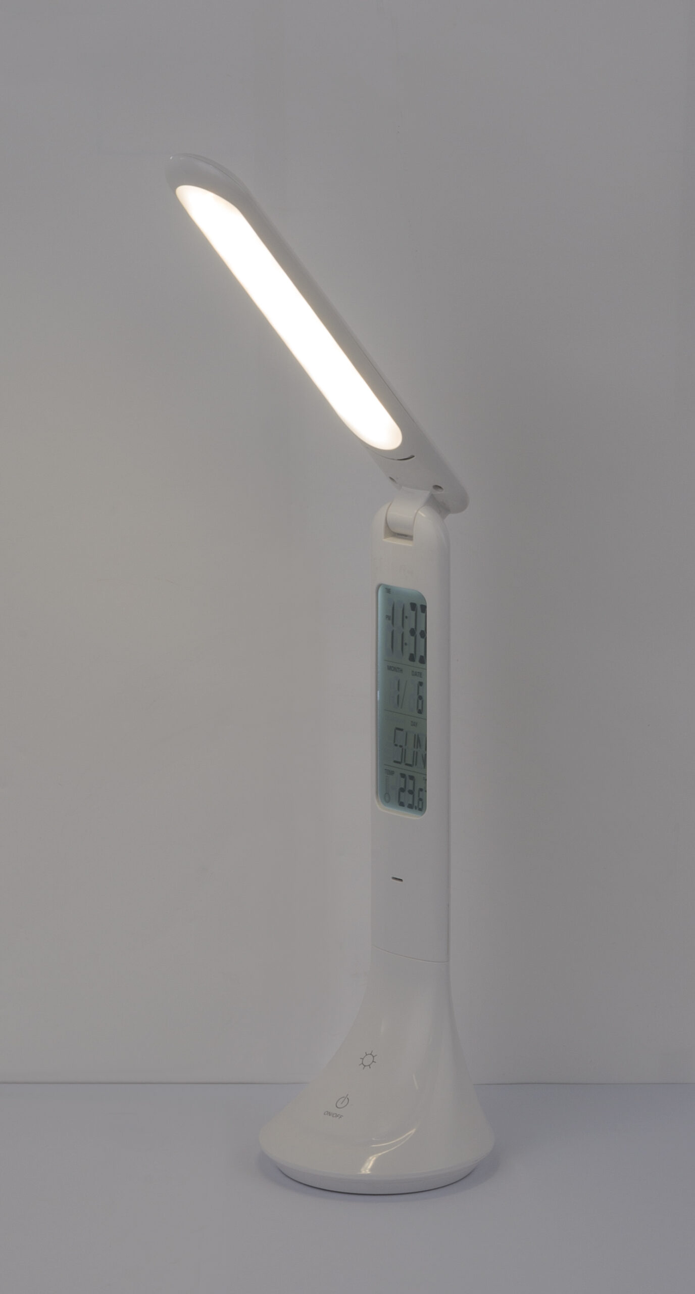 Ova sjajna stolna lampa ističe svojom funkcionalnošću. Koristeći ugrađeni dimer na dodir, osvetljenost se može regulisati u tri nivoa. Zaslon ugrađen u bijelo plastično kućište nudi vam mogućnost čitanja datuma uz vrijeme. Funkcija budilnika upotpunjuje paket usluga. Osvetljenjem displeja može se upravljati preko posebnog prekidača. Stolna lampa ima integrisane punjive baterije koje omogućavaju korišćenje van mreže.