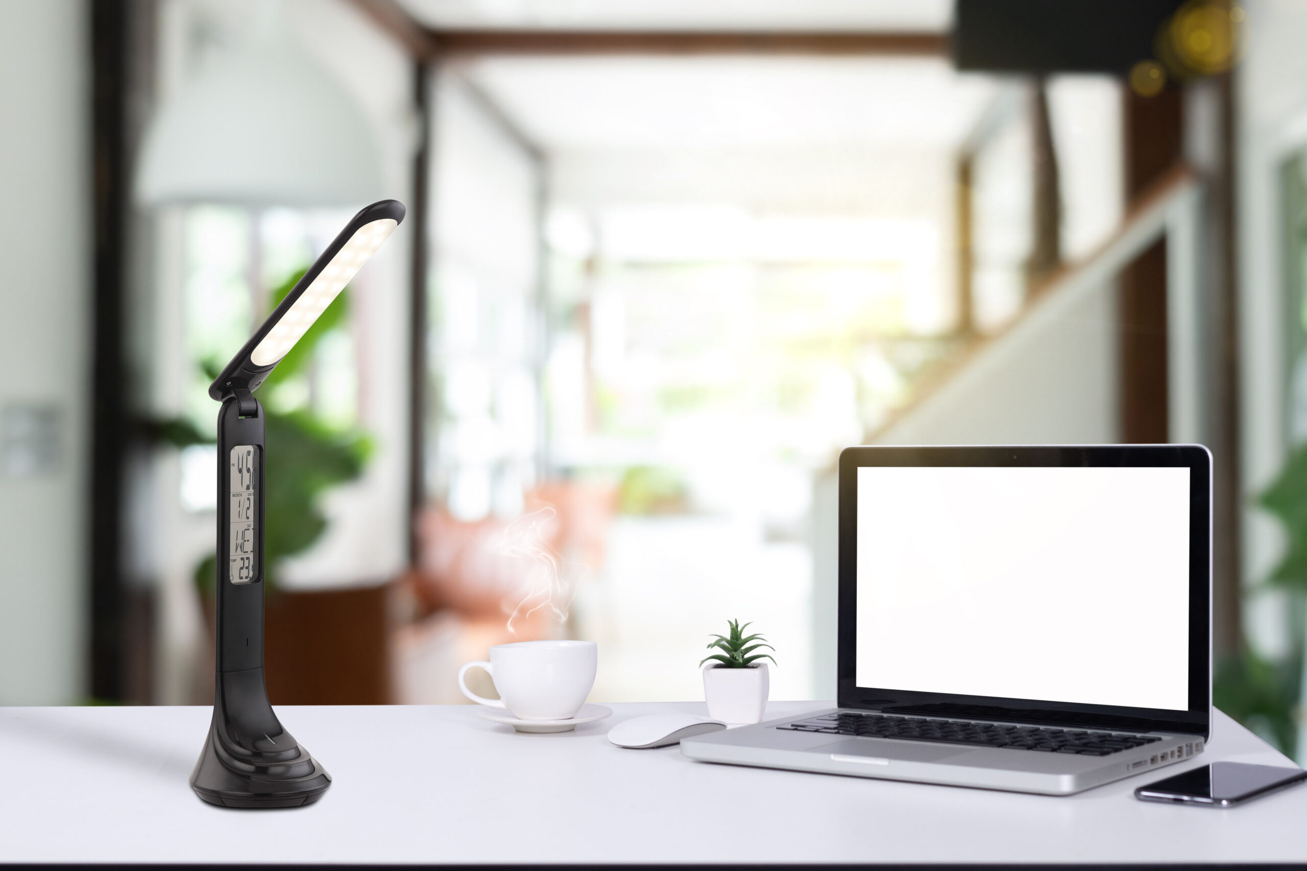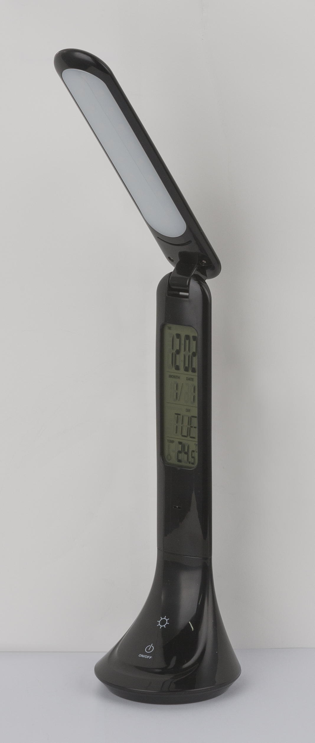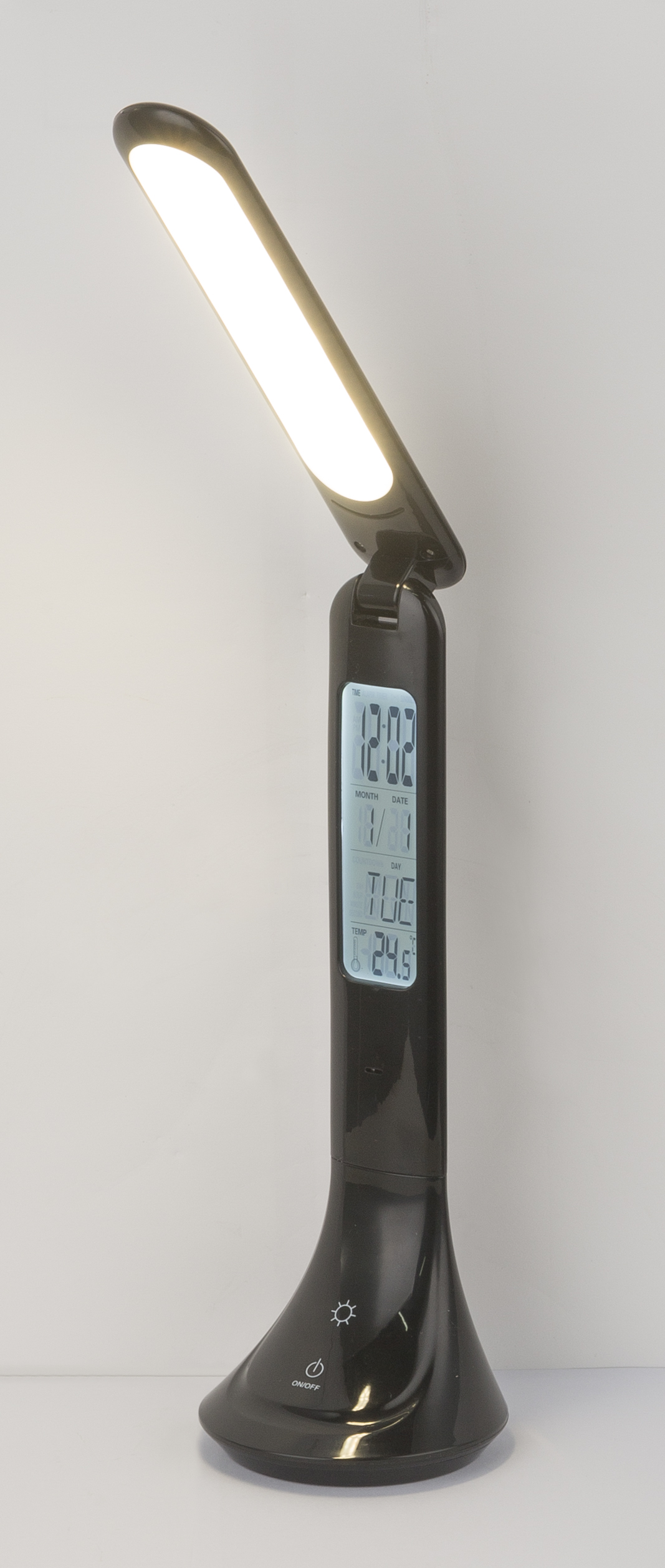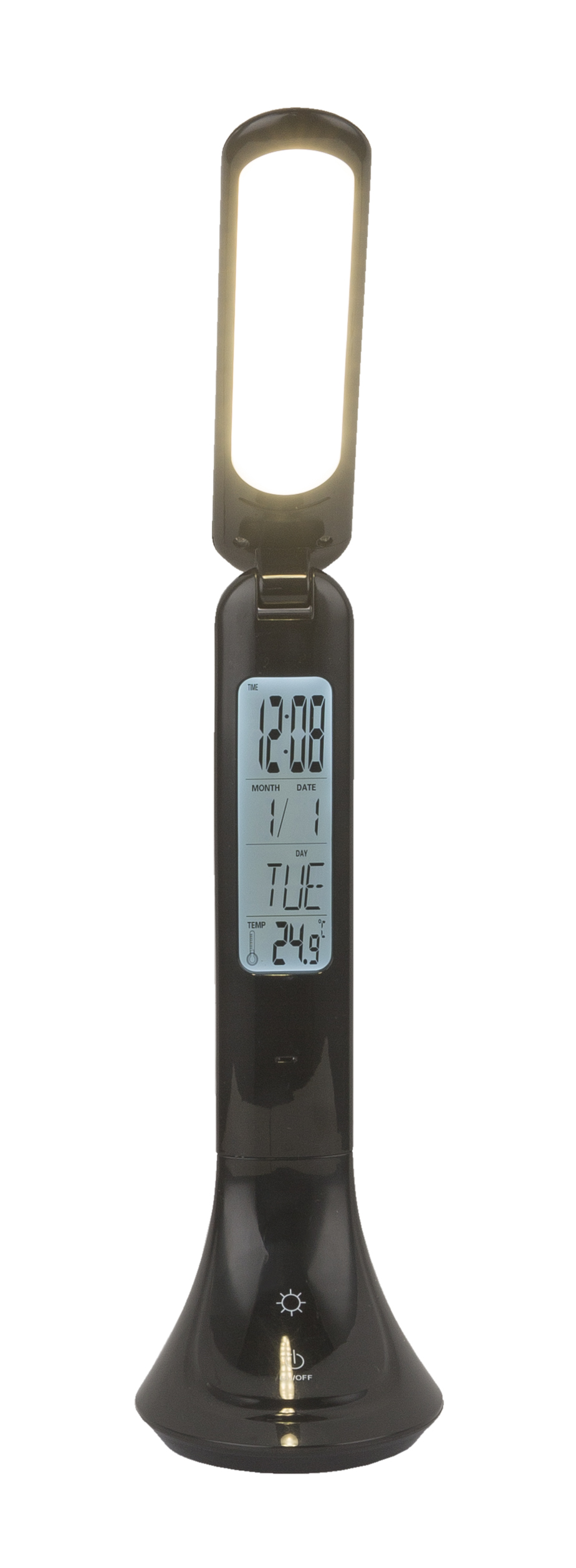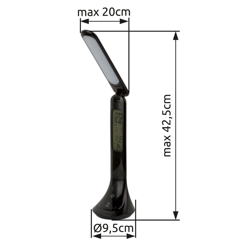 Ova sjajna stolna lampa ističe svojom funkcionalnošću. Koristeći ugrađeni dimer na dodir, osvetljenost se može regulisati u tri nivoa. Zaslon ugrađen u crno plastično kućište nudi vam mogućnost čitanja datuma pored vremena. Funkcija budilnika upotpunjuje paket usluga. Osvetljenjem displeja može se upravljati preko posebnog prekidača. Stolna lampa ima integrisane punjive baterije koje omogućavaju korišćenje van mreže.