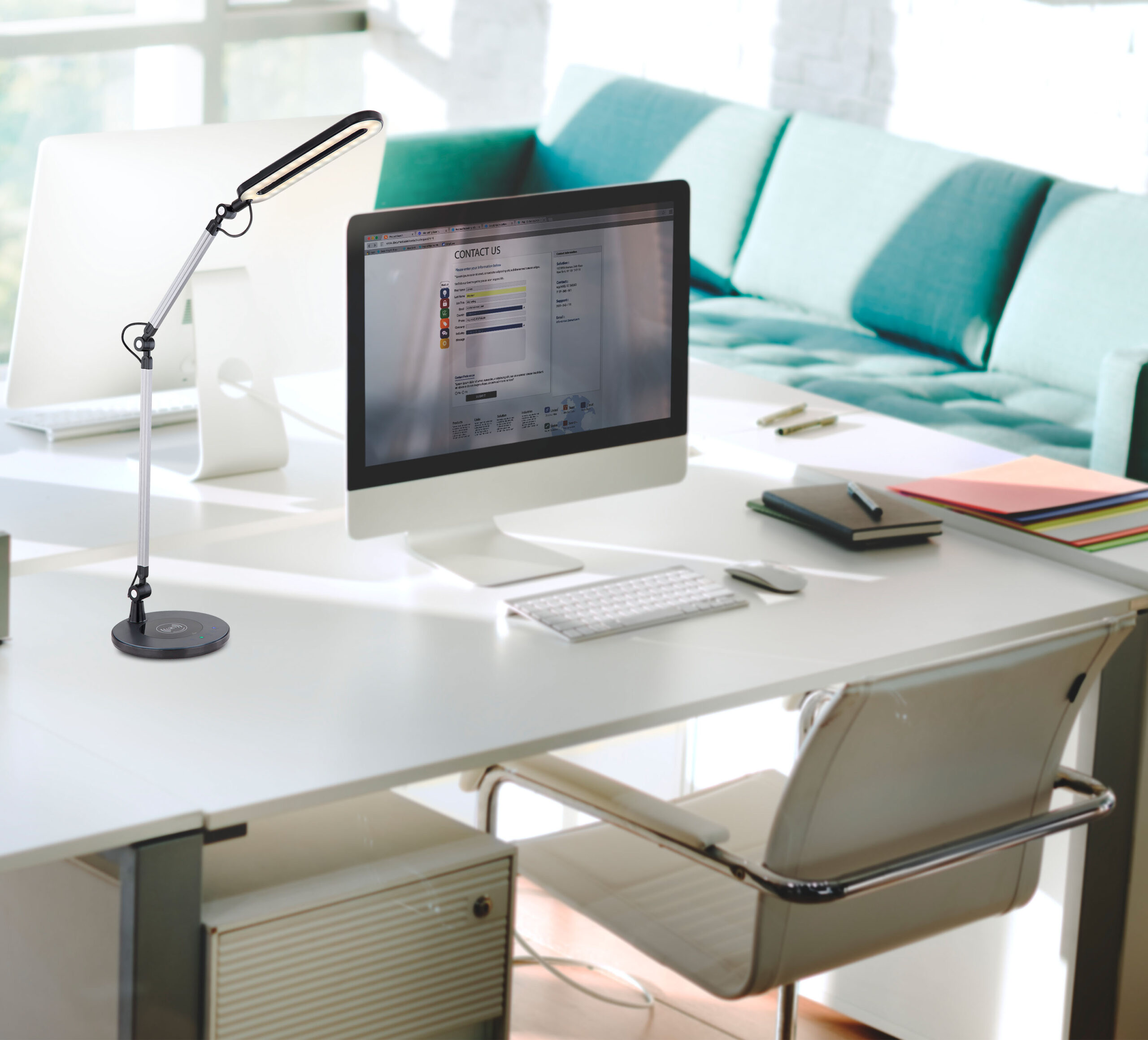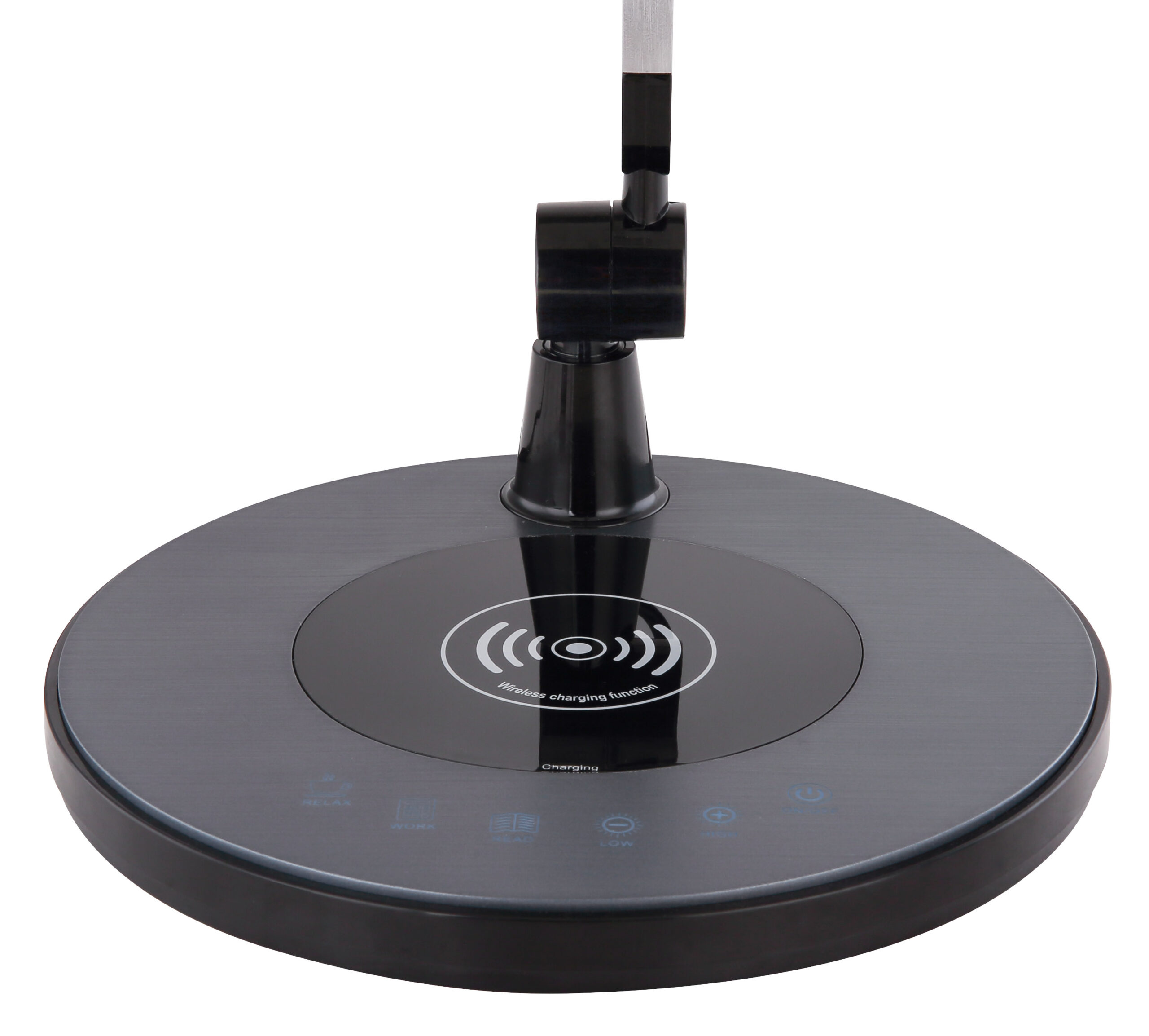 Ova stolna lampa od crnog i srebrnog metala može se fleksibilno koristiti zahvaljujući tri spojnice i kablu dužine 1,3 metra. Integrisana LED sijalica ima 480 lumena i može se prigušiti preko prigušivača na dodir, a boja svetla se može birati između toplo bele (3000 Kelvina), neutralne bele (4000 Kelvina) i hladno bele (6000 Kelvina). Stolna lampa se uključuje i gasi preko dodirnog prekidača, a možete puniti i svoj mobilni telefon putem funkcije bežičnog punjenja. Sa ovalnom glavom lampe, 107 cm visoka, 20 cm široka i 59,5 dugačka stolna lampa se uklapa u bilo koju modernu kancelariju, spavaću sobu ili dečiju sobu.