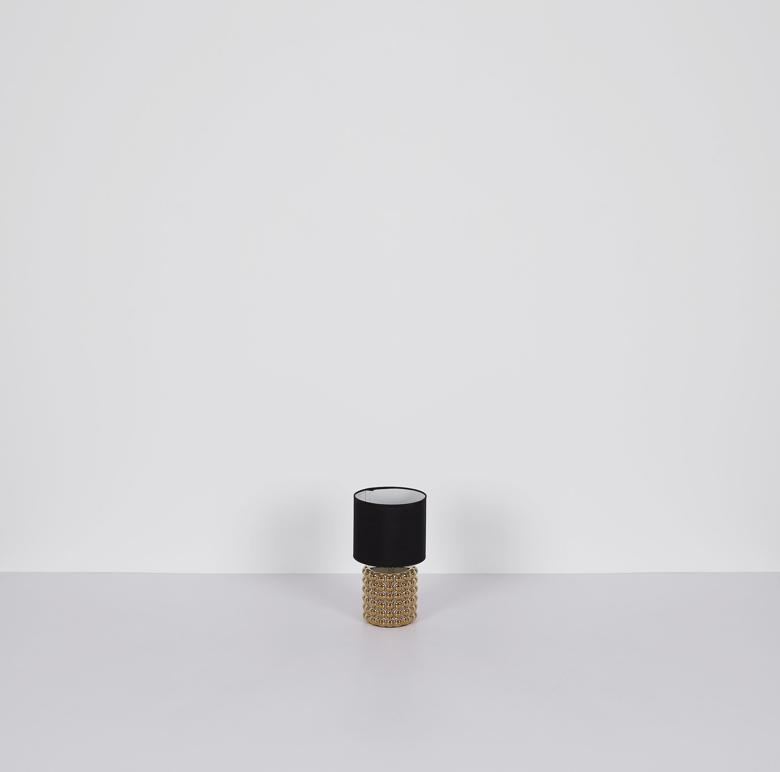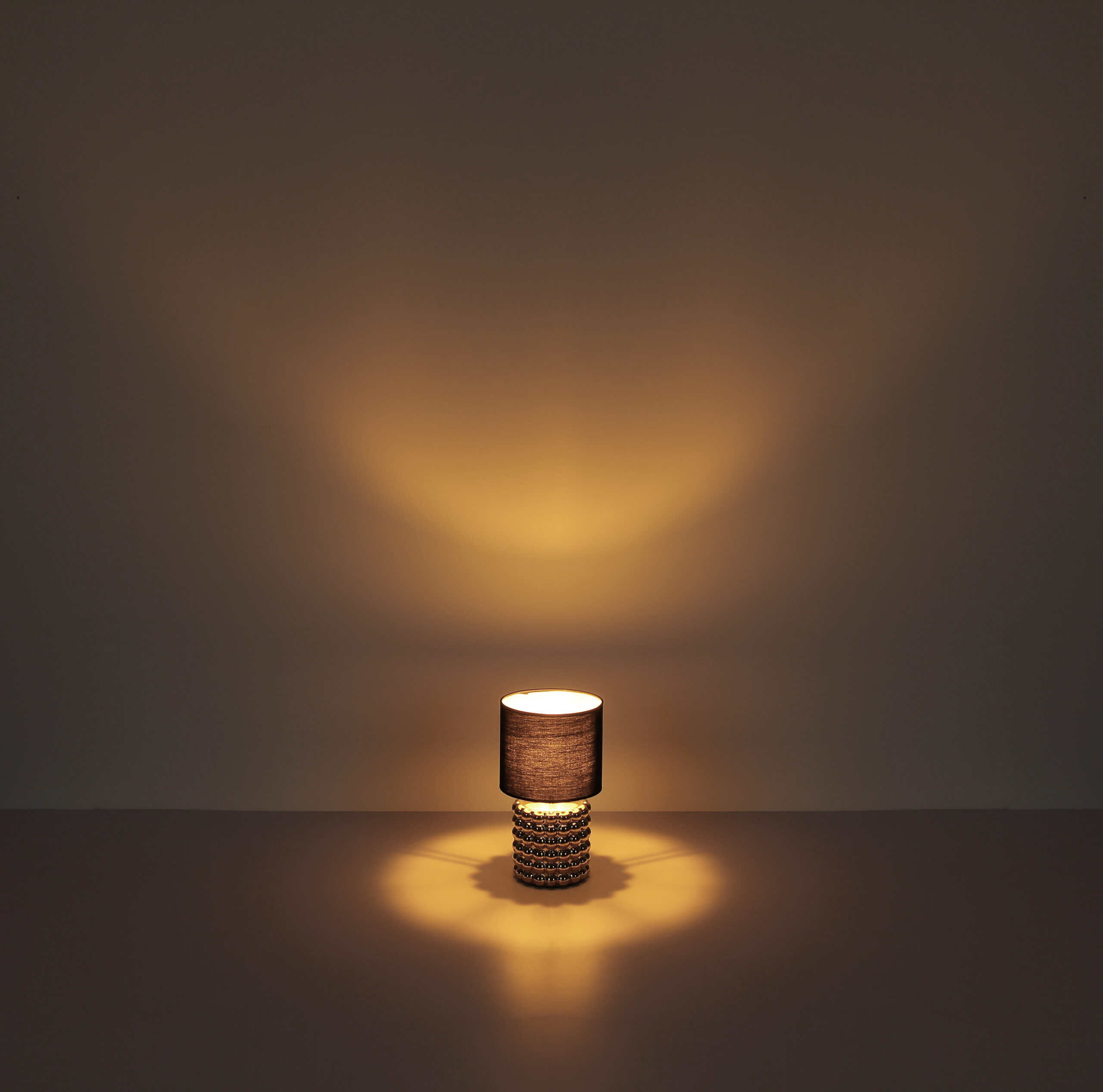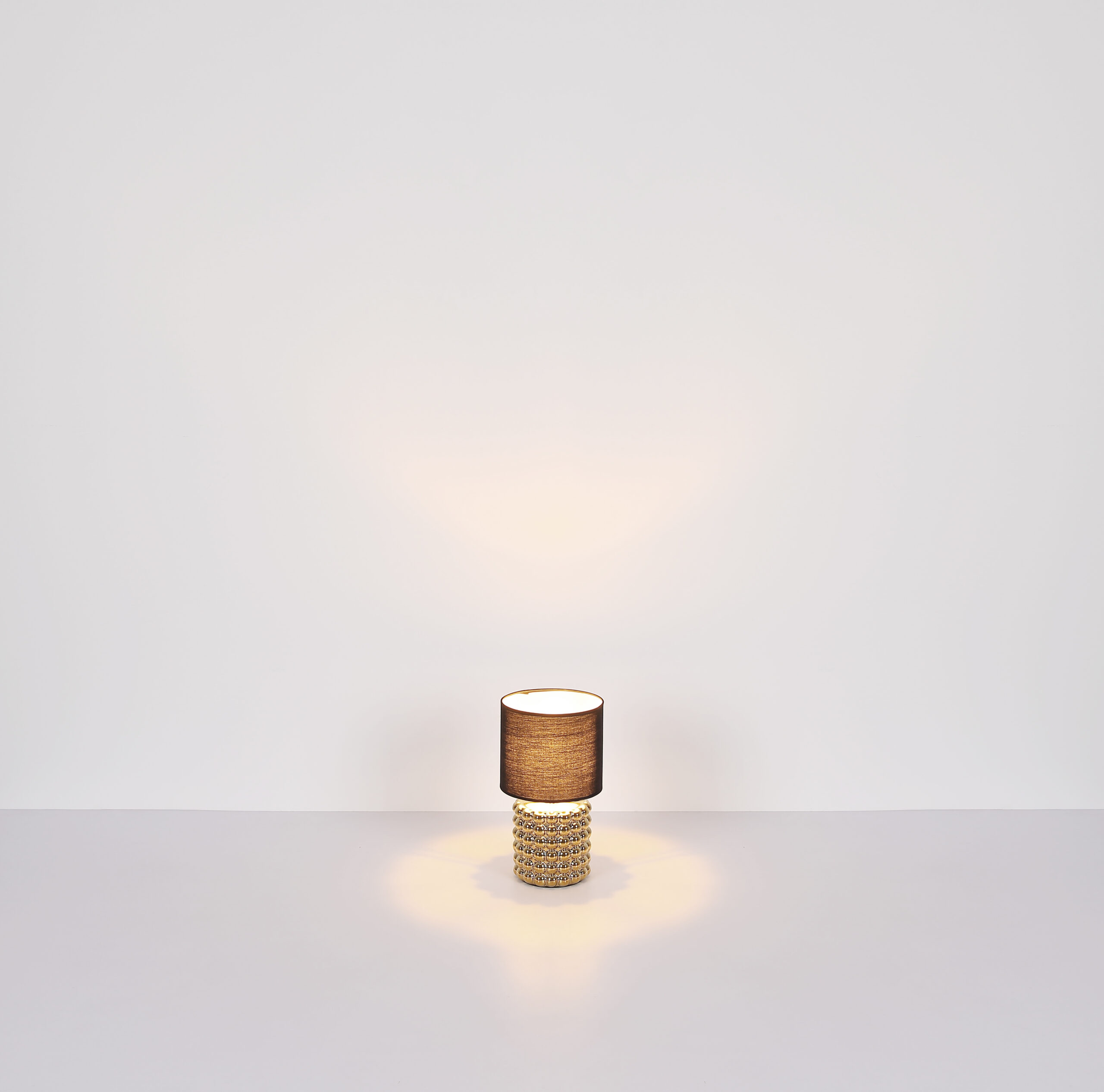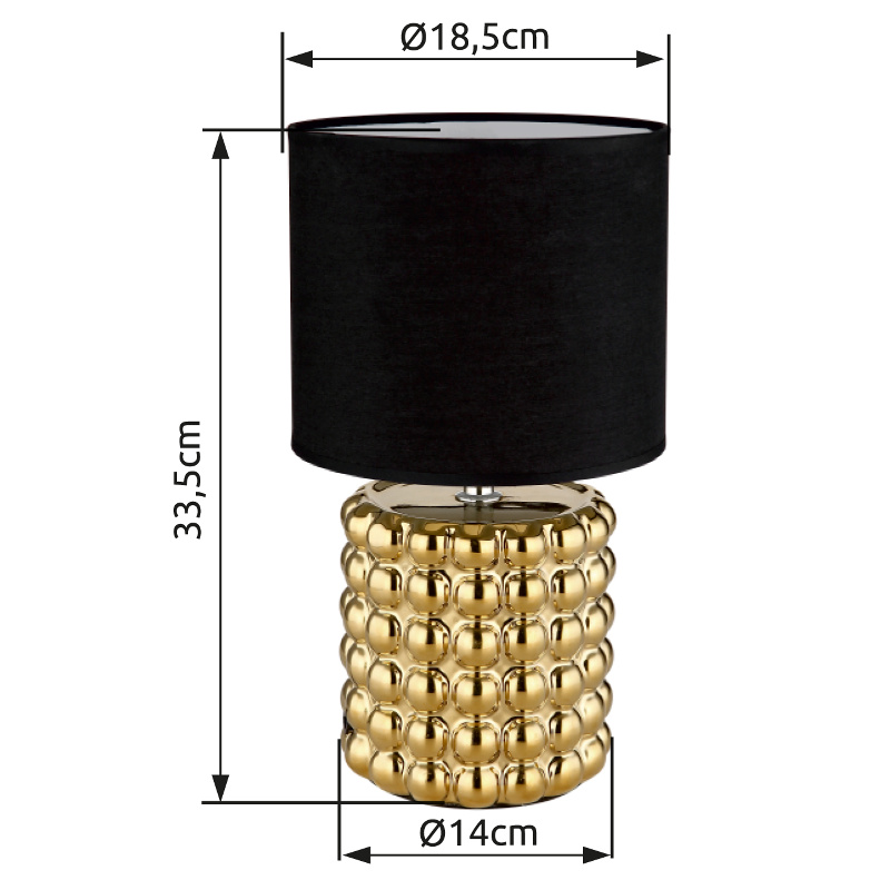 Ova oblikovana stolna lampa inspirira prekrasnim dizajnom. Na lijepoj nozi od keramike zlatne boje u obliku cilindra nalazi se utičnica E14 sjajne crne tekstilne nijanse (Ø 18,5 cm). E14 utičnica vam omogućava da sami odredite boju i svjetlinu do maksimalne snage od 40 vati. Zbog dugovečnosti i uštede energije preporučujemo LED sijalice.