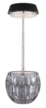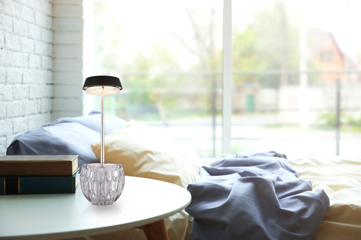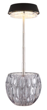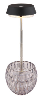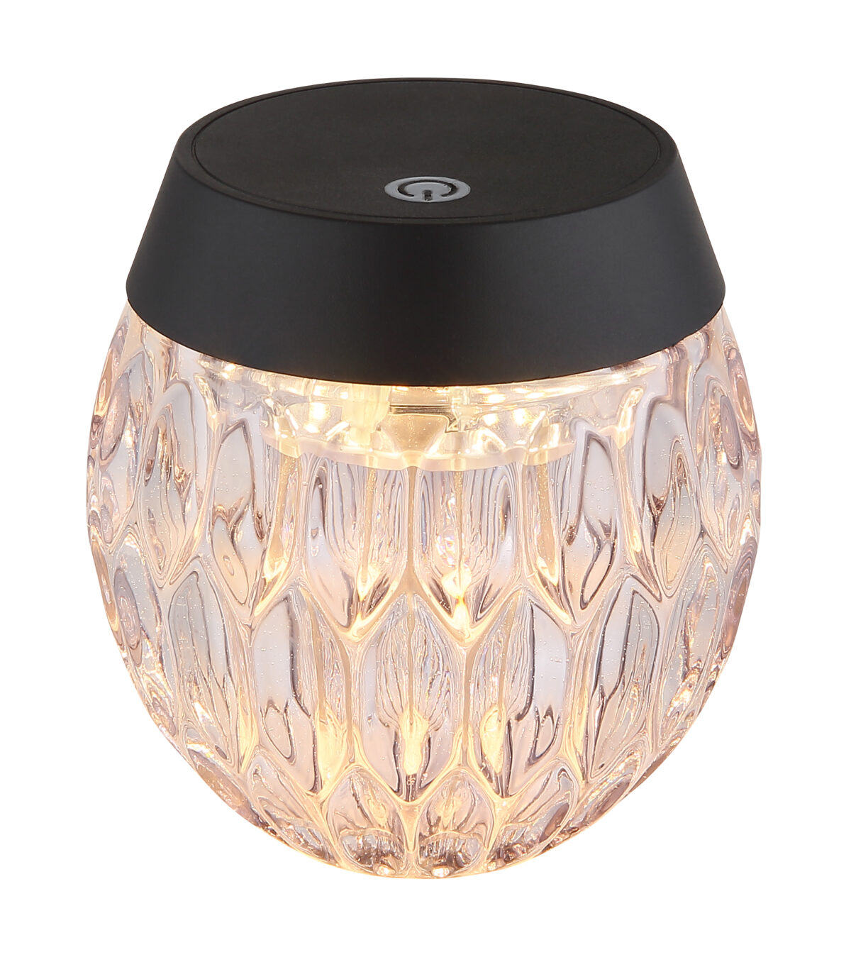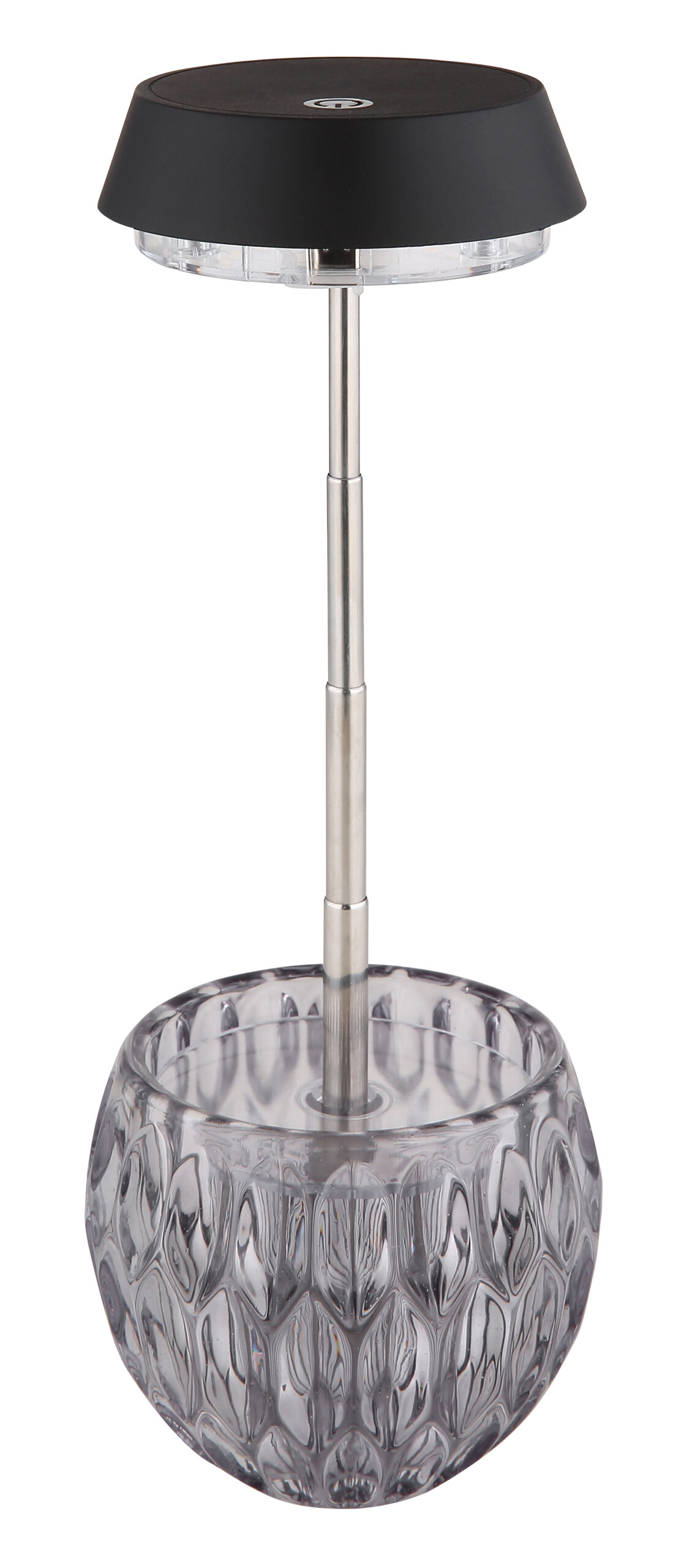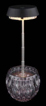 Stolna lampa WANDA kombinuje moderan dizajn sa praktičnim funkcijama. Njegovo okruglo tijelo od dimljenog stakla s bazom od nehrđajućeg čelika s kristalnim efektom daje mu elegantan izgled. Sjenilo je izrađeno od mat crne plastike i prozirne plastike za ravnomjernu distribuciju svjetlosti u prostoriji. Integrirani dimer na dodir omogućava kontinuirano podešavanje svjetline od 55 lumena na ugodnoj temperaturi boje od 3000 K. Teleskop je posebno praktičan, pomoću kojeg se visina lampe može individualno podesiti. WANDA stona lampa dolazi u kompletu sa adapterom i USB kablom za punjenje. Vrijeme punjenja je oko 4 sata, tokom kojih se lampa može koristiti i u radu. Nakon potpunog punjenja, nudi vrijeme gorenja od približno 6 sati. Ova stolna lampa je idealna za moderne dnevne prostore i stvara ugodnu atmosferu svojim toplim svjetlom i atraktivnim dizajnom.