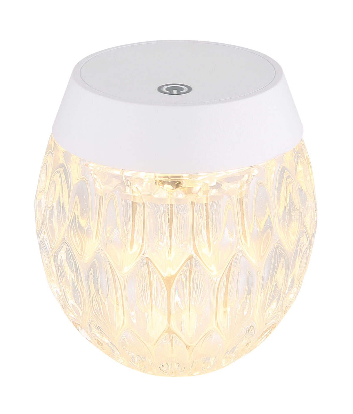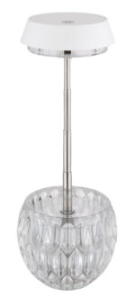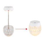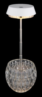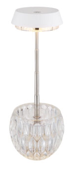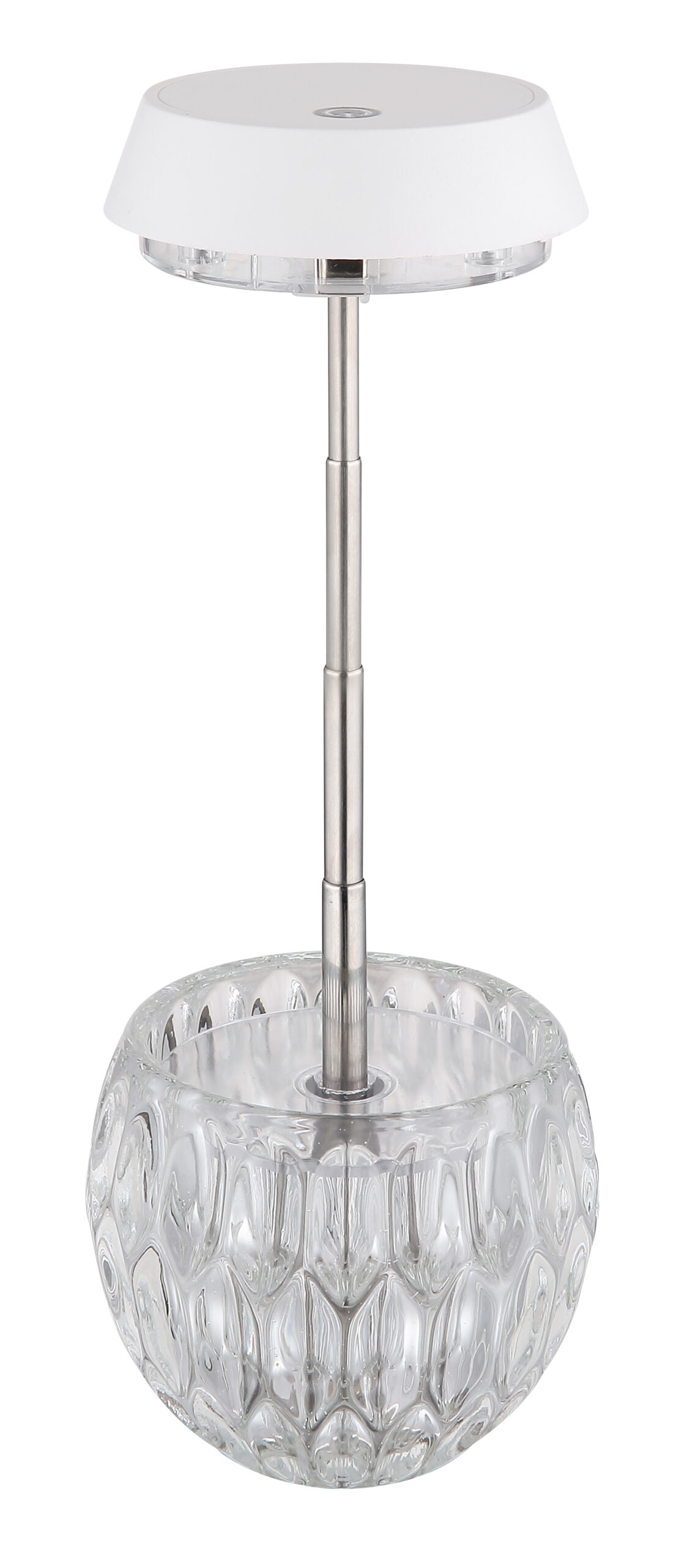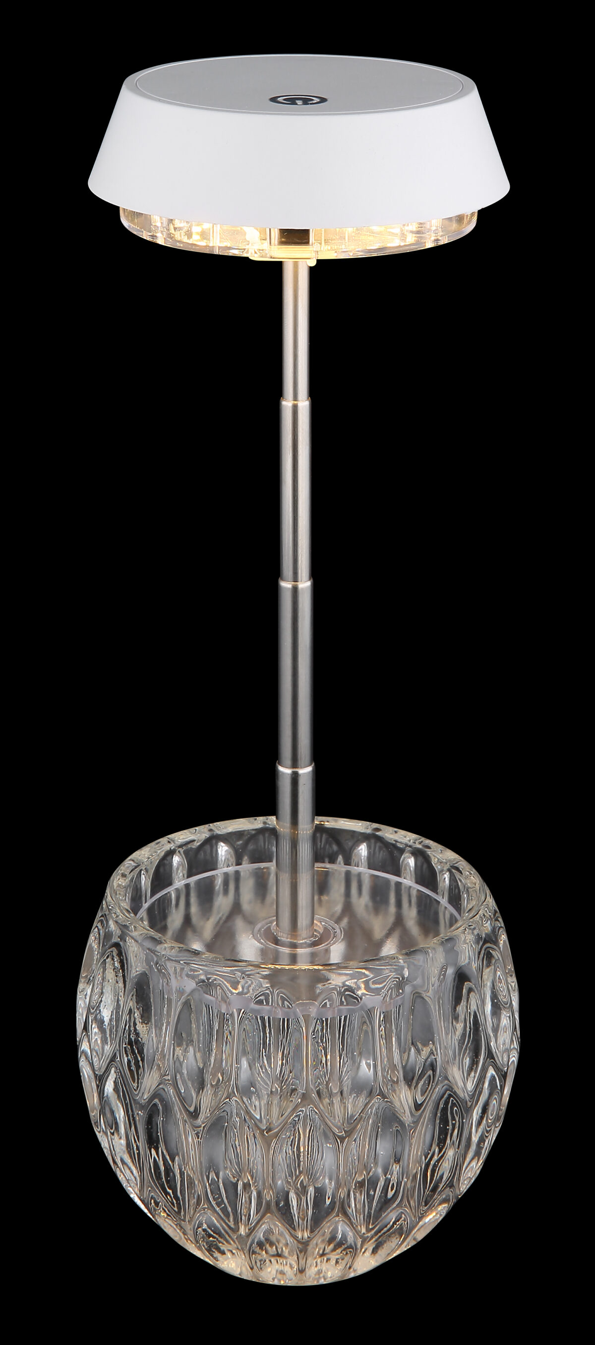 WANDA stolna lampa kombinuje bezvremenski dizajn sa praktičnom funkcionalnošću. Njegovo okruglo kućište od prozirnog stakla sa postoljem od nerđajućeg čelika sa kristalnim efektom daje mu elegantan dodir. Sjenilo je izrađeno od mat bijele plastike, dopunjeno prozirnom plastikom za ravnomjernu distribuciju svjetlosti. Integrirani dimer na dodir omogućava kontinuirano podešavanje svjetline od 55 lumena na ugodnoj temperaturi boje od 3000 K. Teleskop je posebno praktičan, pomoću kojeg se visina lampe može individualno podesiti. WANDA stona lampa dolazi u kompletu sa adapterom i USB kablom za punjenje. Vrijeme punjenja je oko 4 sata, tokom kojih se lampa može koristiti i u radu. Nakon potpunog punjenja, nudi vrijeme gorenja od približno 6 sati. Ova stolna lampa je idealna za moderne dnevne prostore i stvara ugodnu atmosferu svojim toplim svjetlom i atraktivnim dizajnom.