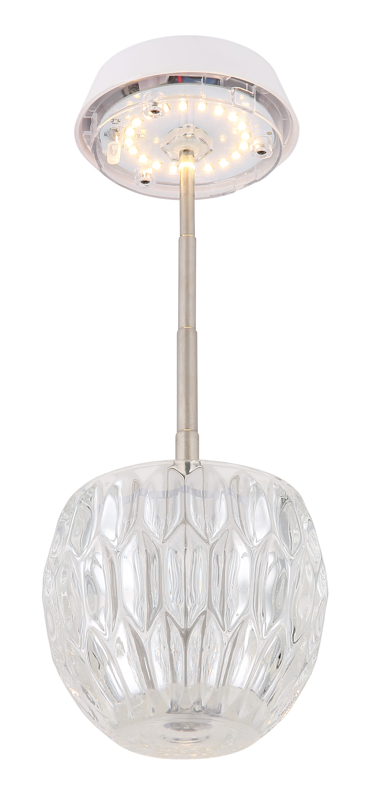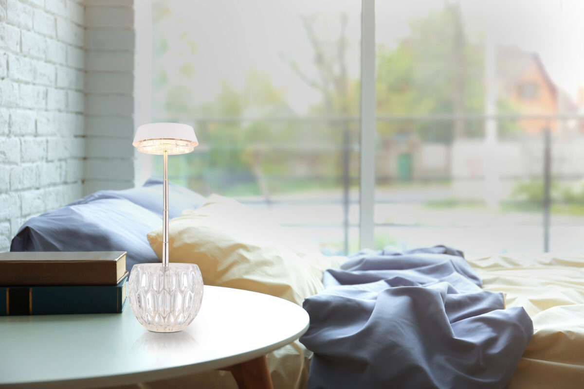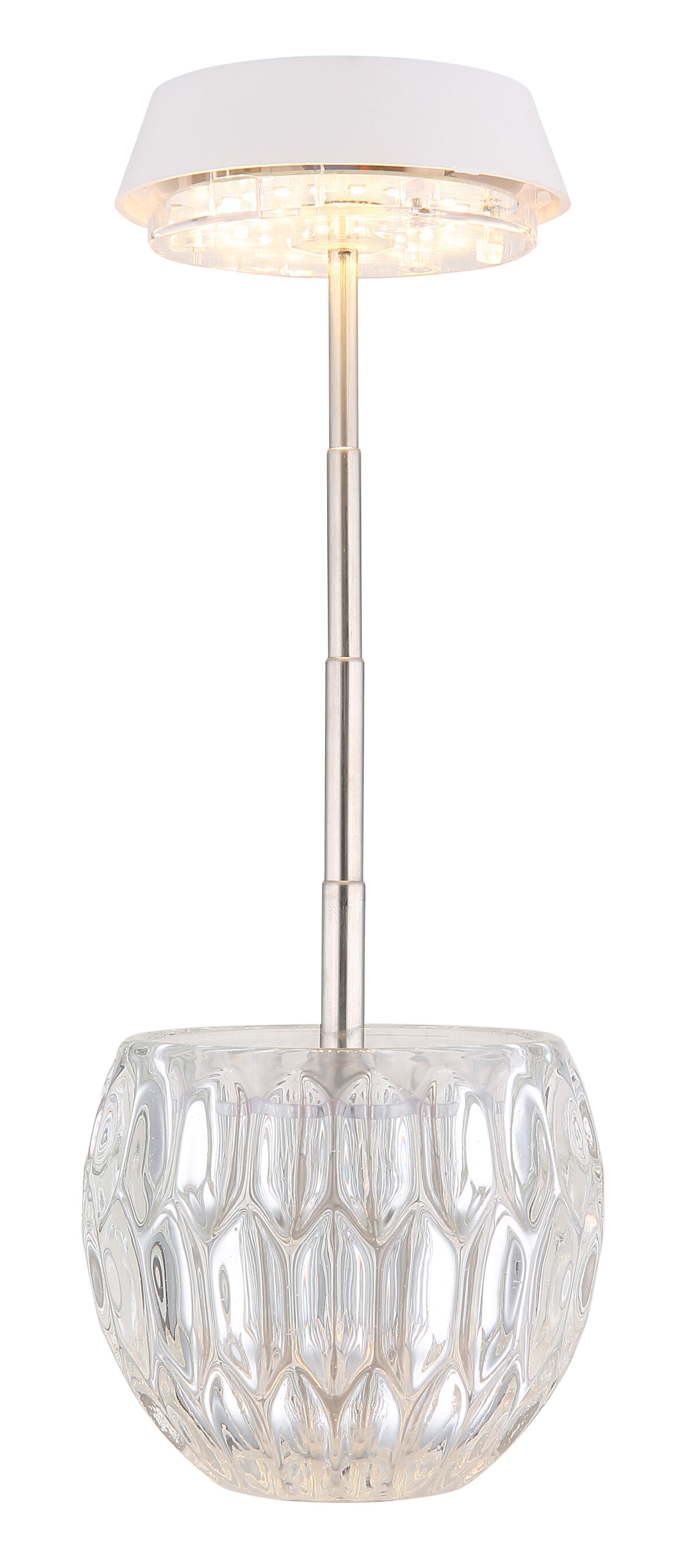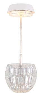 WANDA stolna lampa kombinuje bezvremenski dizajn sa praktičnom funkcionalnošću. Njegovo okruglo kućište od prozirnog stakla sa postoljem od nerđajućeg čelika sa kristalnim efektom daje mu elegantan dodir. Sjenilo je izrađeno od mat bijele plastike, dopunjeno prozirnom plastikom za ravnomjernu distribuciju svjetlosti. Integrirani dimer na dodir omogućava kontinuirano podešavanje svjetline od 55 lumena na ugodnoj temperaturi boje od 3000 K. Teleskop je posebno praktičan, pomoću kojeg se visina lampe može individualno podesiti. WANDA stona lampa dolazi u kompletu sa adapterom i USB kablom za punjenje. Vrijeme punjenja je oko 4 sata, tokom kojih se lampa može koristiti i u radu. Nakon potpunog punjenja, nudi vrijeme gorenja od približno 6 sati. Ova stolna lampa je idealna za moderne dnevne prostore i stvara ugodnu atmosferu svojim toplim svjetlom i atraktivnim dizajnom.