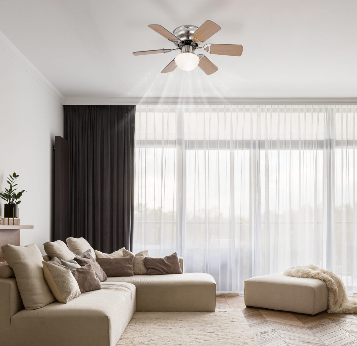 I ljeti i zimi, ovaj klasično dizajnirani stropni ventilator osigurava efikasnu cirkulaciju zraka u prostoriji. Ovaj model karakteriše jednostavno upravljanje putem povlačne sklopke, kojom se mogu podesiti tri različite brzine. Zahvaljujući prečniku od 76 cm, ovaj ventilator se može lako koristiti u prostorijama do 12 m². U izradi modela korišteni su materijali poput hroma i stakla. Šest elegantnih obostrano upotrebljivih lopatica ima s jedne strane boju javora, a s druge grafitni izgled, i mogu se koristiti po želji.