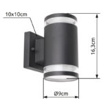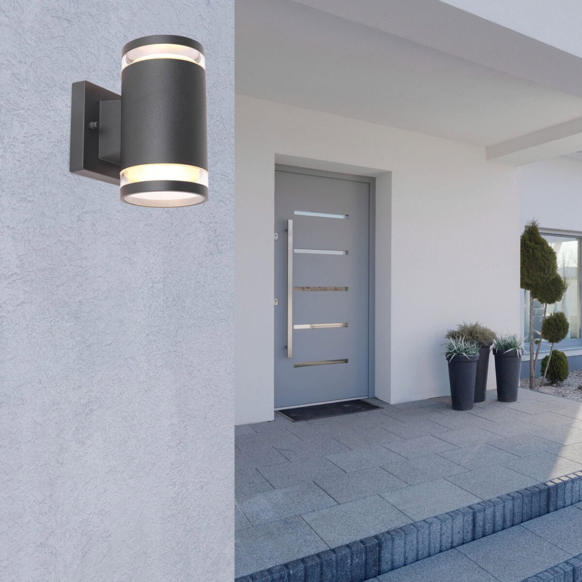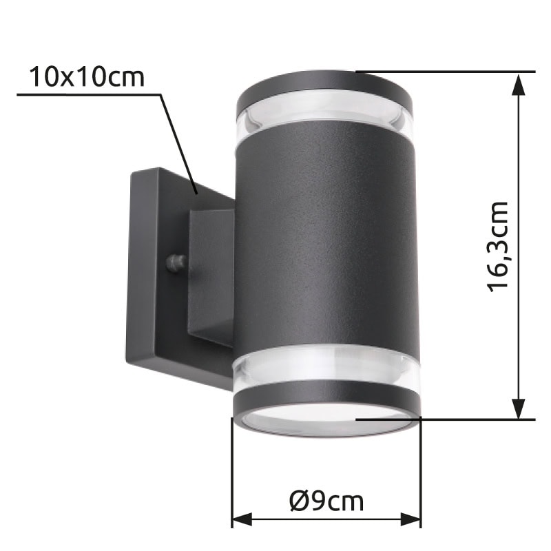 Moderna vanjska svjetiljka ALCALA, izrađena od aluminija, spaja modernost i funkcionalnost. Ova zidna lampa u klasičnom antracit stilu može biti opremljena sijalicama po vašem izboru zahvaljujući grlu GX53 (max.11W). Zbog uštede energije i dugovečnosti preporučujemo LED lampe. Dodatna karakteristika vanjskog svjetla je da svijetli gore i dolje. Zbog svog IP44 stepena zaštite, ova svetiljka je predodređena za spoljašnju upotrebu. Više svjetiljki za vaš vanjski prostor možete pronaći u istoj seriji proizvoda.