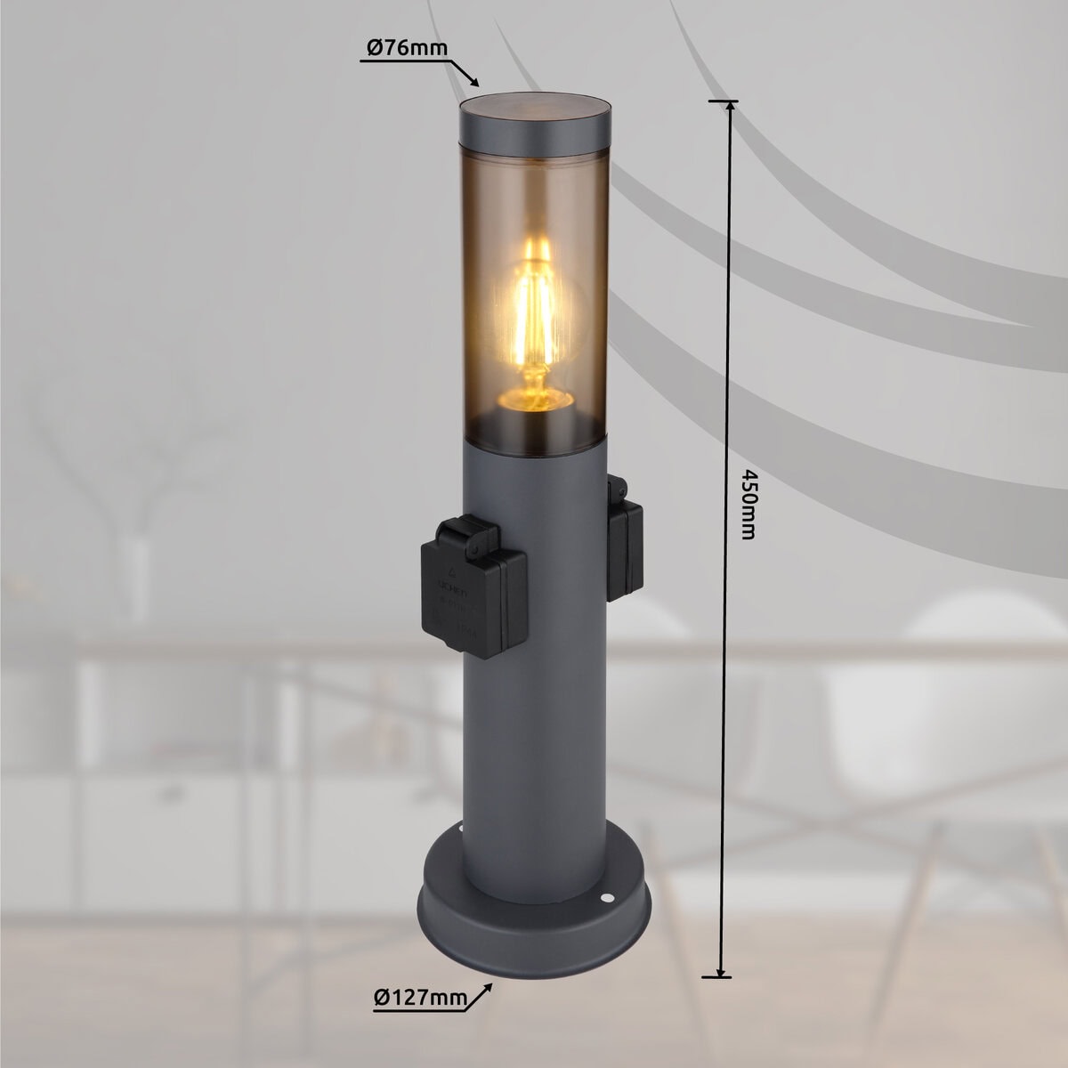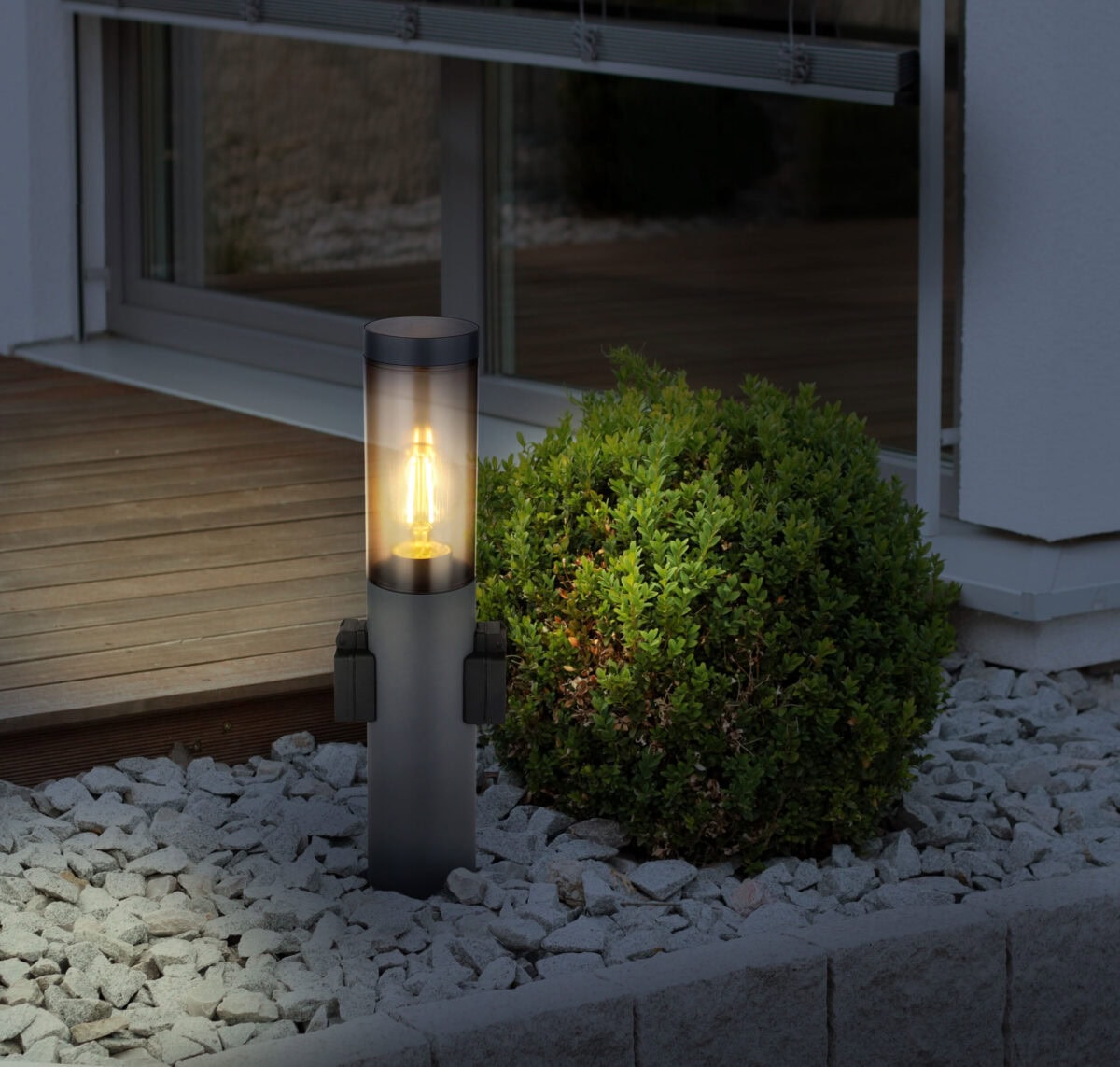 Ovu elegantnu lampu na postolju iz serije Boston karakterizira stilski dizajn i odlična izrada. Oblikovana vanjska lampa je idealna za upotrebu na otvorenom zbog svog IP44 stepena zaštite. Ovaj model je izrađen od nerđajućeg čelika i plastike u antracit boji i ukupne je veličine 45cm. Lampa je opremljena grlom E27 i omogućava vam da koristite sijalicu (maks. 23W) po vašem izboru. Zbog njihove uštede energije i izdržljivosti preporučujemo LED lampe. Dodatni plus su dvije integrirane utičnice. Sa ostalim lampama na postolju i zidnim lampama iz iste serije proizvoda možete upotpuniti sliku.