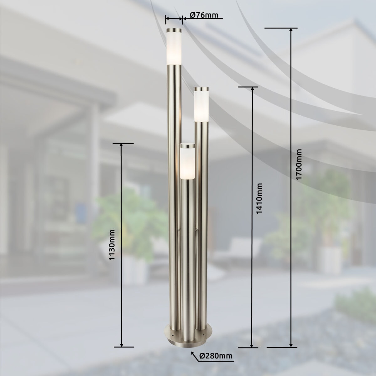 Ova elegantna bazna lampa, iz serije Boston, odlikuje se svojim izvanrednim dizajnom i odličnom izradom. Zbog svog IP44 stepena zaštite, ova podna lampa je idealna za spoljašnju upotrebu. Ovaj model se sastoji od tri lampe različite visine i ukupne je veličine 1,7 metara. Ova vanjska lampa ima tri grla E27 i stoga vam omogućava da koristite sijalicu po vašem izboru (max.60W). Zbog uštede energije i dugovečnosti preporučujemo LED lampe. Sa drugim baznim i zidnim lampama iz iste serije proizvoda možete upotpuniti sliku.