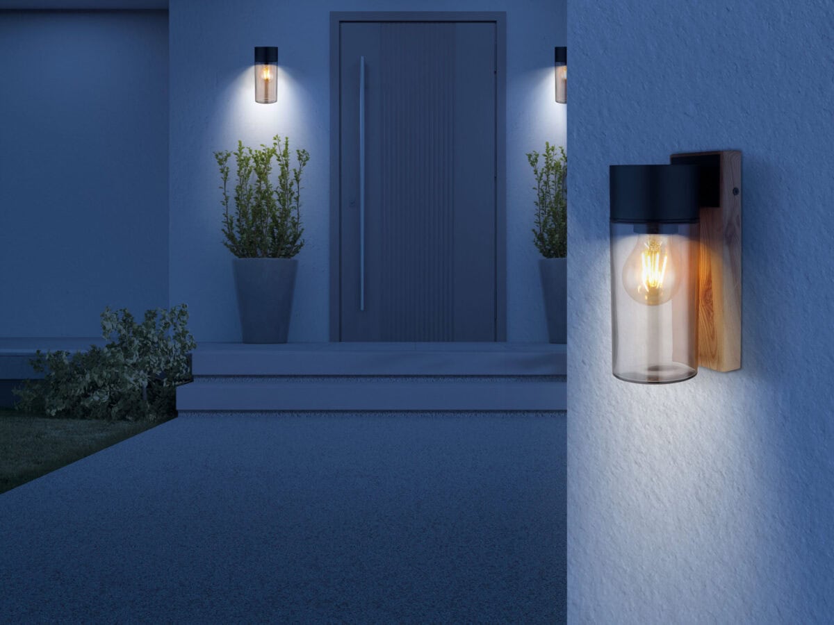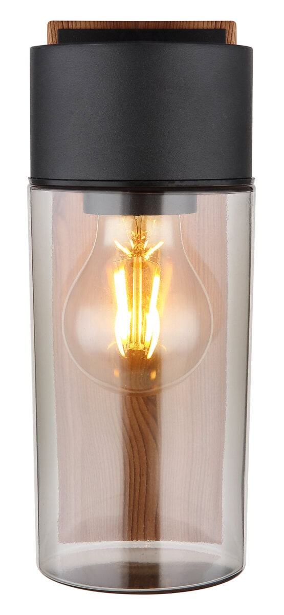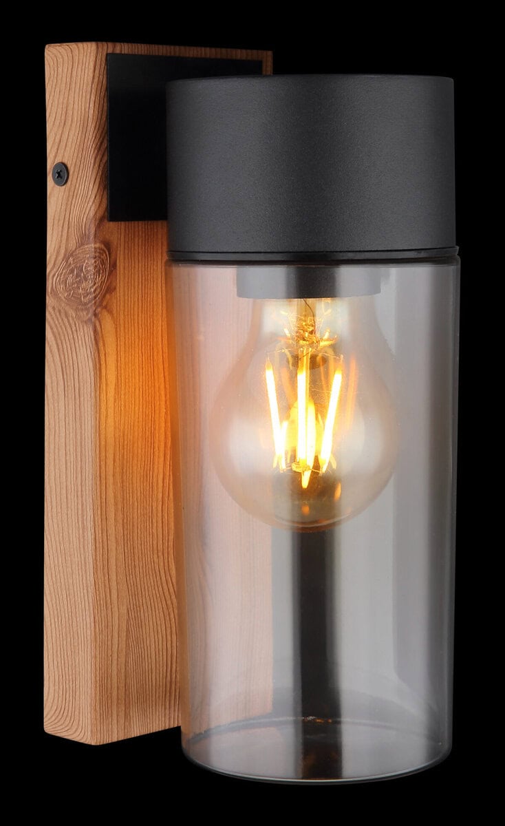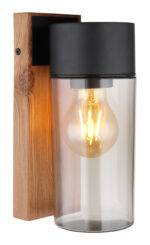 Ova sjajna vanjska lampa impresionira svojim modernim dizajnom. Na pravougaonom zidnom držaču u izgledu drveta nalazi se cilindrična, zadimljena staklena sjenila s ukrasima od nehrđajućeg čelika i E27 utičnica sa prepustom od 12,4 cm. E27 utičnica vam omogućava da sami odredite boju svjetla i svjetlinu do maksimalne snage od 40 vati. Zbog dugovečnosti i uštede energije preporučujemo LED sijalice.