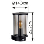 Vanjska lampa serije GRACEY ima kućište izrađeno od crnog mat nehrđajućeg čelika i stakleno sjenilo u boji dima. Metalne šipke koje okružuju sjenilo su također mat crne. Svetlost lampe je usmerena prema gore. Stepen zaštite svetiljke je IP54. Dimenzije svetiljke su ŠxV: 143x252mm, a visina ugradnje je 152mm. Lampa je namijenjena za žarulju sa žarnom niti E27 sa maksimalno 60W i 230V. Ovo nije uključeno u obim isporuke i mora se kupiti zasebno.