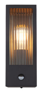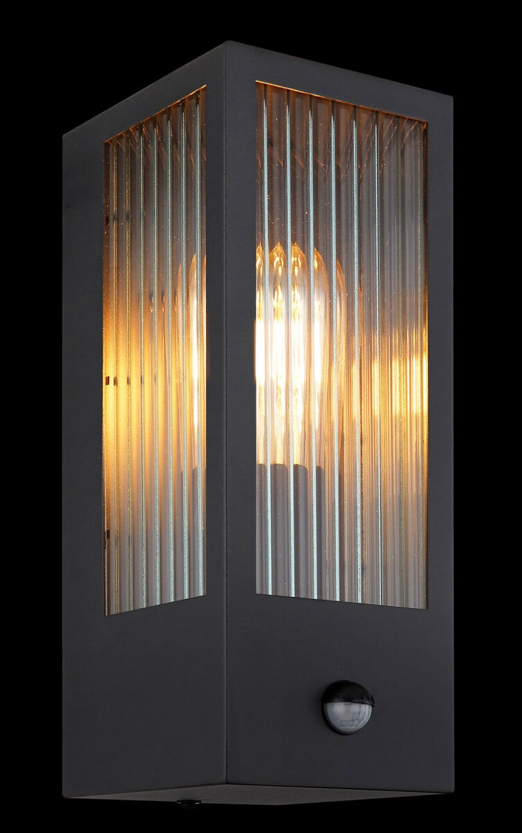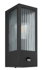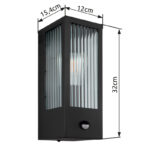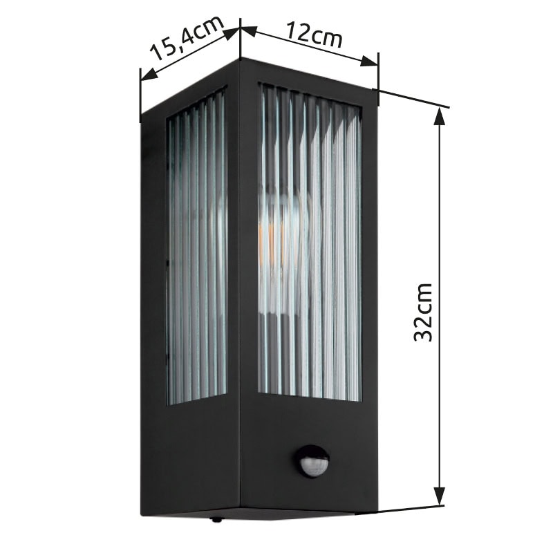 Ova moderna vanjska lampa uvjerava svojim prekrasnim dizajnom od stakla i metala. Lampa u crnoj boji se sastoji od pravougaonog metalnog kaveza (12x32cm) i prelijepe staklene stijene sa ukrasima sa svake strane. E27 utičnica vam omogućava da odredite boju svjetla i svjetlinu do maksimalno 60 vati. Još jedan vrhunac ove svetiljke je integrisani senzor, koji reaguje na dometu od 4-8 m i 110°. Stepen zaštite IP44 od prskanja vode osigurava postavljanje svjetiljke na otvorenom.