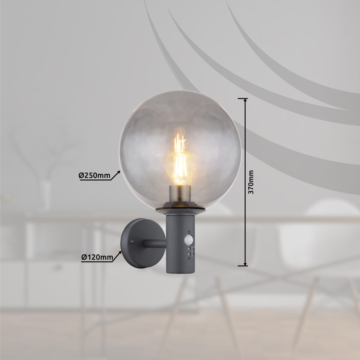 Ova vanjska lampa iz serije Hedwig (ø 25 cm) uvjerava svojim jednostavnim dizajnom od nehrđajućeg čelika boje antracita. Vanjska svjetiljka od 37 cm ima zadimljenu staklenu kuglu koja pokriva E27 grlo svjetiljke. Možete ih opremiti odgovarajućom LED sijalicom po vašem izboru, što vam daje mogućnost da individualno odredite boju svjetla i svjetlinu. Takođe ima uključen detektor pokreta. S više članaka iz iste serije možete upotpuniti cjelokupnu sliku vašeg vanjskog prostora.