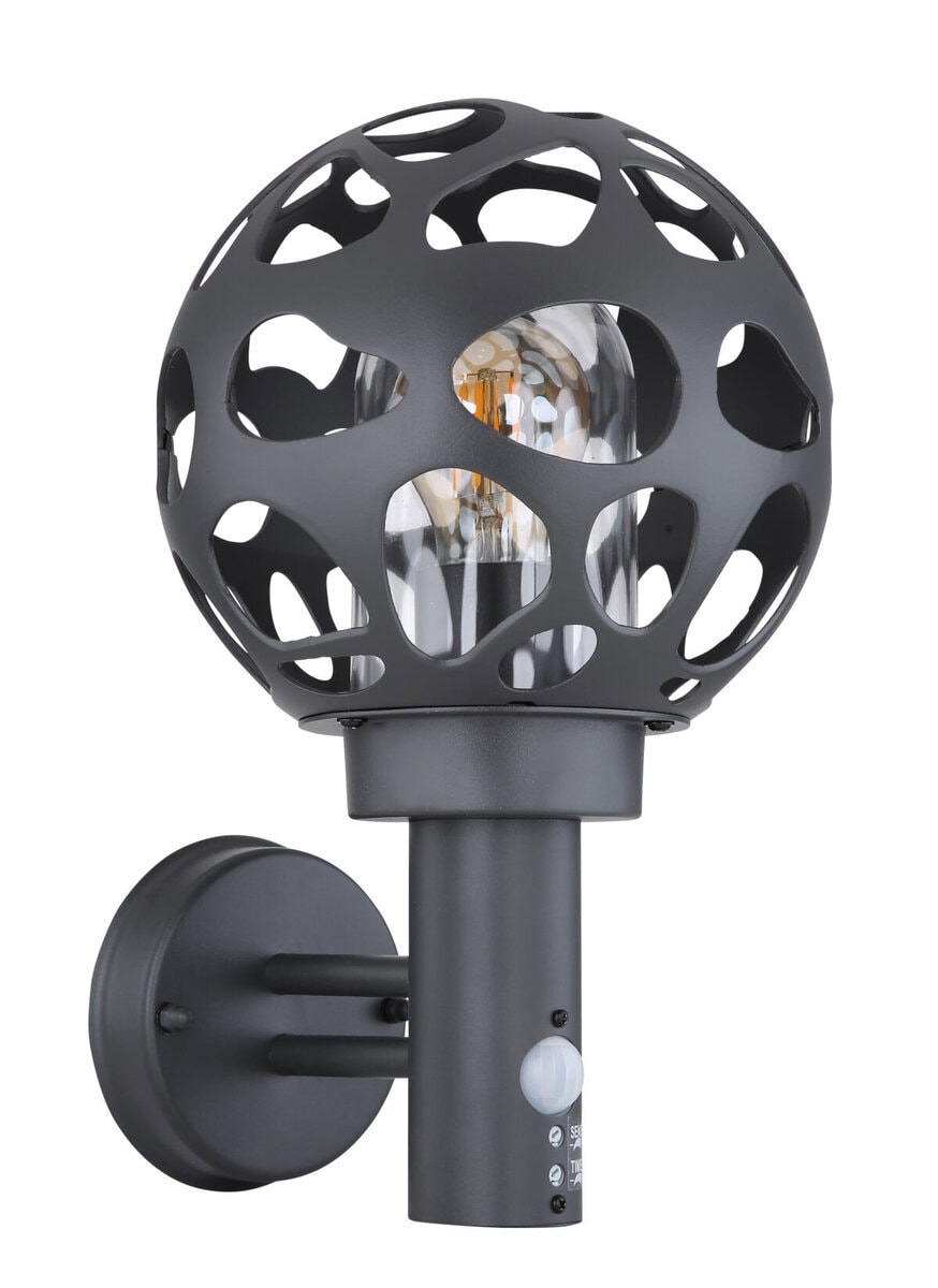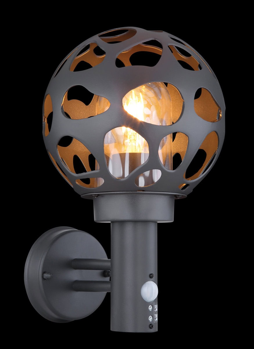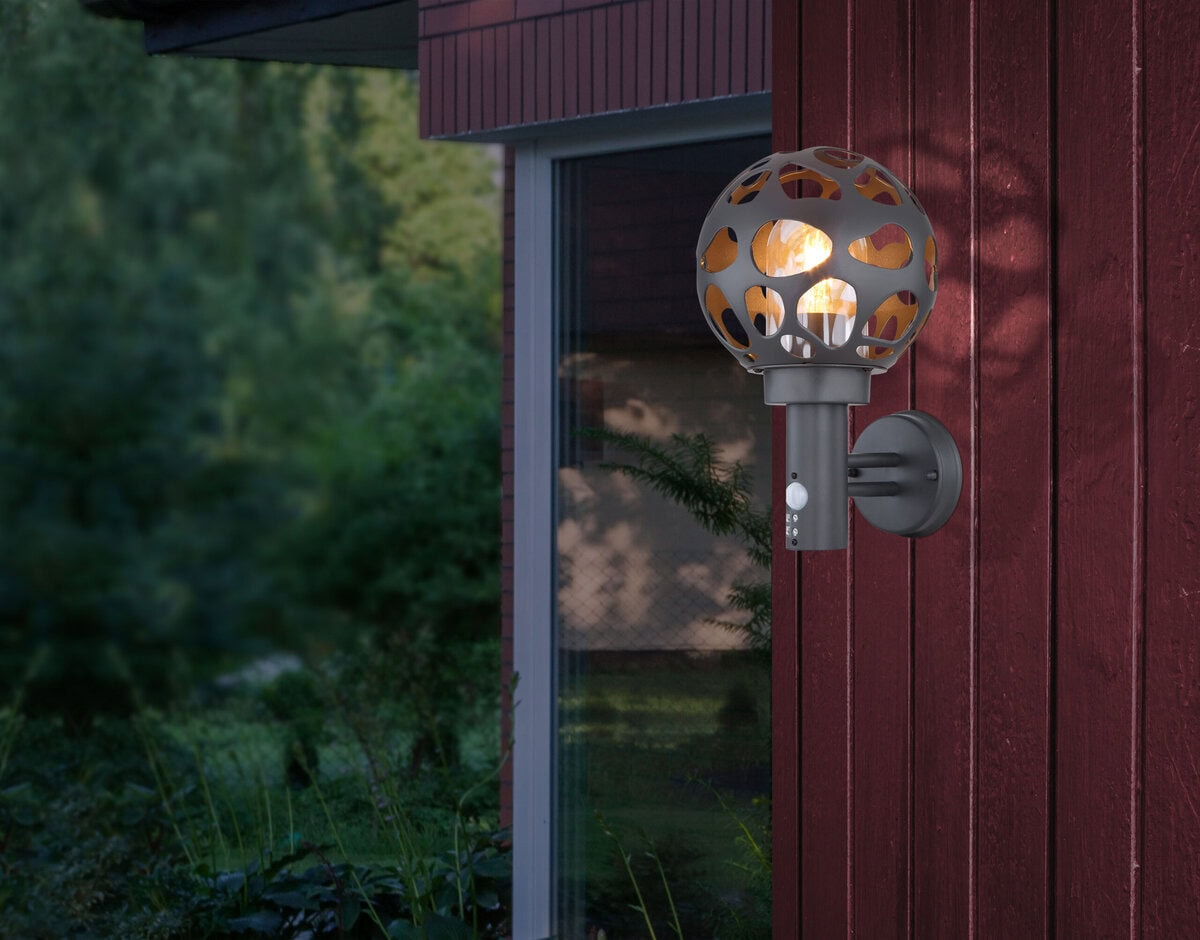 Vanjska svjetiljka HILARIO od antraciranog nehrđajućeg čelika je vrlo elegantna i moderna. Zbog ukrasnih izbočina, ovaj model postaje prava privlačnost na vašoj terasi ili ulaznom prostoru. Štaviše, lampa ima integrisan detektor pokreta sa sledećim svojstvima H: 1,8-2,5m, 90°, max 8m. Zbog klase zaštite IP44, svjetiljka je otporna na prskanje vode i idealna je za upotrebu na otvorenom. Sijalice (osim 1xE27 LED 15W) mogu se odabrati po želji kako bi se postigao savršen rezultat osvjetljenja.