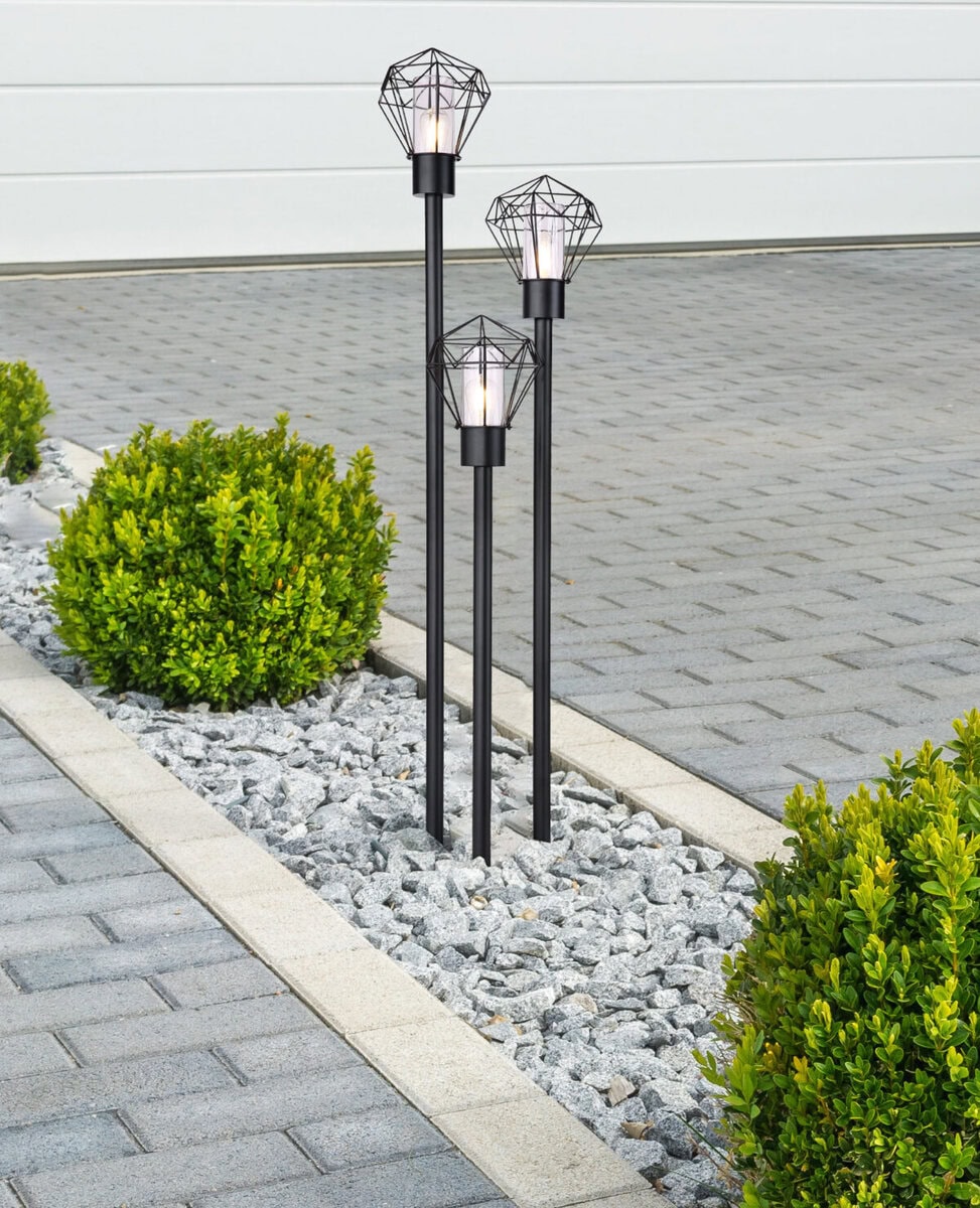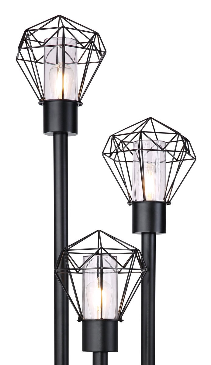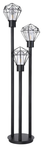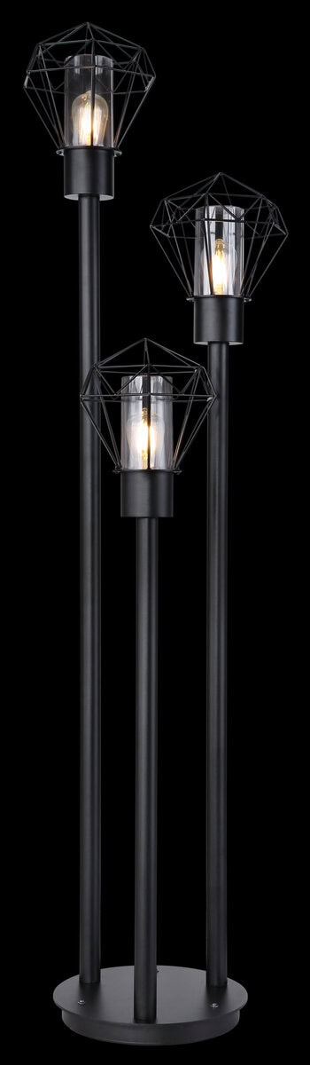 Crna lampa od nerđajućeg čelika savršeno se uklapa u svaki vrt. Poklopac je izrađen od prozirne plastike i idealan je za upotrebu na otvorenom zbog stepena zaštite IP 44. Lampa je široka 44,2 cm, visoka 170 cm i pruža ugodno svjetlo kroz rešetkaste metalne sjenila. Tri sijalice sa grlom E 27 mogu se slobodno birati do 3x15W. Preporučujemo korištenje LED žarulje za još veću održivost.