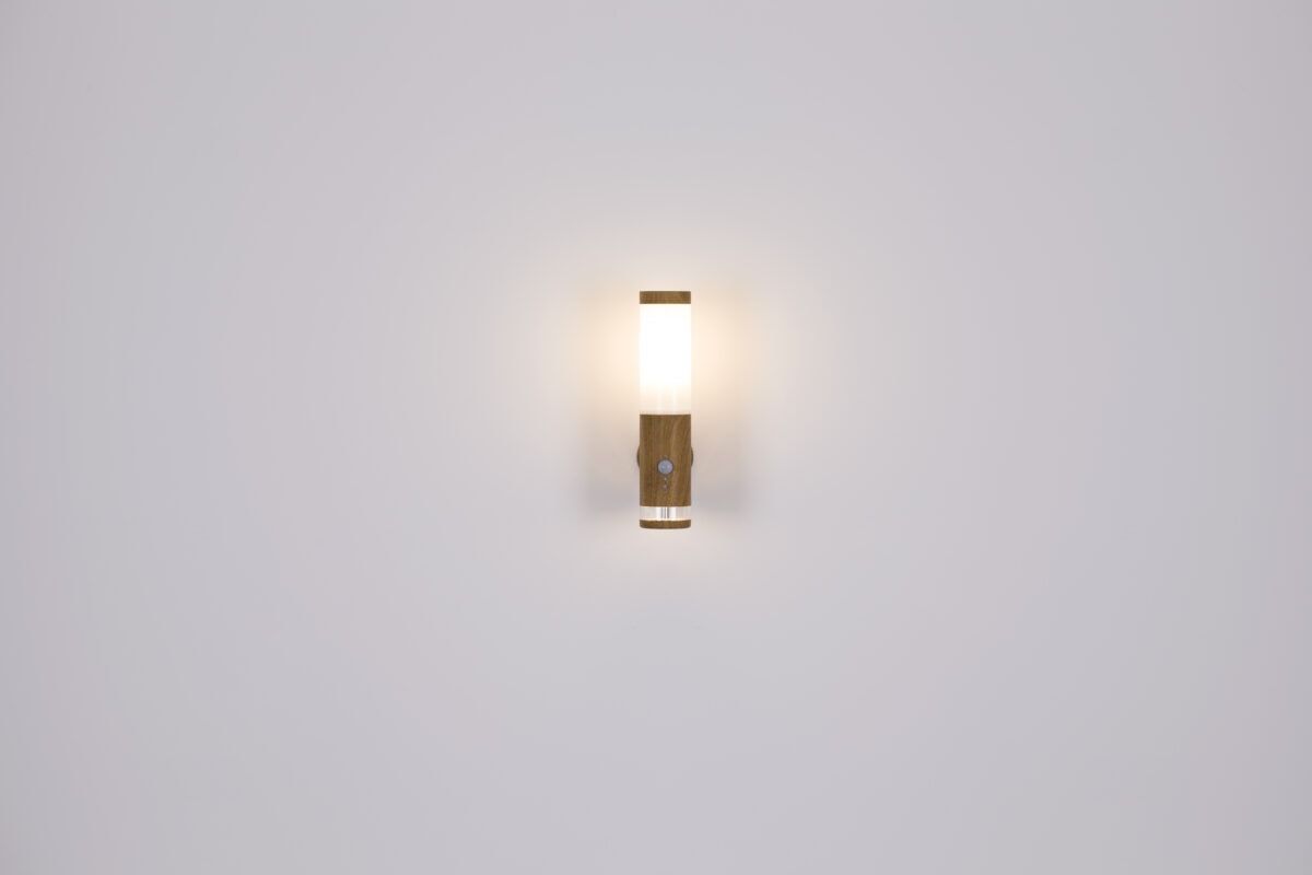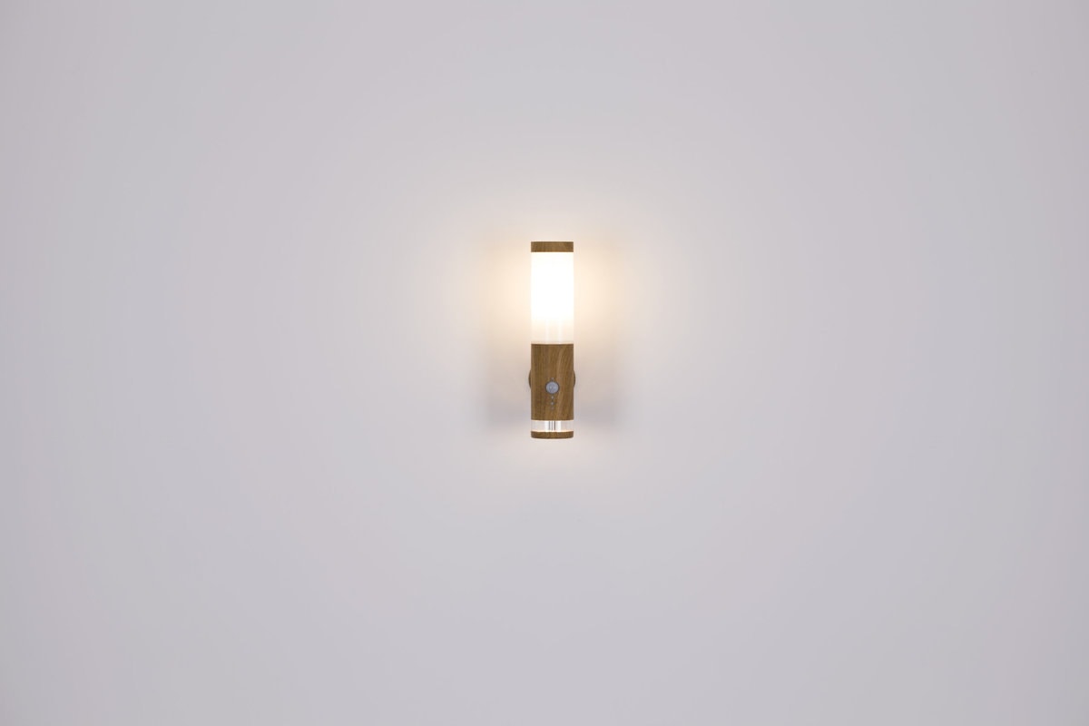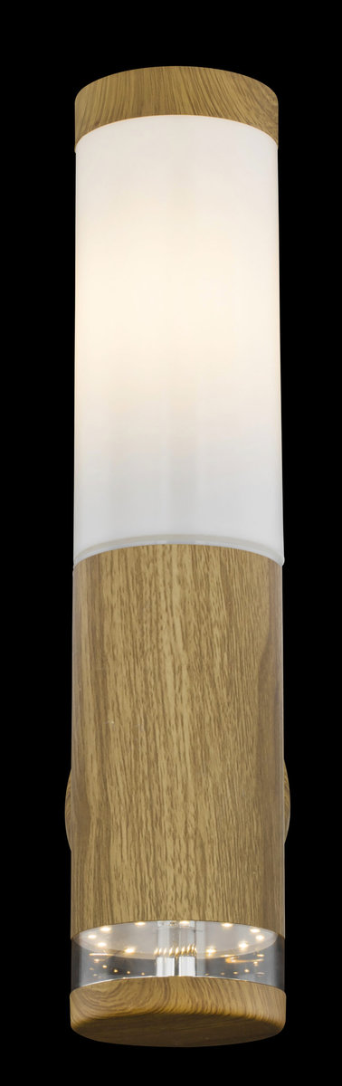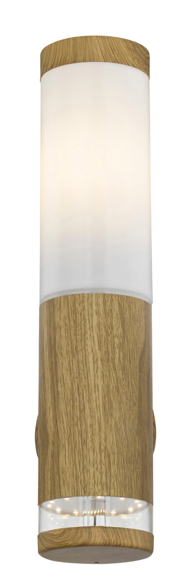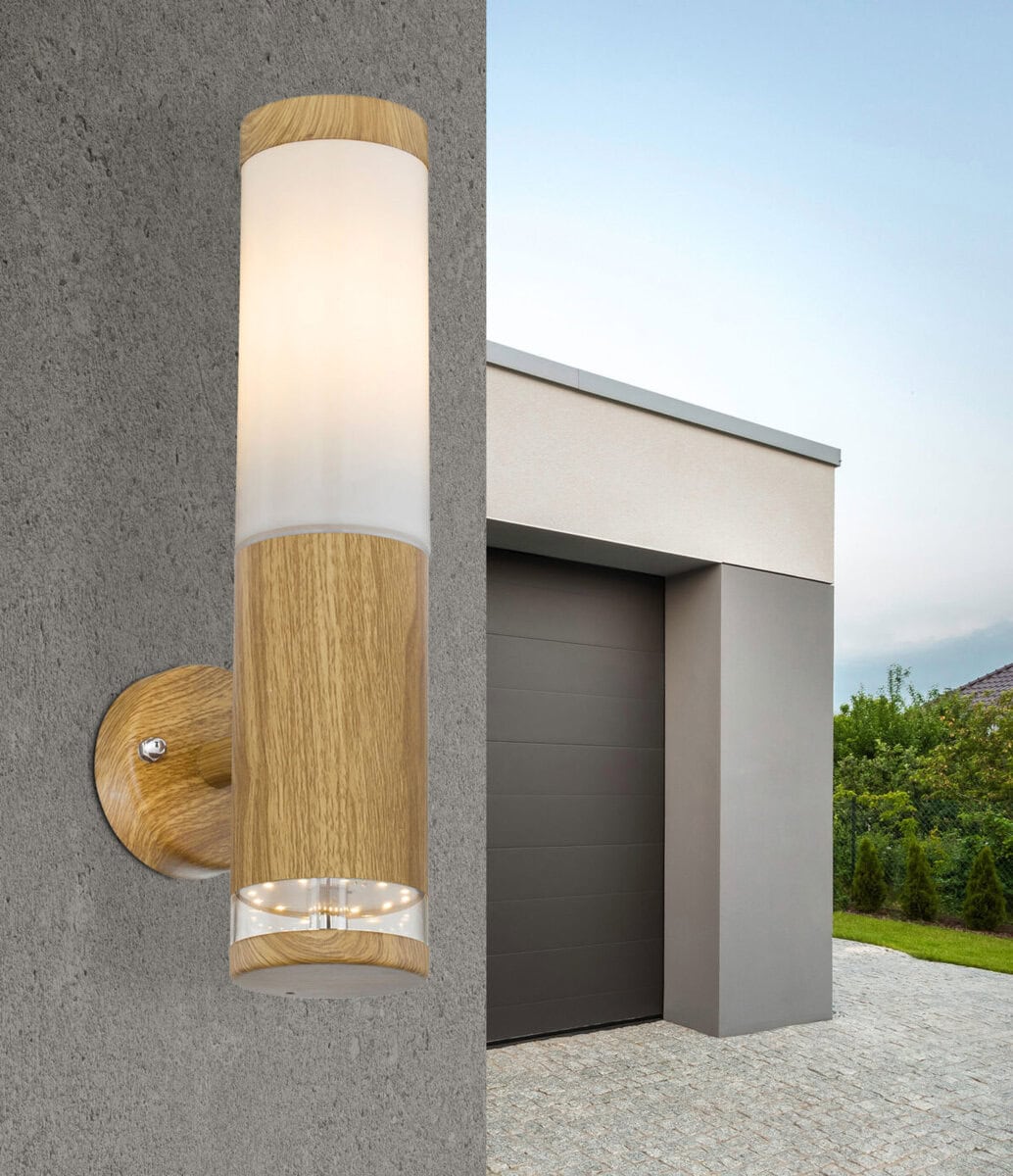 Ova vanjska zidna lampa iz Jaicy serije uvjerava svojim elegantnim dizajnom od nehrđajućeg čelika u izgledu drveta. Vanjska svjetiljka veličine 35 cm sastoji se od cilindričnog cilindra od nehrđajućeg čelika, koji je postoljem pričvršćen na zid i na donjem kraju ima prozirni plastični prsten. Cilindar se može opremiti i sa E27 LED sijalicom po vašem izboru, koja je zatim prekrivena opal plastikom. Ovo vam daje priliku da individualno odredite boju svjetla i svjetlinu. Sa drugim modelima iste serije možete stvoriti atmosferski ambijent u svom vanjskom prostoru.