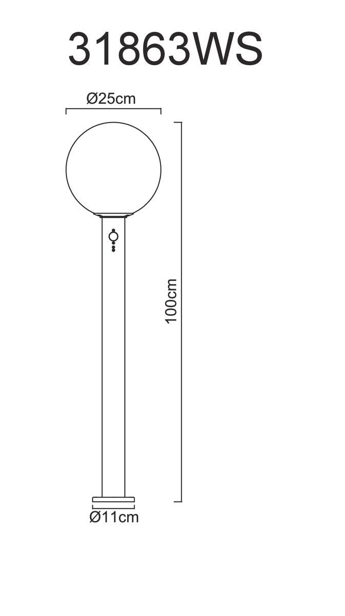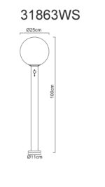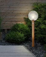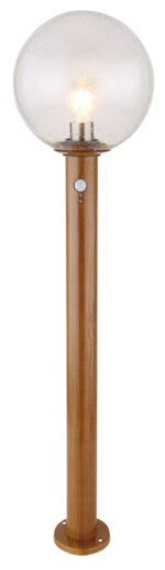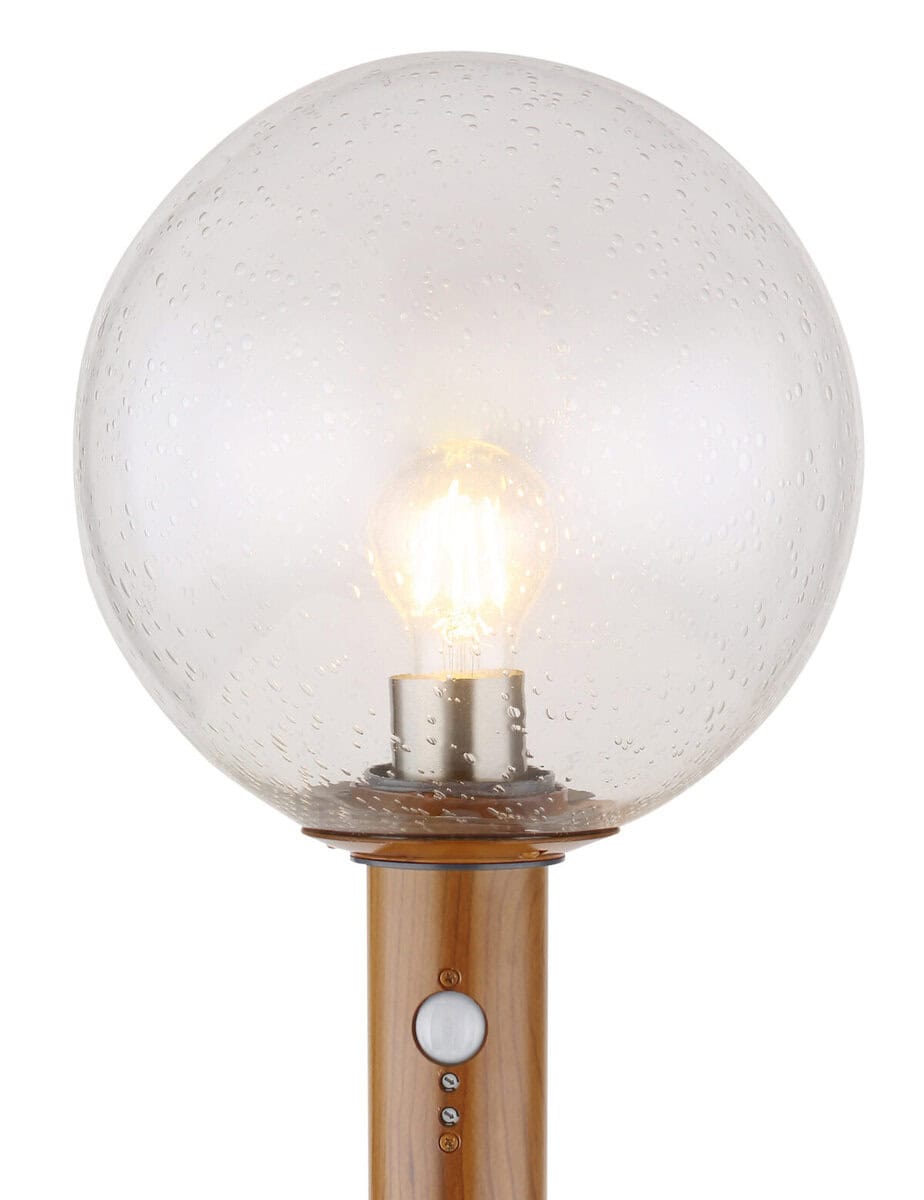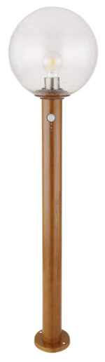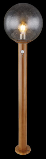 Ova vanvremenska vanjska lampa (Ø25cm) serije Ossy idealna je sa visinom od 100cm kao podna lampa u vanjskom prostoru i čini odličnu cjelokupnu sliku zbog svog prekrasnog izgleda drveta. Iz cilindričnog tijela u prekrasnom izgledu drveta viri E27 LED utičnica koja se može opremiti sijalicom po vašem izboru, do maksimalne snage 15 vati, i opremljena je detektorom pokreta (0-7m/90°). Sferni stakleni ekran sa mjehurićima pokriva E27 LED utičnicu i pruža zaštitu od prskanja vode.