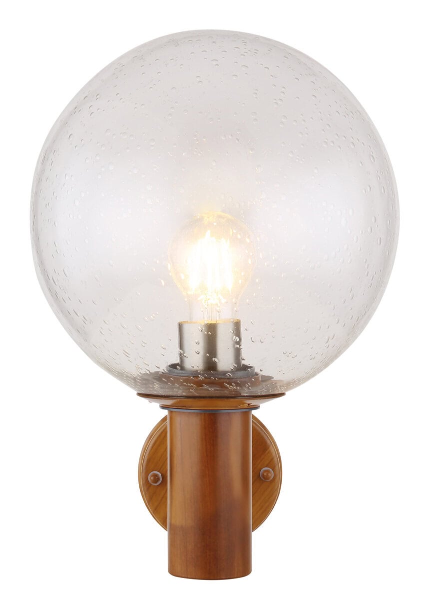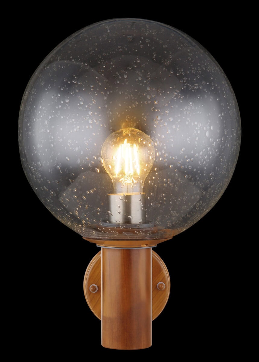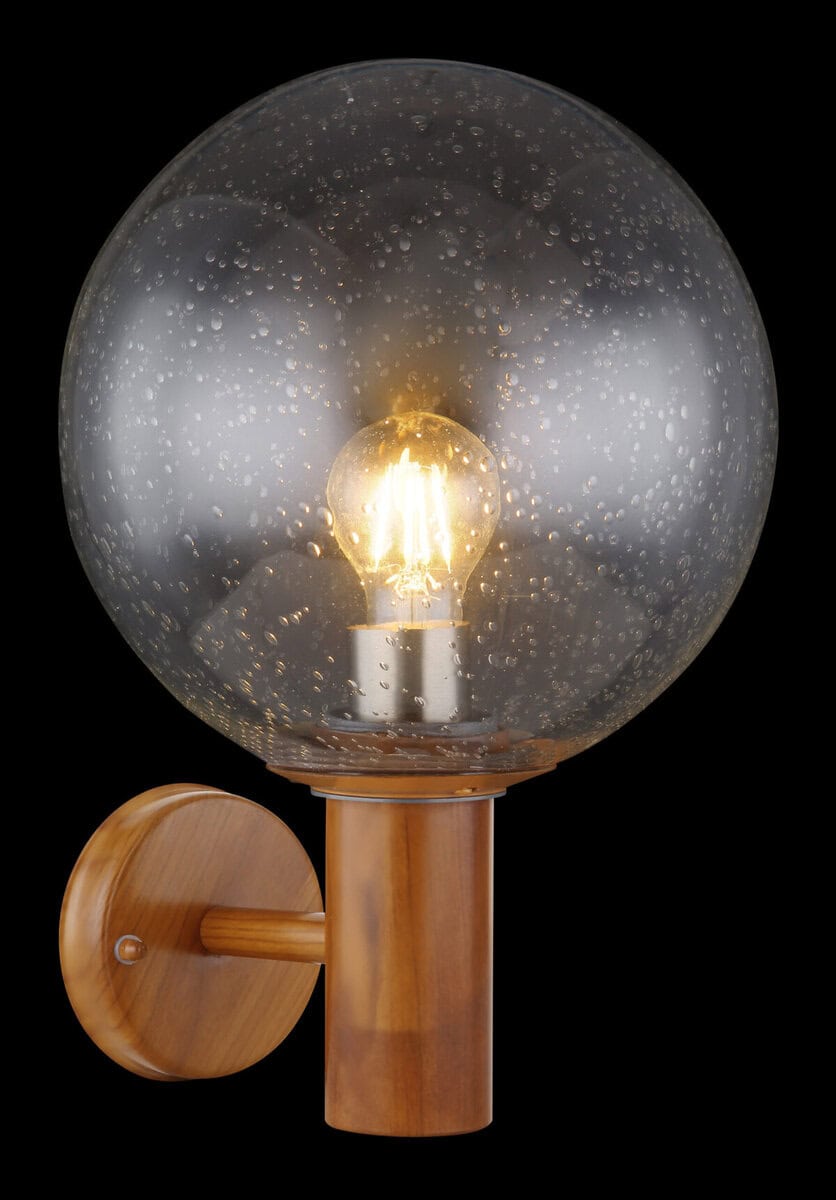 Ova vanvremenska vanjska lampa (Ø25cm) serije Ossy idealna je kao vanjska zidna lampa i čini odličnu cjelokupnu sliku zahvaljujući svom prekrasnom izgledu drveta. Iz cilindričnog tijela u prekrasnom izgledu drveta viri E27 LED utičnica koja se može opremiti sijalicom po vašem izboru, do maksimalne snage 15 vati. Sferni stakleni ekran sa mjehurićima pokriva E27 LED utičnicu i pruža zaštitu od prskanja vode.