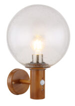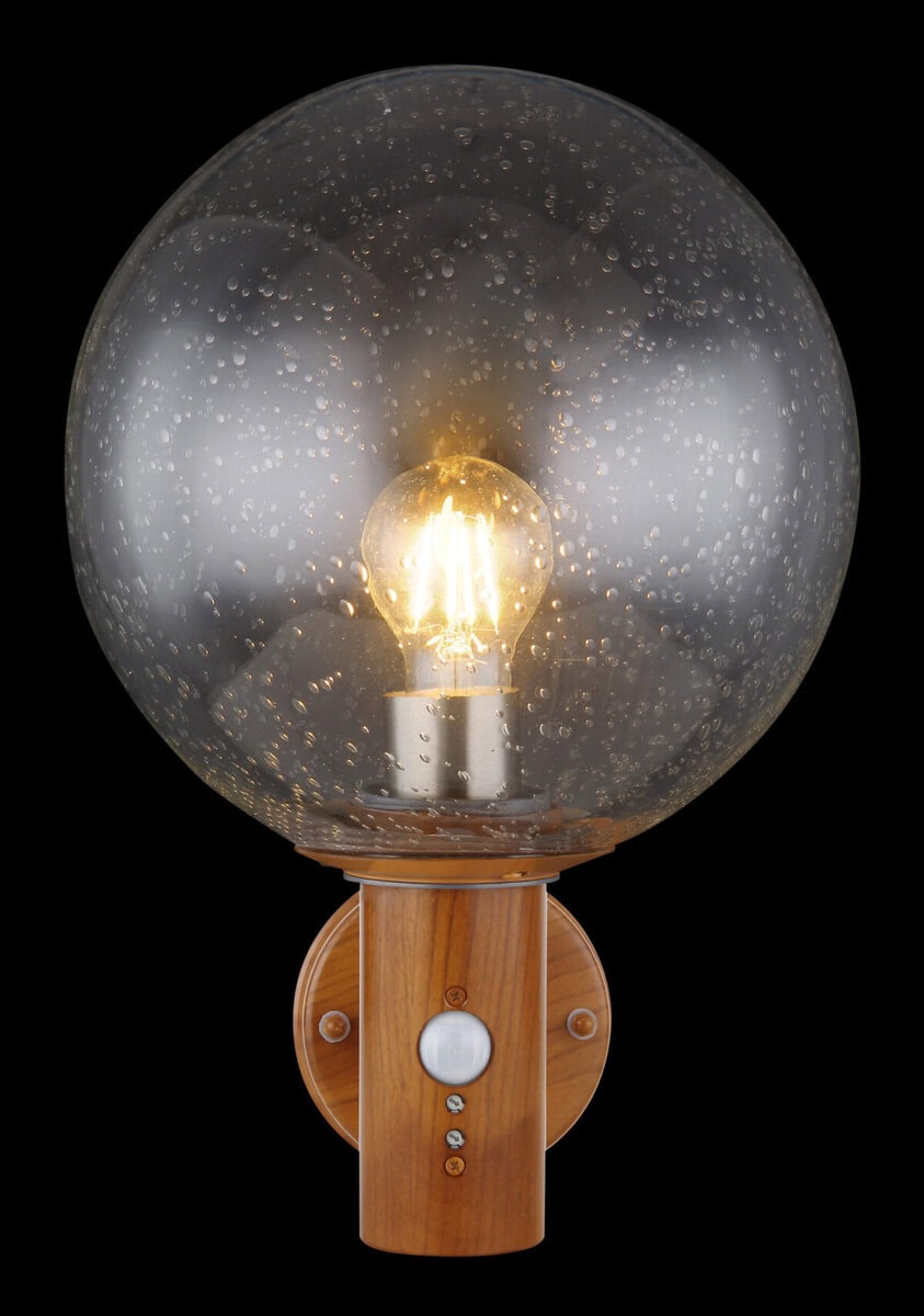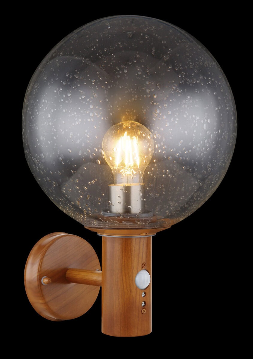 Ova vanvremenska vanjska lampa (Ø25cm) serije Ossy idealna je kao vanjska zidna lampa i čini odličnu cjelokupnu sliku zahvaljujući svom prekrasnom izgledu drveta. Iz cilindričnog tijela u prekrasnom izgledu drveta viri E27 LED utičnica koja se može opremiti sijalicom po vašem izboru, do maksimalne snage 15 vati, i opremljena je detektorom pokreta (0-7m/90°). Sferni stakleni ekran sa mjehurićima pokriva E27 LED utičnicu i pruža zaštitu od prskanja vode.