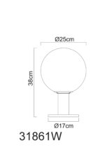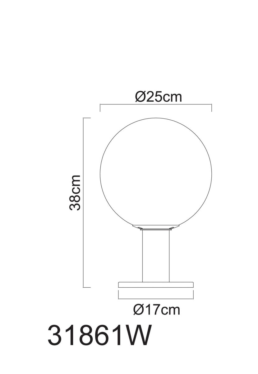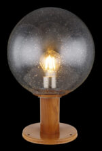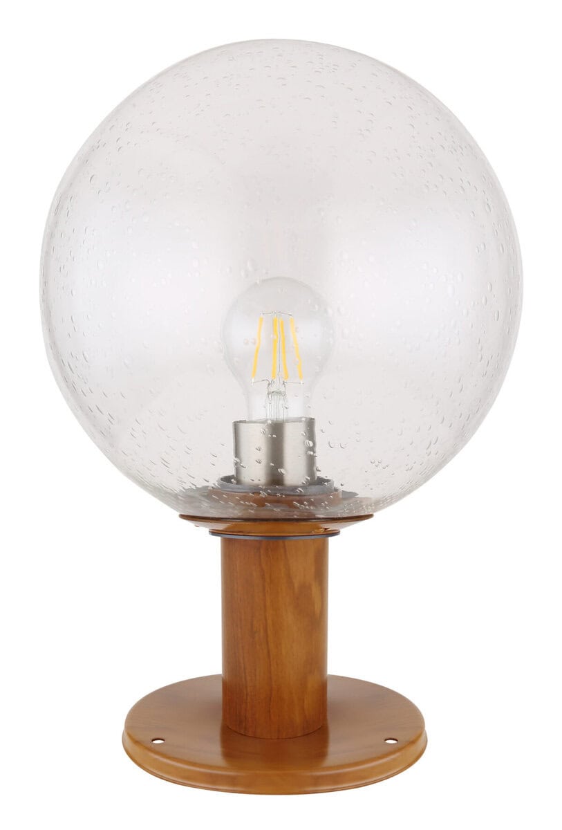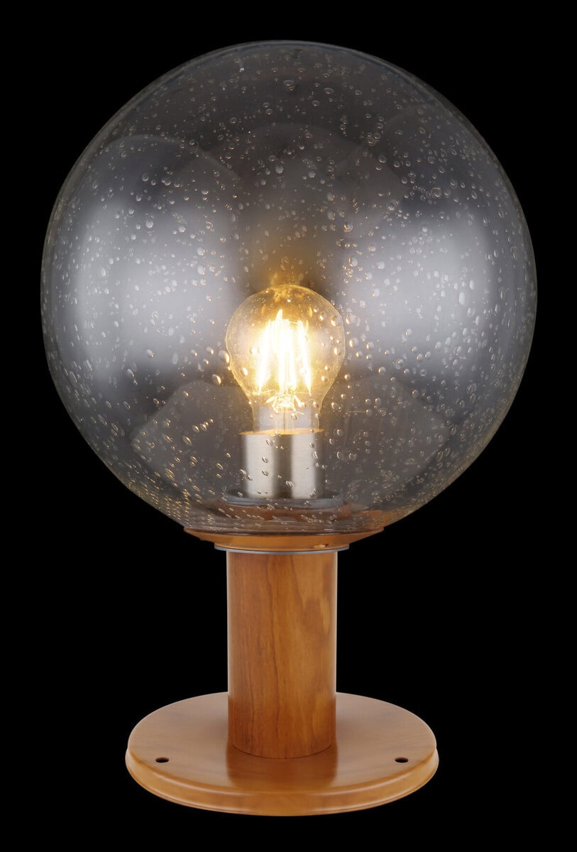 Ova vanvremenska vanjska lampa (Ø25cm) serije Ossy idealna je sa visinom od 38cm kao podna lampa u vanjskom prostoru i čini odličnu cjelokupnu sliku zahvaljujući svom prekrasnom izgledu drveta. Iz cilindričnog tijela u prekrasnom izgledu drveta viri E27 LED utičnica koja se može opremiti sijalicom po vašem izboru, do maksimalne snage 15 vati. Sferni stakleni ekran sa mjehurićima pokriva E27 LED utičnicu i pruža zaštitu od prskanja vode.