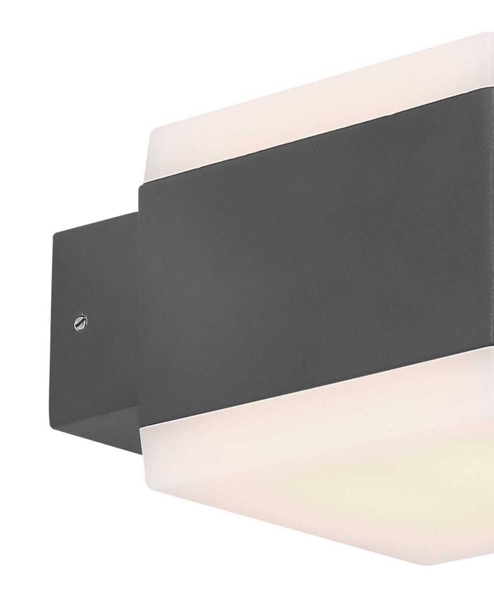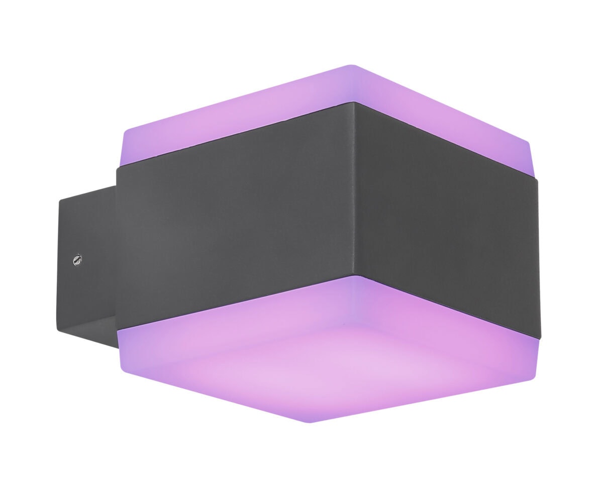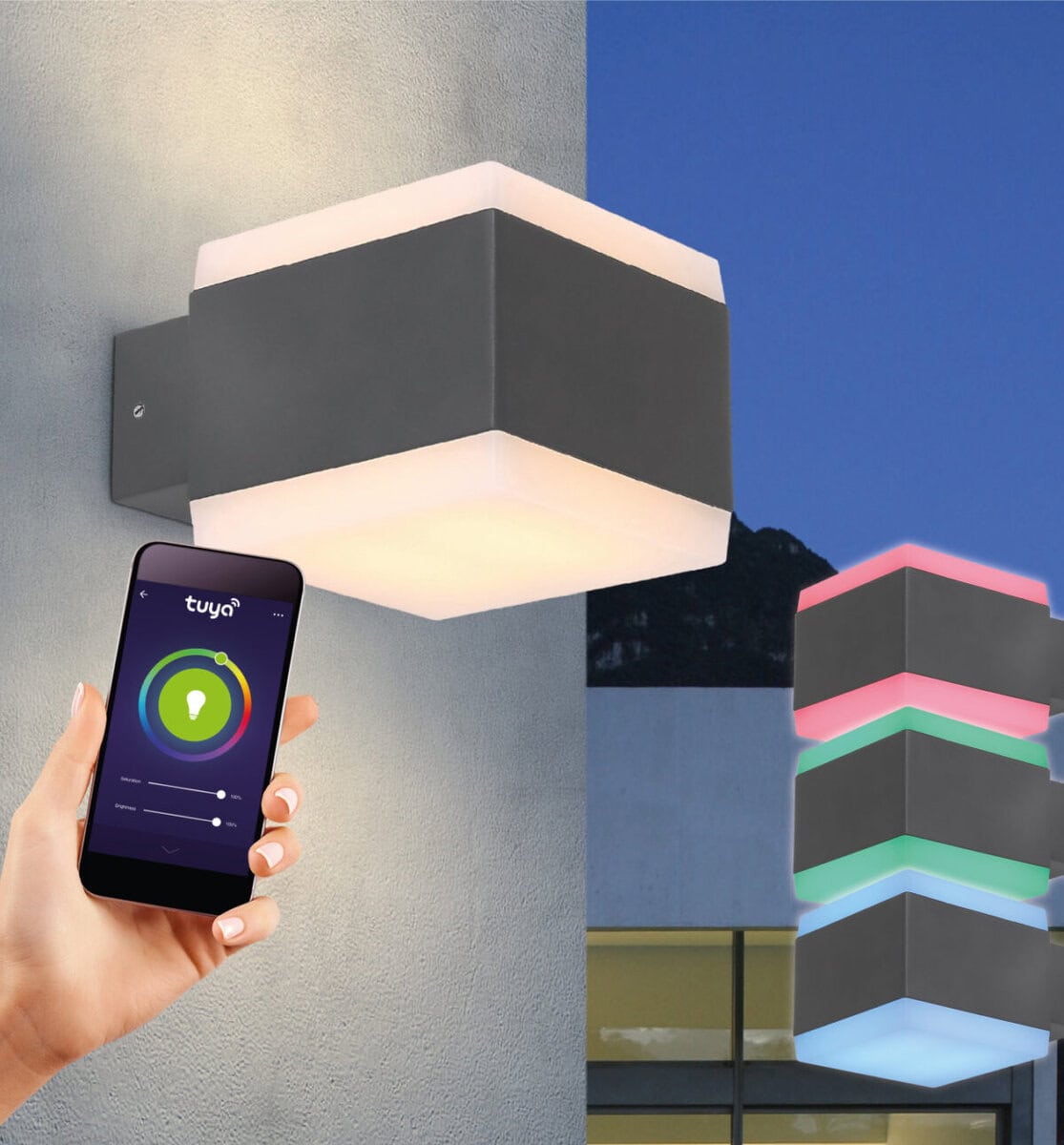 Ova klasična vanjska lampa SLICE (11 x 9 cm) izrađena od aluminija u boji antracita sa opalno bijelim plastičnim staklenim rezovima sa performansama i funkcionalnošću. Zahvaljujući integrisanoj RGB LED sijalici od 15 Watt, ova vanjska lampa omogućava da vaša soba zablista u različitim bojama koje odgovaraju raspoloženju. Ova lampa sa mogućnošću zatamnjivanja ima maksimalnu snagu od 650 lumena. Željena boja svjetla može se promijeniti i fiksirati iz tople bijele 3000 Kelvina do hladno bijele 6500 Kelvina. Ova svjetleća zidna lampa koja svijetli prema gore ili prema dolje je idealna za upotrebu na otvorenom zahvaljujući stepenu zaštite IP44. Ovom Smartlight lampom se lako može upravljati pomoću aplikacije Tuya Smart (Android TM/IOS). Upravljanje glasom je jednostavno uz Amazon Echo Tm i Google Home.