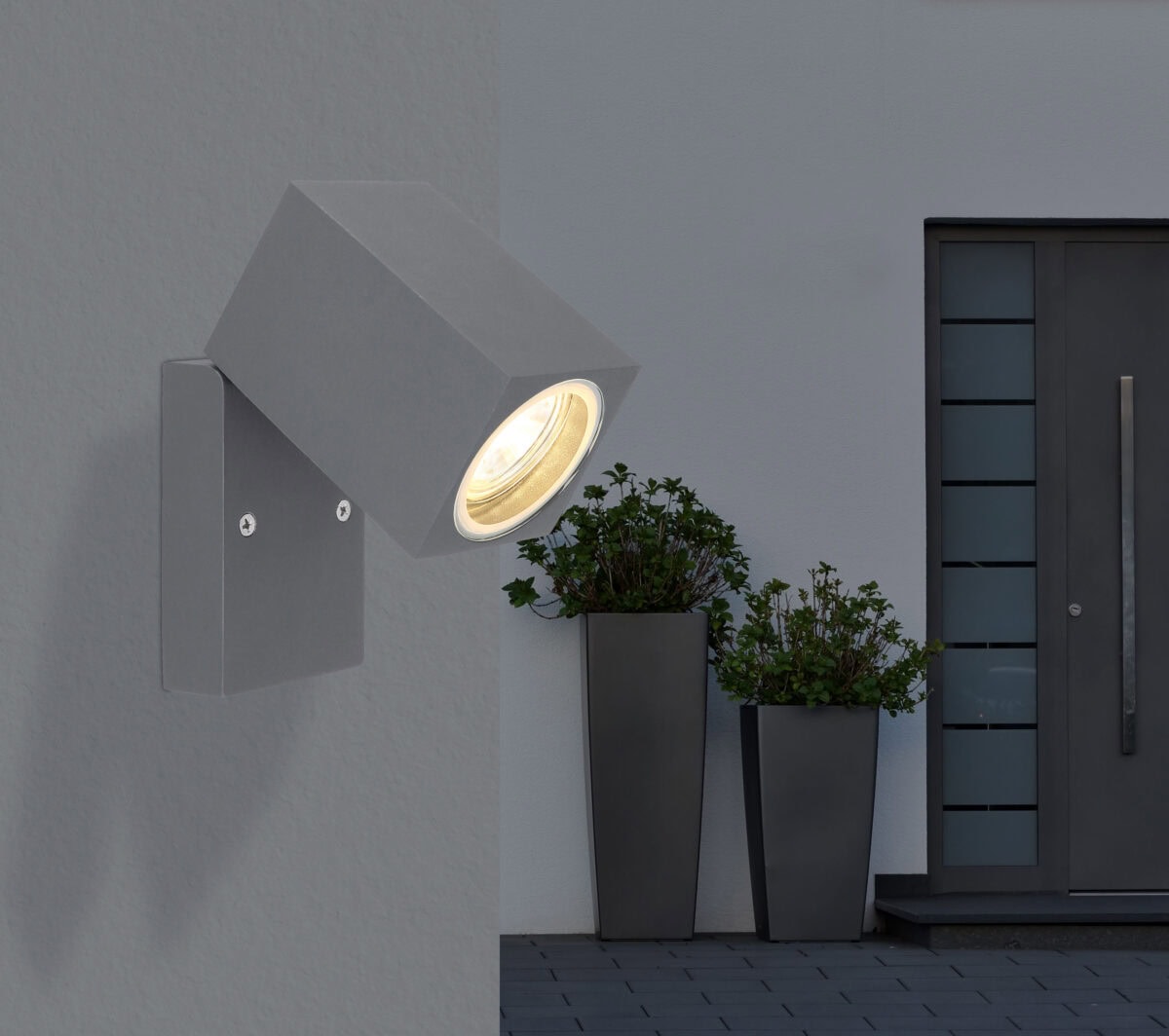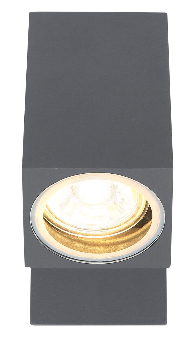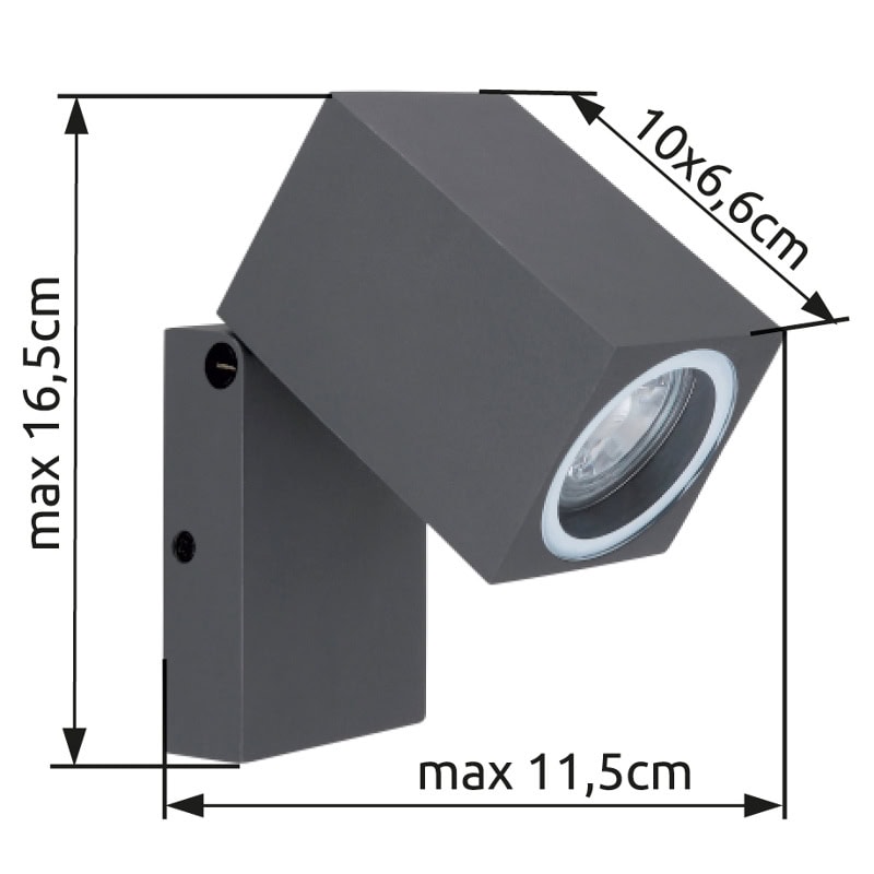 Ova moderna vanjska zidna lampa iz serije Veronika impresionira svojim jednostavnim dizajnom od livenog aluminijuma u boji antracita. Vanjska svjetiljka od 16,5 cm sastoji se od aluminijske ploče na koju je pričvršćen okretni aluminijski kvadar. Ovo se može opremiti sa GU10 sijalicom po vašem izboru, koja se zatim prekriva prozirnim staklom. Ovo vam daje priliku da individualno odredite boju svjetla i svjetlinu. Uz druge modele iste serije, možete elegantno urediti svoj vanjski prostor i upotpuniti cjelokupnu sliku.