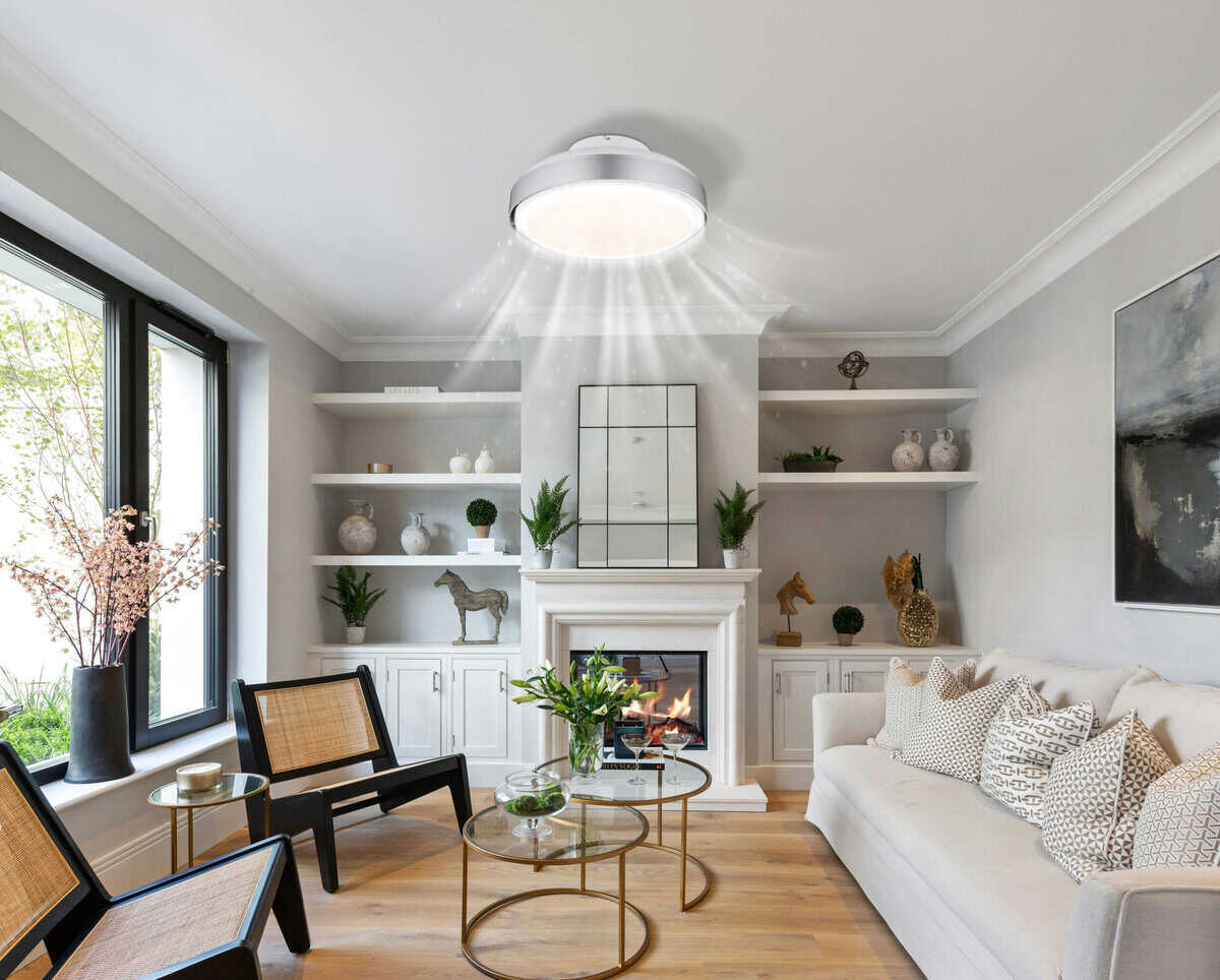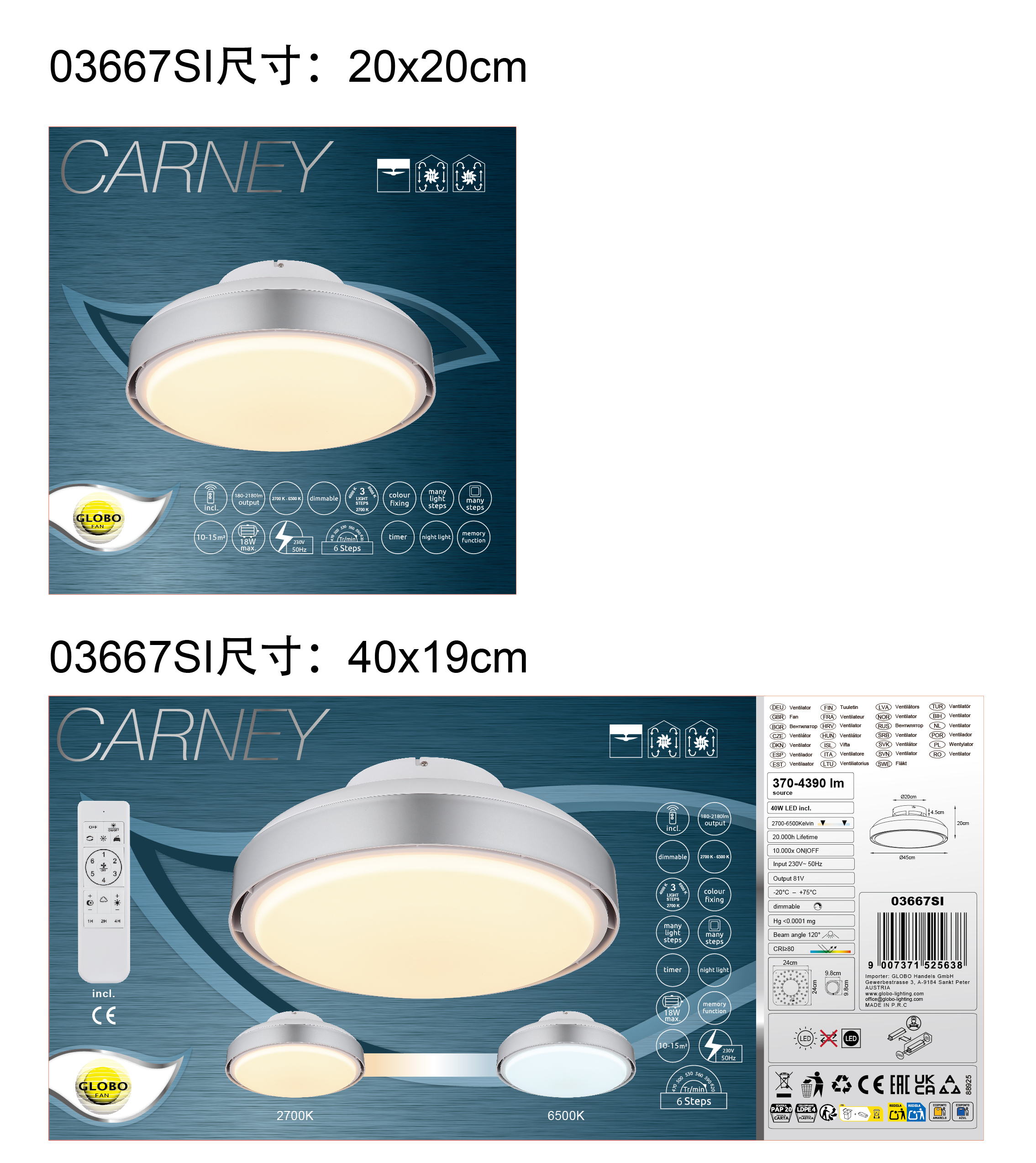 Okrugli CARNEY stropni ventilator impresionira svojim jasnim dizajnerskim jezikom i modernom tehnologijom. Njegovo tijelo izrađeno od mat bijele plastike i sjenilo od mat ABS-a u srebrnoj boji sa opal bijelim akrilom osiguravaju moderan izgled koji se skladno uklapa u savremene koncepte življenja. Opremljen integrisanim LED osvetljenjem, CARNEY nudi kontinuirano prigušivanje i podesivu temperaturu boje od 2700 K do 6500 K – od toplog svetla za prijatne večeri do hladnog svetla za koncentrisani rad. Funkcija memorije čuva posljednju odabranu postavku, dok boje koje se mogu popraviti stvaraju individualna svjetlosna raspoloženja. Uključeni daljinski upravljač omogućava praktičnu kontrolu svjetlosti i cirkulacije zraka. Bilo kao elegantno rješenje za rasvjetu ili efikasan ventilator – CARNEY kombinira obje funkcije u elegantnom dizajnu. Savršeno za sve koji traže udobnost i estetiku u jednom.